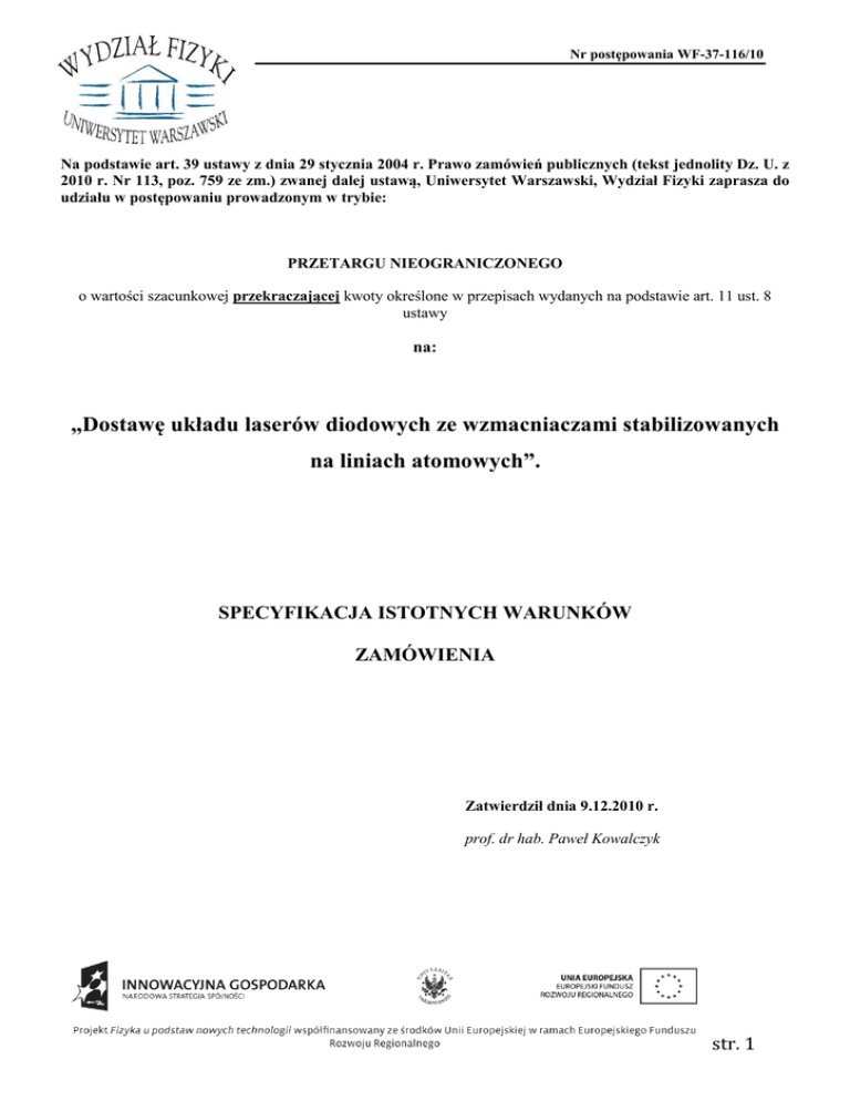 Nr postępowania WF-37-116/10 Na podstawie art. 39 ustawy z dnia 29 stycznia 2004 r. Prawo zamówień publicznych (tekst jednolity Dz. U. z 2010 r. Nr 113, poz. 759 ze zm.) zwanej dalej ustawą, Uniwersytet Warszawski, Wydział Fizyki zaprasza do udziału w postępowaniu prowadzonym w trybie: PRZETARGU NIEOGRANICZONEGO o wartości szacunkowej przekraczającej kwoty określone w przepisach wydanych na podstawie art. 11 ust. 8 ustawy na: „Dostawę układu laserów diodowych ze wzmacniaczami stabilizowanych na liniach atomowych”. SPECYFIKACJA ISTOTNYCH WARUNKÓW ZAMÓWIENIA Zatwierdził dnia 9.12.2010 r. prof. dr hab. Paweł Kowalczyk str. 1 Nr postępowania WF-37-116/10 SPECYFIKACJA ISTOTNYCH WARUNKÓW ZAMÓWIENIA (SIWZ) WRAZ Z ZAŁĄCZNIKAMI 1. ZAMAWIAJĄCY: Nazwa: Uniwersytet Warszawski, Wydział Fizyki Adres: ul. Hoża 69, 00-681 Warszawa Tel. /fax (0 22) 55 32 213 NIP 525-001-12-66 REGON 000001258 www.uw.edu.pl ; www.fuw.edu.pl zwany dalej ZAMAWIAJĄCYM, reprezentowany przez prof. dr hab. Pawła Kowalczyka, pracownika Wydziału Fizyki UW, pełniącego rolę Kierownika Pracowni Ultrazimnych Cząsteczek w projekcie PO IG 02.01.00-14122/09 „Fizyka u podstaw nowych technologii – rozwój nowoczesnej infrastruktury badawczej na Wydziale Fizyki Uniwersytetu Warszawskiego" na podstawie Upoważnienia Jej Magnificencji Rektor Uniwersytetu Warszawskiego z dnia 2 marca 2010r. zaprasza do udziału w postępowaniu o udzielenie zamówienia publicznego, prowadzonego w trybie przetargu nieograniczonego na: Dostawę układu laserów diodowych ze wzmacniaczami stabilizowanych na liniach atomowych. Przedmiot zamówienia jest częścią projektu nr POIG.02.01.00-14-122/09, „Fizyka u podstaw nowych technologii – rozwój nowoczesnej infrastruktury badawczej na Wydziale Fizyki Uniwersytetu Warszawskiego”, współfinansowany przez Unię Europejską ze środków Europejskiego Funduszu Rozwoju Regionalnego i realizowanego w ramach Programu Operacyjnego „Innowacyjna Gospodarka 2007-2013”, Priorytet 2, „Infrastruktura sfery B + R”, Działanie 2.1 „Rozwój Ośrodków O Wysokim Potencjale Badawczym”. 2. OPIS PRZEDMIOTU ZAMÓWIENIA KOD CPV: 38636100-3 -Lasery 2.1 Przedmiotem zamówienia jest: Dostawa układu laserów diodowych ze wzmacniaczami stabilizowanych na liniach atomowych. Delivery of a system of diode lasers with amplifiers stabilized on atomic lines. Część I - Zestaw, którego elementem zasadniczym są lasery diodowe, wraz z urządzeniami służącymi do ich zasilenia, zapewnienia warunków stabilnej częstotliwościowo generacji promieniowania, jego wzmocnienia, pomiaru częstości, o parametrach minimalnych wyspecyfikowanych poniżej A system based on diode lasers, with equipment for power supplying, stabilization of laser frequencies, amplification of laser beams, frequency measurement, with minimum parameters specified below. Część II - Przyrządy pomocnicze wymagane do użytkowania układu laserów diodowych, urządzenia do instalacji laserów, ich obsługi i utrzymania w gotowości do pracy. Auxiliary equipment required for operation of the diode laser system, equipment for installation of lasers and maintenance in readiness to work. 2.2 Szczegółowy opis przedmiotu zamówienia Część I Zestaw, którego elementem zasadniczym są lasery diodowe, wraz z urządzeniami służącymi do ich zasilenia, zapewnienia warunków stabilnej częstotliwościowo generacji promieniowania, jego wzmocnienia, pomiaru częstości, o parametrach minimalnych wyspecyfikowanych poniżej. str. 2 Nr postępowania WF-37-116/10 A system based on diode lasers, with equipment for power supplying, stabilization of laser frequencies, amplification of laser beams, frequency measurement, with minimum parameters specified below. 1. Układ lasera diodowego ze wzmacniaczem typu "tapered" do pracy na długości fali ok. 766.5 nm (linia rezonansowa D2 potasu) – 2 sztuki Diode laser system with a tapered amplifier operating on wavelength ca. 766.7 nm (resonance D2 line of potassium) – 2 pieces konfiguracja MOPA (Master Oscillator Power Amplifier) moc za wyjsciowym izolatorem optycznym co najmniej 1.2W i szerokość linii <1MHz, pożądana 100 kHz/5 μs na długości fali 767.7 nm zakres strojenia lasera "master" (bez justowania) co najmniej 760 – 770 nm zakres przestrajalności bez przeskoków modów >30 GHz wysoka stabilność akustyczna rezonatora lasera master z zewnętrzną siatką dyfrakcyjną, częstość rezonansu >4kHz tłumienie wzmocnionej emisji spontanicznej (ASE) co najmniej -35dB polaryzacja wiązki laserowej co najmniej 100:1 jakość wiązki M2 < 1.5, wydajność wprowadzenia wiązki do światłowodu jednomodowego >50% rozbieżność wiązki < 1 mrad zawiera izolator optyczny pomiędzy laserem "master" i wzmacniaczem, minimalne tłumienie 60 dB zawiera izolator optyczny na wyjściu wiązki laserowej, minimalne tłumienie 60 dB zawiera system zwierciadeł zapewniający precyzyjne sprzężenie lasera master i wzmacniacza w granicy strojenia diody laserowej (wyspecyfikowanego w danych technicznych lasera) możliwość justowania zwierciadeł przy zamkniętej obudowie możliwość łatwej wymiany modułu wzmacniacza wraz ze zjustowanym układem optycznym wiązka laserowa jest podzielona pomiędzy MOPA configuration (Master Oscillator Power Amplifier) minimum laser power behind output isolator 1.2W, minimum linewidth <1MHz, preferable 100 kHz/5 μs, both @ 767.7 nm Alignment free coarse tuning of master laser over range at least 760 – 770 nm Mode-hop free tuning range >30GHz high acoustic stability of external grating master resonator, resonance frequency > 4kHz ASE suppression at least -35dB polarization of the output laser beam at least 100:1 beam quality M2 < 1.5, coupling efficiency into single mode fiber >50% divergence < 1 mrad contains optical isolator placed between the master and the amplifier, minimum extinction ratio 60 dB contains output optical isolator, minimum extinction ra