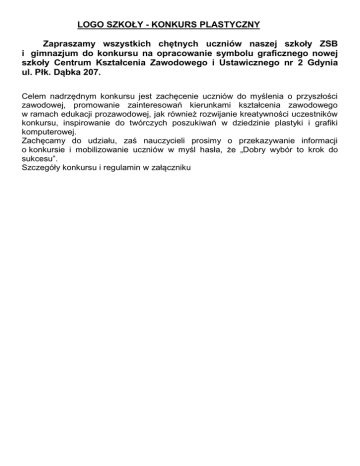 LOGO SZKOŁY - KONKURS PLASTYCZNY Zapraszamy wszystkich chętnych uczniów naszej szkoły ZSB i gimnazjum do konkursu na opracowanie symbolu graficznego nowej szkoły Centrum Kształcenia Zawodowego i Ustawicznego nr 2 Gdynia ul. Płk. Dąbka 207. Celem nadrzędnym konkursu jest zachęcenie uczniów do myślenia o przyszłości zawodowej, promowanie zainteresowań kierunkami kształcenia zawodowego w ramach edukacji prozawodowej, jak również rozwijanie kreatywności uczestników konkursu, inspirowanie do twórczych poszukiwań w dziedzinie plastyki i grafiki komputerowej. Zachęcamy do udziału, zaś nauczycieli prosimy o przekazywanie informacji o konkursie i mobilizowanie uczniów w myśl hasła, że „Dobry wybór to krok do sukcesu”. Szczegóły konkursu i regulamin w załączniku KONKURS PLASTYCZNY dla uczniów Drodzy uczniowie! Chodząc do szkoły macie marzenia o przyszłym zawodzie. Spróbujcie odpowiedzieć sobie na poniższe zdania: - Najbardziej podoba mi się zawód... - Marzę o tym by zostać... - Lubię zawód... - w Gdyni zawodu możemy uczyć się również w …… ….nowopowstających CKZiU. W związku z powyższym serdecznie zapraszamy do uczestnictwa w międzyszkolnym konkursie plastycznym: "LOGO CKZiU Nr 2 - nowej szkoły zawodowej" Serdecznie zapraszamy do wzięcia udziału w międzyszkolnym Konkursie plastycznym: "LOGO CKZiU Nr 2 - nowej szkoły zawodowej" Do wzięcia udziału zaprasza organizator Komisja Konkursowa Zespołu Szkół Budowlanych w Gdyni REGULAMIN KONKURSU PLASTYCZNEGO "LOGO CKZiU Nr 2 - nowej szkoły zawodowej" Przedmiotem prac plastycznych powinien być graficzny symbol (logo) nowej szkoły. I Organizator konkursu 1. Organizatorem konkursu jest Komisja Konkursowa powołana przez Dyrektora Zespołu Szkół Budowlanych w Gdyni, ul. Tetmajera 65. 2. Konkurs adresowany jest do uczniów naszej szkoły i szkół gimnazjalnych z województwa pomorskiego. II Cel i przedmiot konkursu 1. Celem konkursu jest wyłonienie najlepszego graficznego symbolu (logo) dla Centrum Kształcenia Zawodowego i Ustawicznego nr 2 w Gdyni ul Płk. Dąbka 207 2. Logo wykorzystywane będzie przez Centrum Kształcenia Zawodowego i Ustawicznego nr 2 do celów identyfikacyjnych, reklamowych, korespondencyjnych i promocyjnych Szkoły 3. Promowanie wśród uczniów zainteresowań kierunkami kształcenia zawodowego w ramach edukacji prozawodowej. 4. Propagowanie plastyki, jako formy spędzania wolnego czasu. 5. Rozwijanie kreatywności uczestników konkursu, inspirowanie do twórczych poszukiwań w dziedzinie plastyki i grafiki komputerowej. 6. Kształtowanie i rozwijanie wśród uczestników zdolności artystycznych. III Forma prezentacji pracy konkursowej 1. Logo powinno charakteryzować się następującymi kryteriami: - zgodność projektu z danymi szkoły - oryginalność znaku, łatwość zapamiętania - czytelność i funkcjonalność projektu - estetyka wykonania projektu. 2. Przedmiotem oceny są prace plastyczne. 3. Wymagania dotyczące prac plastycznych: format A4, technika dowolna (może być projekt komputerowy), każdy uczestnik może zgłosić do konkursu jedną pracę, podpisaną imiennie, do prac / y należy dołączyć kartę zgłoszenia do konkursu –załącznik nr 1 w przypadku projektu opracowanego komputerowo projekt loga należy również przesłać na płycie CD / DVD, z: zapisem wektorowym logotypu (preferowany format SVG) zapisem logotypu w plikach o rozszerzeniach: PDF 300dpi, TIFF 300 dpi, JPD 300dpi. IV Kryteria oceny prac konkursowych Powołane przez organizatora jury oceni prace biorąc pod uwagę następujące kryteria: zgodność projektu z danymi szkoły estetykę pracy, czytelność, funkcjonalność projektu, łatwość zapamiętania, pomysłowość i oryginalne ujęcie tematu. Decyzje jury są ostateczne. V Miejsce i termin składania prac konkursowych Prace konkursowe należy przysłać pocztą lub dostarczyć osobiście na adres: Zespół Szkół Budowlanych ul. Tetmajera 65, 81-421 Gdynia lub na adres e-mailowy szkoły: [email protected] z dopiskiem / tematem: Konkurs plastyczny. Organizator nie zwraca prac. Prace należy złożyć w terminie do dnia 20 maja 2016 r.. Liczy się data wpływu do ZSB. VI .Rozstrzygnięcie konkursu i nagrody 1. Wyniki konkursu zostaną ogłoszone do 03 czerwca 2016 r. na stronie internetowej Zespołu Szkół Budowlanych - www.zsb.gdynia.pl. 2. O wygranej osoby nagrodzone zostaną poinformowane przez ZSB w Gdyni również telefonicznie lub e-mailem. 3. Zależnie od liczby nadesłanych prac nagrody i wyróżnienia zostaną przesłane pocztą lub wręczone w ZSB na wystawie pokonkursowej do 24 czerwca 2016 r.. 4. Organizatorzy zapewniają nagrody za 3 pierwsze miejsca. 5. Wszyscy finaliści konkursu oraz ich opiekunowie zostaną uhonorowani dyplomami. VIII Postanowienia końcowe: 1. Nadesłanych prac nie zwracamy - po rozstrzygnięciu konkursu przechodzą one na własność organizatora konkursu (ZSB). 2. Organizator zastrzega sobie prawo do odwołania konkursu z przyczyn niezależnych od niego. 3. Prace nieopisane, a także wykonane niezgodnie z regulaminem nie wezmą udziału w konkursie. 4. Nadesłanie prac jest jednoznaczne z akceptacją regulaminu i wyrażeniem zgody na przetwarzanie danych osobowych ucznia przez jego opiekunów prawnych oraz ze zgodą na nieodpłatne wykorzystanie prac w formie publikacji pokonkursowych. 5. Nagrodzone prace www.zsb.gdynia.pl. zostaną opublikowane na stronie organizatora 6. Pytania i uwagi dotyczące konkursu kierować na adres: [email protected]. Załączniki Załącznik nr 1 – karta zgłoszenia do konkursu - Załącznik nr 1 KARTA ZGŁOSZENIA DO KONKURSU MIĘDZYSZKOLNY KONKURS PLASTYCZNY "LOGO CKZiU Nr 2 - nowej szkoły zawodowej" Edycja 2015 / 2016 PROSZĘ WYPEŁNIĆ DRUKOWANYMI LITERAMI LUB KOMPUTEROWO DANE SZKOŁY Nazwa szkoły Ulica Kod i miejscowość Nr telefonu do szkoły Adres e-mail NAUCZYCIEL ODPOWIADAJĄCY ZA KONKURS W SZKOLE* Imię i nazwisko Nr telefonu A