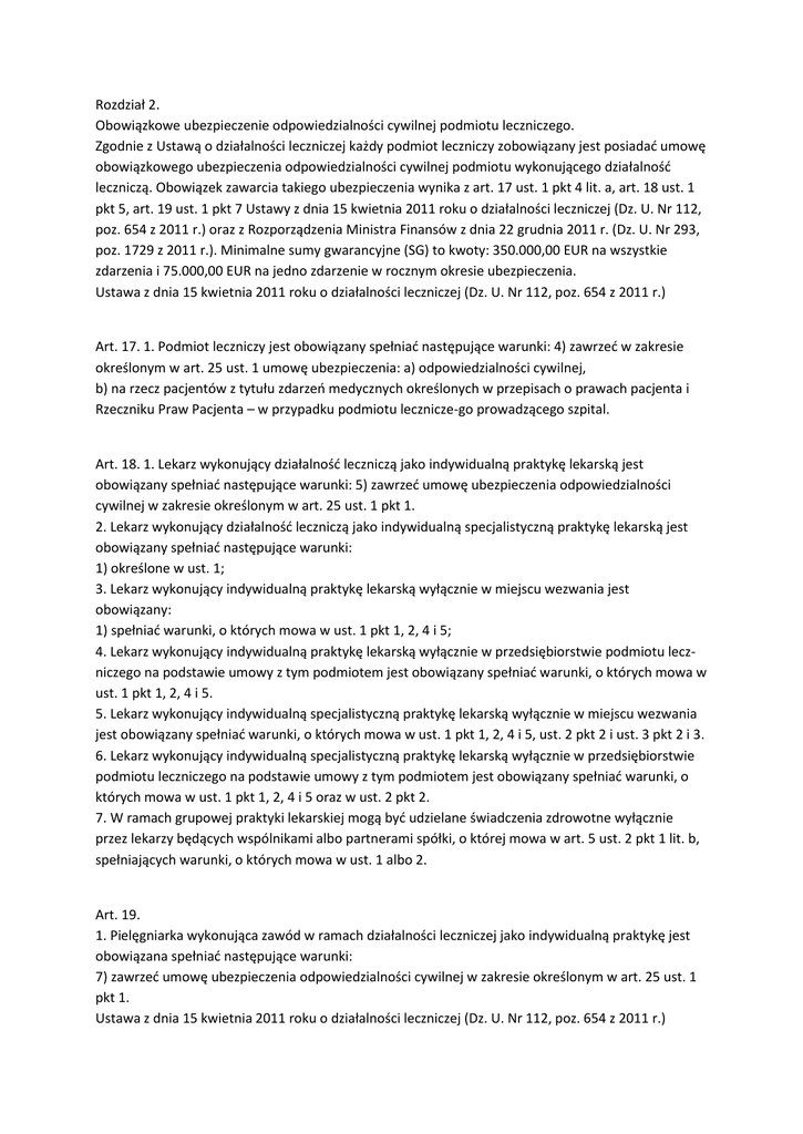 Rozdział 2. Obowiązkowe ubezpieczenie odpowiedzialności cywilnej podmiotu leczniczego. Zgodnie z Ustawą o działalności leczniczej każdy podmiot leczniczy zobowiązany jest posiadać umowę obowiązkowego ubezpieczenia odpowiedzialności cywilnej podmiotu wykonującego działalność leczniczą. Obowiązek zawarcia takiego ubezpieczenia wynika z art. 17 ust. 1 pkt 4 lit. a, art. 18 ust. 1 pkt 5, art. 19 ust. 1 pkt 7 Ustawy z dnia 15 kwietnia 2011 roku o działalności leczniczej (Dz. U. Nr 112, poz. 654 z 2011 r.) oraz z Rozporządzenia Ministra Finansów z dnia 22 grudnia 2011 r. (Dz. U. Nr 293, poz. 1729 z 2011 r.). Minimalne sumy gwarancyjne (SG) to kwoty: 350.000,00 EUR na wszystkie zdarzenia i 75.000,00 EUR na jedno zdarzenie w rocznym okresie ubezpieczenia. Ustawa z dnia 15 kwietnia 2011 roku o działalności leczniczej (Dz. U. Nr 112, poz. 654 z 2011 r.) Art. 17. 1. Podmiot leczniczy jest obowiązany spełniać następujące warunki: 4) zawrzeć w zakresie określonym w art. 25 ust. 1 umowę ubezpieczenia: a) odpowiedzialności cywilnej, b) na rzecz pacjentów z tytułu zdarzeń medycznych określonych w przepisach o prawach pacjenta i Rzeczniku Praw Pacjenta – w przypadku podmiotu lecznicze-go prowadzącego szpital. Art. 18. 1. Lekarz wykonujący działalność leczniczą jako indywidualną praktykę lekarską jest obowiązany spełniać następujące warunki: 5) zawrzeć umowę ubezpieczenia odpowiedzialności cywilnej w zakresie określonym w art. 25 ust. 1 pkt 1. 2. Lekarz wykonujący działalność leczniczą jako indywidualną specjalistyczną praktykę lekarską jest obowiązany spełniać następujące warunki: 1) określone w ust. 1; 3. Lekarz wykonujący indywidualną praktykę lekarską wyłącznie w miejscu wezwania jest obowiązany: 1) spełniać warunki, o których mowa w ust. 1 pkt 1, 2, 4 i 5; 4. Lekarz wykonujący indywidualną praktykę lekarską wyłącznie w przedsiębiorstwie podmiotu leczniczego na podstawie umowy z tym podmiotem jest obowiązany spełniać warunki, o których mowa w ust. 1 pkt 1, 2, 4 i 5. 5. Lekarz wykonujący indywidualną specjalistyczną praktykę lekarską wyłącznie w miejscu wezwania jest obowiązany spełniać warunki, o których mowa w ust. 1 pkt 1, 2, 4 i 5, ust. 2 pkt 2 i ust. 3 pkt 2 i 3. 6. Lekarz wykonujący indywidualną specjalistyczną praktykę lekarską wyłącznie w przedsiębiorstwie podmiotu leczniczego na podstawie umowy z tym podmiotem jest obowiązany spełniać warunki, o których mowa w ust. 1 pkt 1, 2, 4 i 5 oraz w ust. 2 pkt 2. 7. W ramach grupowej praktyki lekarskiej mogą być udzielane świadczenia zdrowotne wyłącznie przez lekarzy będących wspólnikami albo partnerami spółki, o której mowa w art. 5 ust. 2 pkt 1 lit. b, spełniających warunki, o których mowa w ust. 1 albo 2. Art. 19. 1. Pielęgniarka wykonująca zawód w ramach działalności leczniczej jako indywidualną praktykę jest obowiązana spełniać następujące warunki: 7) zawrzeć umowę ubezpieczenia odpowiedzialności cywilnej w zakresie określonym w art. 25 ust. 1 pkt 1. Ustawa z dnia 15 kwietnia 2011 roku o działalności leczniczej (Dz. U. Nr 112, poz. 654 z 2011 r.) Art. 25. 1. Umowa ubezpieczenia: 1) odpowiedzialności cywilnej obejmuje szkody będące następstwem udzielania świadczeń zdrowotnych albo niezgodnego z prawem zaniechania udzielania świad-czeń zdrowotnych; 2) z tytułu zdarzeń medycznych określonych w przepisach o prawach pacjenta i Rzeczniku Praw Pacjenta obejmuje zdarzenia medyczne w rozumieniu tej ustawy, które miały miejsce w okresie ochrony ubezpieczeniowej. 1a. Suma ubezpieczenia w okresie ubezpieczenia nie dłuższym niż 12 miesięcy, w odniesieniu do wszystkich zdarzeń medycznych w szpitalu, których skutki są objęte umową ubezpieczenia, o której mowa w ust. 1 pkt 2, jest uzależniona od liczby łóżek w szpitalu i sumy ubezpieczenia w odniesieniu do jednego łóżka szpitalnego, oraz wynosi nie mniej niż 300 000 zł. 1b. Suma ubezpieczenia w odniesieniu do jednego łóżka szpitalnego wynosi nie mniej niż 1000 zł. 1c. Jeżeli podmiot leczniczy posiada certyfikat akredytacyjny w rozumieniu ustawy z dnia 6 listopada 2008 r. o akredytacji w ochronie zdrowia (Dz. U. z 2009 r. Nr 52, poz. 418 i Nr 76, poz. 641 oraz z 2011 r. Nr 112, poz. 654) w zakresie lecznictwa szpitalnego, suma ubezpieczenia w odniesieniu do jednego łóżka szpitalnego jest pomniejszana o 10%. 1d. Umowa ubezpieczenia, o której mowa w ust. 1 pkt 2, może być zawarta również z zastosowaniem: 1) zagregowanej franszyzy integralnej (oznaczającej łączną kwotę wszystkich świadczeń z tytułu zdarzeń medycznych, które miały miejsce w okresie ochrony ubezpieczeniowej, do której wyłączona jest odpowiedzialność ubezpieczyciela) w wysokości określonej w tej umowie, nie wyższej niż 50% sumy ubezpieczenia ustalonej w sposób określony w ust. 1a–1c, albo 2) proporcjonalnego udziału własnego podmiotu leczniczego w wysokości określonej w tej umowie, nie wyższej niż 50% sumy ubezpieczenia ustalonej w sposób określony w ust. 1a–1c. Dziennik Ustaw Nr 293 Poz. 1729 ROZPORZĄDZENIE MINISTRA FINANSÓW z dnia 22 grudnia 2011 r. w sprawie obowiązkowego ubezpieczenia odpowiedzialności cywilnej podmiotu wykonującego działalność leczniczą Na podstawie art. 25 ust. 5 ustawy z dnia 15 kwietnia 2011 r. o działalności leczniczej (Dz. U. Nr 112, poz. 654, Nr 149, poz. 887, Nr 174, poz. 1039 i Nr 185, poz. 1092) zarządza się, co następuje: § 1. Rozporządzenie określa szczegółowy zakres obowiązkowego ubezpieczenia odpowiedzialności cywilnej podmiotu wykonującego działalność leczniczą za szkody będące następstwem udzielania świadczeń zdrowotnych albo niezgodnego z prawem zaniechania udzielania świadczeń zdrowotnych, zwanego dalej „ubezpieczeniem OC”, oraz minimalną sumę gwarancyjną tego ubezpieczenia. § 2. 1. Ubezpieczeniem OC jest objęta odpowiedzialność cywilna podmiotu wyk