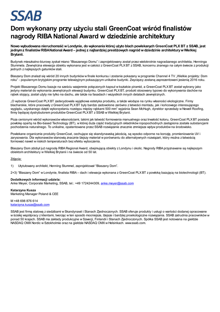 Dom wykonany przy użyciu stali GreenCoat wśród finalistów nagrody RIBA National Award w dziedzinie architektury Nowo wybudowana nieruchomość w Londynie, do wykonania której użyto blach powlekanych GreenCoat PLX BT z SSAB, jest jednym z finalistów RIBANational Award – jednej z najbardziej prestiżowych nagród w dziedzinie architektury w Wielkiej Brytanii. Budynek mieszkalno-biurowy zyskał miano “Blaszanego Domu” i zaprojektowany został przez wielokrotnie nagradzanego architekta, Henninga Stummela. Zewnętrzna elewacja obiektu wykonana jest w całości z GreenCoat PLX BT z SSAB, koncernu znanego na całym świecie z produkcji jednych z najlepszych gatunków stali. Blaszany Dom znalazł się wśród 20 innych budynków w finale konkursu i zostanie pokazany w programie Channel 4 TV „Wielkie projekty: Dom roku” - popularnym brytyjskim programie telewizyjnym pokazującym unikalne budynki. Zwycięzcy zostaną zaprezentowani jesienią 2016 roku. Projekt Blaszanego Domu bazuje na sześciu wzajemnie połączonych kapsuł w kształcie piramid, a GreenCoat PLX BT został wybrany jako jedyny materiał do wykonania zewnętrznych elewacji budynku. GreenCoat PLX BT, produkt stosowany typowo do wykonywania dachów na rąbek stojący, został użyty nie tylko na dachu, ale także na fasadach i wszystkich innych detalach zewnętrznych. „O wyborze GreenCoat PLX BT zadecydowała wyjątkowa estetyka produktu, a także wiodące na rynku własności ekologiczne. Firmy blacharskie, które pracowały z GreenCoat PLX BT były bardzo zadowolone zarówno z łatwości montażu, jak i końcowego interesującego wyglądu, uzyskanego dzięki wykorzystaniu rozstępu między rąbkami 500 mm” wyjaśnia Sean McHugh, dyrektor sprzedaży w Newell Roofing, firmy będącej dystrybutorem produktów GreenCoat PLX BT z SSAB w Wielkiej Brytanii. Poza cenionymi wśród wykonawców własnościami, takimi jak łatwość formowania manualnego oraz trwałość koloru, GreenCoat PLX BT posiada powłokę opartą na Bio-based Technology (BT), w której duża część tradycyjnych składników ropopochodnych zastąpiona została substancjami pochodzenia naturalnego. To unikalne, opatentowane przez SSAB rozwiązanie znacznie zmniejsza wpływ produktów na środowisko. Powlekane organicznie produkty GreenCoat, cechujące się skandynawską jakością, są wysoko odporne na korozję, promieniowanie UV i zarysowania. Dla wykonawców stanowią znacznie lżejszy materiał w porównaniu do alternatywnych rozwiązań, który można z łatwością formować nawet w niskich temperaturach bez efektu wyboczenia. Blaszany Dom zdobył już nagrodę RIBA Regional Award, obejmującą obiekty z Londynu i okolic. Nagrody RIBA przyznawane są najlepszym obiektom architektury w Wielkiej Brytanii i na świecie od 50 lat. Zdjęcia: 1) Utytułowany architekt, Henning Stummel, zaprojektował “Blaszany Dom”. 2+3) “Blaszany Dom” w Londynie, finalista RIBA – dach i elewacja wykonana z GreenCoat PLX BT z powłoką bazującą na biotechnologii (BT). Dodatkowych informacji udziela: Anke Meyer, Corporate Marketing, SSAB, tel.: +49 1724244309, [email protected] Katarzyna Kusza Marketing Manager Poland & CEE M +48 698 876 614 [email protected] SSAB jest firmą stalową z siedzibami w Skandynawii i Stanach Zjednoczonych. SSAB oferuje produkty i usługi o wartości dodanej opracowane w ścisłej współpracy z klientami, tworząc w ten sposób mocniejsze, lżejsze i bardziej proekologiczne rozwiązania. SSAB zatrudnia pracowników w ponad 50 krajach. SSAB ma zakłady produkcyjne w Szwecji, Finlandii i Stanach Zjednoczonych. Spółka SSAB jest notowana na giełdzie NASDAQ OMX Nordic w Sztokholmie oraz na giełdzie NASDAQ OMX w Helsinkach. www.ssab.com.