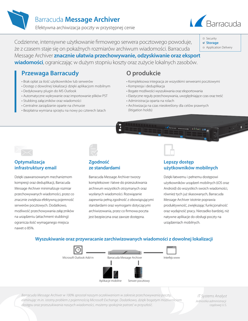 Barracuda Message Archiver Efektywna archiwizacja poczty w przystępnej cenie Codzienne, intensywne użytkowanie firmowego serwera pocztowego powoduje, że z czasem staje się on pokaźnych rozmiarów archiwum wiadomości. Barracuda Message Archiver znacznie ułatwia przechowywanie, odzyskiwanie oraz eksport wiadomości, ograniczając w dużym stopniu koszty oraz zużycie lokalnych zasobów. Security Storage Application Delivery Przewaga Barracudy O produkcie • Brak opłat za ilość użytkowników lub serwerów • Dostęp z dowolnej lokalizacji dzięki aplikacjom mobilnym • Dedykowany plugin do MS Outlook • Automatyczne wykrywanie oraz importowanie plików PST • Stubbing załączników oraz wiadomości • Centralne zarządzanie oparte na chmurze • Bezpłatna wymiana sprzętu na nowy po czterech latach • Kompleksowa integracja ze wszystkimi serwerami pocztowymi • Kompresja i deduplikacja • Bogate możliwości wyszukiwania oraz eksportowania • Elastyczne reguły przechowywania, uwzględniające czas oraz treść • Administracja oparta na rolach • Archiwizacja na czas nieokreślony dla celów prawnych (litigation holds) Optymalizacja infrastruktury email Zgodność ze standardami Lepszy dostęp użytkowników mobilnych Dzięki zaawansowanym mechanizmom Barracuda Message Archiver tworzy Dzięki łatwemu i pełnemu dostępowi kompresji oraz deduplikacji, Barracuda kompleksowe i łatwe do przeszukiwania użytkowników urządzeń mobilnych (iOS oraz Message Archiver minimalizuje rozmiar archiwum wszystkich otrzymanych oraz Android) do wszystkich swoich wiadomości, przechowywanych wiadomości, przez co wysłanych wiadomości. Rozwiązanie również tych już skasowanych, Barracuda znacznie zwiększa efektywną pojemność zapewnia pełną zgodność z obowiązującymi Message Archiver istotnie poprawia serwerów pocztowych. Dodatkowo, standardami oraz wymogami dotyczącymi produktywność, zwiększając funkcjonalność możliwość przechowywania załączników archiwizowania, przez co firmowa poczta oraz wydajność pracy. Nierzadko bardziej, niż na urządzeniu (attachment stubbing) jest bezpieczna oraz zawsze dostępna. natywne aplikacje do obsługi poczty na ogranicza ilość wymaganego miejsca urządzeniach mobilnych. nawet o 85%. Wyszukiwanie oraz przywracanie zarchiwizowanych wiadomości z dowolnej lokalizacji Microsoft Outlook Add-in Barracuda Message Archiver Aplikacje mobilne Interfejs www Serwer pocztowy Barracuda Message Archiver w 100% sprostał naszym oczekiwaniom w zakresie przechowywania poczty, eliminując m.in. istotny problem z pojemnością Microsoft Exchange. Dodatkowo, dzięki bogatym możliwościom dostępu oraz przeszukiwania naszych wiadomości, możemy spokojnie patrzeć w przyszłość. IT Systems Analyst Jednostka administracji rządowej U.S. Barracuda Networks Barracuda Message Archiver: Efektywna archiwizacja poczty w przystępnej cenie Cechy produktu Archiwizacja Zarządzanie • Archiwizacja wadomości SMTP, pozycji kalendarza, zadań oraz kontaktów • Zautomatyzowane wykrywanie oraz import plików PST • Raportowanie wielkości poczty, zużycia pamięci magazynowania, oraz naruszenia reguł Integracja • • • • • • • CIFS/iSCSI Mechanizm księgowania Exchange Importowanie z MS Exchange (MAPI) Importowanie poprzez IMAP i POP3 Eksport plików PST oraz EML Eksport do serwisu Copy (www.copy.com) Usługi email w chmurze (Office 365, Google Apps) za pośrednictwem Cloud Relay PORÓWNANIE MODELI Wydajność • Predefiniowane role • Szczegółowa kontrola dostępu oraz reguł • Audytor na poziomie domeny • Standardowe oraz własne reguły - wulgarny język - korzystanie z poczty w celach prywatnych - dane osobowe • Przegląd wiadomości naruszających reguły • Reguły przechowywania danych oparte o czas oraz treść • Archiwizacja na czas nieokreślony dla celów prawnych (litigation holds) • Przechowywanie załączników na urządzeniu (Exchange stubbing) • Deduplikacja • Kompresja • Konsolidacja plików PST Wyszukiwanie wiadomości • Wyszukiwanie pod kątem metadanych, załączników oraz treści wiadomości • Wyszukiwanie złożone • Zapisane wyszukiwania • Oznaczanie wiadomości • Eksport wyników wyszukiwania Bezpieczeństwo Dostęp do archiwów • Przechowywanie odporne na próby fałszowania danych • Skanowanie pod kątem złośliwego oprogramowania • Integracja z serwerami katalogów LDAP • Za pośrednictwem przeglądarki internetowej • Aplikacje iPhone/Android • Dodatek do MS Outlook 150 350 450 650 850 950 1050 POJEMNOŚĆ Maksymalna liczba użytkowników 150 500 1 000 2 000 4 000 6 000 18 000 Wielkość pamięci magazynowania 500 GB 2 TB 4 TB 8 TB 16 TB 24 TB 48 TB Obudowa rack 1U 1U 1U 1U 2U 2U 3U Wymiary (cm) 44,2 x 13,2 x 64,8 SPRZĘT 42,7 x 4,3 x 22,9 43,7 x 4,3 x 50,3 43,7 x 4,3 x 50,3 43,7 x 4,3 x 50,3 44,2 x 8,9 x 64,8 44,2 x 8,9 x 64,8 Waga (kg) 3,6 9,5 9,5 11,8 23,6 23,6 34,5 Ethernet 1 x Gigabit 1 x Gigabit 1 x Gigabit 1 x Gigabit 1 x Gigabit 1 x Gigabit 1 x Gigabit Prąd zmienny (Amp) 1,8 Macierz dyskowa RAID 1,8 2,4 4,1 5,1 5,1 5,5 RAID-1 RAID-1 RAID-6 RAID-6 RAID-6 RAID-60 • Pamięć ECC Zasilanie nadmiarowe WSPIERANE PLATFORMY • • • • • • Kompatybilność m.in. z Microsoft (Exchange, Office 365), Google Apps, Novell GroupWise, IBM Lotus Notes FUNKCJE ZALEŻNE OD MODELU • Wysoka dostępność (HA) • • Personalizacja wyglądu Sprzętowy adapter iSCSI • • • Specyfikacje mogą ulec zmianie bez wcześniejszego powiadomienia Opcje wsparcia Barracuda Energize Updates • Standardowe wsparcie techniczne • Aktualizacje definicji reguł • Aktualizacje definicji typów dokumentów • Aktualizacje sygnatur wirusów • Aktualizacje bezpieczeństwa Instant Replacement • Jednostka zastępcza wysyłana następnego dnia roboczego • Dodatkowe telefoniczne wsparcie techniczne producenta 24/7 • Bezpłatna wymiana sprzętu na nowy po czterech lat