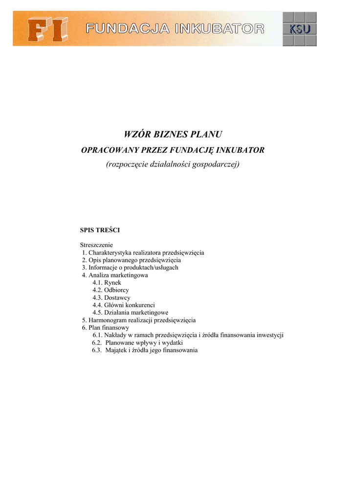 WZÓR BIZNES PLANU OPRACOWANY PRZEZ FUNDACJĘ INKUBATOR (rozpoczęcie działalności gospodarczej) SPIS TREŚCI Streszczenie 1. Charakterystyka realizatora przedsięwzięcia 2. Opis planowanego przedsięwzięcia 3. Informacje o produktach/usługach 4. Analiza marketingowa 4.1. Rynek 4.2. Odbiorcy 4.3. Dostawcy 4.4. Główni konkurenci 4.5. Działania marketingowe 5. Harmonogram realizacji przedsięwzięcia 6. Plan finansowy 6.1. Nakłady w ramach przedsięwzięcia i źródła finansowania inwestycji 6.2. Planowane wpływy i wydatki 6.3. Majątek i źródła jego finansowania Wzór biznes planu opracowany przez Fundację Inkubator _________________________________________________________________________________________________ STRESZCZENIE (max ½ strony) jaki jest cel sporządzanego biznes planu jakiego przedsięwzięcia biznes plan dotyczy kto będzie realizatorem przedsięwzięcia jak kosztowne jest przedsięwzięcie jaki jest udział środków własnych w finansowaniu przedsięwzięcia o jakie środki zabiega realizator przedsięwzięcia (wysokość poŜyczki, okres poŜyczkowy, okres karencji) spodziewane efekty w wyniku realizacji przedsięwzięcia 1. CHARAKTERYSTYKA REALIZATORA PRZEDSIĘWZIĘCIA nazwisko i imię adres zamieszkania / adres do korespondencji telefon wykształcenie stan cywilny przebyte szkolenia kwalifikacje i umiejętności przydatne do realizacji planowanego przedsięwzięcia charakterystyka kontaktów pomocnych w planowanej działalności informacje o posiadanym rachunku bankowym stan majątkowy i finansowy: AKTYWA (w PLN) Gotówka w domu i w banku Nieruchomości Akcje i obligacje Samochody Inny majątek osobisty _______________________________ RAZEM AKTYWA PASYWA (w PLN) PoŜyczki Zobowiązania budŜetowe Inne zobowiązania Kapitał własny _________________________ RAZEM PASYWA 2. OPIS PLANOWANEGO PRZEDSIĘWZIĘCIA nazwa projektu rodzaj działalności (handel, produkcja, usługi) przedmiot działalności forma organizacyjno-prawna forma rozliczeń z urzędem skarbowym lokalizacja charakterystyka planowanego przedsięwzięcia (w tym motywy załoŜenia przedsiębiorstwa i krótkie uzasadnienie wyboru branŜy) źródła finansowania projektu informacja na temat miejsc pracy, które zostaną utworzone w wyniku realizacji przedsięwzięcia (ilość miejsc pracy, stanowiska, forma zatrudnienia, wymiar czasu pracy) 3. INFORMACJE O PRODUKTACH/USŁUGACH nazwa produktów/usług i ich charakterystyka (główne cechy, zalety, walory uŜytkowe) zakres asortymentowy dla kogo przeznaczone będą produkty/usługi i jakie potrzeby będą zaspokajały innowacyjność produktów/usług czym oferowane produkty/usługi będą wyróŜniały się spośród produktów/usług dostępnych na rynku i jaka będzie ich przewaga nad produktami/usługami konkurencyjnymi w jaki sposób zapewniona zostanie jakość produktów/usług czy występuje sezonowość dodatkowe świadczenia (serwis, konserwacja itp.) 4. ANALIZA MARKETINGOWA 2 Wzór biznes planu opracowany przez Fundację Inkubator _________________________________________________________________________________________________ 4.1. RYNEK na jakim obszarze realizowana będzie sprzedaŜ produktów/usług (dzielnica, miasto, region, kraj, zagranica) – początkowo i docelowo koszty i bariery wejścia na rynek perspektywy i warunki utrzymania się na rynku opis czynników decydujących o odniesieniu sukcesu na tym rynku (moda, ekologia itp.) tendencje rozwoju rynku (rosnące, stabilizujące się, malejące) rola wysokiej jakości w ocenie rynku 4.2. ODBIORCY opis odbiorców produktów/usług (wiek, płeć, styl Ŝycia) klienci indywidualni, hurtownicy (udział %) określenie umiejscowienia klientów preferencje i oczekiwania klientów zagroŜenia leŜące po stronie klientów (przyzwyczajenia, zmiana gustów, mody) przewidywana forma rozliczeń (gotówka, przelew) wielkość popytu w stosunku do ofert firmy Przykładowi główni odbiorcy: Lp. Nazwa odbiorcy i adres % sprzedaŜy ogółem Termin zapłaty (w dniach) % udział w dostawach Termin zapłaty (w dniach) 1 2 3 4.3. DOSTAWCY ilość dostawców nazwa, lokalizacja przewidywaną formę rozliczeń (gotówka, przelew) warunki dostaw, jakość i pewność dostaw stopień zaleŜności Przykładowi główni dostawcy: Lp. Nazwa dostawcy 1 2 3 4.4. GŁÓWNI KONKURENCI ilość konkurentów opis głównych konkurentów obejmujący: nazwę, lokalizację, asortyment, pozycję (udział w rynku), szacowaną wielkość sprzedaŜy, silne i słabe strony konkurencji Główni konkurenci: Lp. Nazwa konkurenta 1 2 3 Silne strony Słabe strony jaka będzie przewaga firmy nad konkurencją w czym firma nie będzie w stanie z nimi konkurować potencjalni konkurenci (moŜliwość wejścia na rynek nowych firm) 4.5. DZIAŁANIA MARKETINGOWE 3 Wzór biznes planu opracowany przez Fundację Inkubator _________________________________________________________________________________________________ cele (co chcesz osiągnąć długofalowo i w ciągu najbliŜszego roku) polityka cenowa (poziom cen, rabaty) dystrybucja (w jaki sposób będzie odbywała się sprzedaŜ) opakowanie działania w sferze promocji i reklamy (w jaki sposób klienci będą informowani o produktach/usługach) w tym wzory zachowań nabywców (motywy, jakimi kierują się klienci np. cena, jakość, szerokość asortymentu, opakowanie, warunki gwarancji) 5. HARMONOGRAM REALIZACJI PRZEDSIĘWZIĘCIA planowany termin rozpoczęcia i zakończenia prac etapy realizacji przedsięwzięcia Etapy realizacji przedsięwzięcia Czas realizacji 6. PLAN FINANSOWY 6.1. NAKŁADY W RAMACH PRZEDSIĘWZIĘCIA I ŹRÓDŁA FINANSOWANIA INWESTYCJI PONIESIONE WYDATKI KWOTA WYDATKI OGÓŁEM PRZEWIDYWANE WYDATKI KWOTA I. Wydatki w ramach poŜyczki: II. Wydatki w ramach środków własnych: WYDATKI OGÓŁEM 4 6.2. PLANOWANE WPŁYWY I WYDATKI WYSZCZEGÓLNIENIE I. Planowane wpływy: 1. SprzedaŜ produktów, towarów, usług 2. Inne wpływy Wpływy ogółem II. Planowane wydat