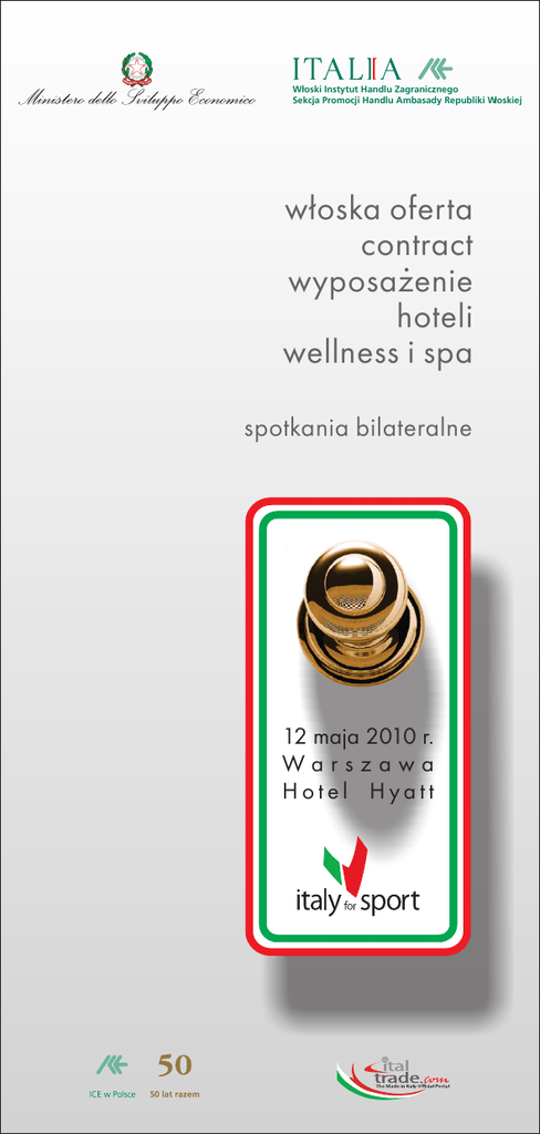 W³oski Instytut Handlu Zagranicznego Sekcja Promocji Handlu Ambasady Republiki W³oskiej w³oska oferta contract wyposazenie hoteli wellness i spa spotkania bilateralne 12 maja 2010 r. Warszawa Hotel Hyatt PROGRAM WARSZTATÓW 10.00 – 10.30 Rejestracja uczestników 10.30 – 16.30 Spotkania bilateralne W trakcie trwania spotkañ bêdzie serwowany buffet lunch. Prosimy o potwierdzenie udzia³u przesy³aj¹c za³¹czon¹ ankietê na numer faksu: 022 6280600 lub na adres mailowy: [email protected] Udzia³ w warsztatach jest bezp³atny. Zapewniamy t³umaczenie. 2 SPIS FIRM BARAUSSE . . . . . . . . . . . . . . . . . . . . . . . . . . . . . . . . . . . . 4 BENDONI INOX . . . . . . . . . . . . . . . . . . . . . . . . . . . . . . . . 5 BERTOLOTTO PORTE . . . . . . . . . . . . . . . . . . . . . . . . . . . . 6 BOCCHINI GENERAL CONTRACTING . . . . . . . . . . . . . . . 7 CERAMICA GLOBO . . . . . . . . . . . . . . . . . . . . . . . . . . . . . 8 COTTO MEDITERRANEO . . . . . . . . . . . . . . . . . . . . . . . . . 9 DETAMOBILI . . . . . . . . . . . . . . . . . . . . . . . . . . . . . . . . . 10 DOMITALIA . . . . . . . . . . . . . . . . . . . . . . . . . . . . . . . . . . . 11 EMMEBIESSE – SUITE HOTEL . . . . . . . . . . . . . . . . . . . 12 EMMEPI . . . . . . . . . . . . . . . . . . . . . . . . . . . . . . . . . . . . . 13 ESTRO . . . . . . . . . . . . . . . . . . . . . . . . . . . . . . . . . . . . . . 14 EXCEL . . . . . . . . . . . . . . . . . . . . . . . . . . . . . . . . . . . . . . . 15 FACONDINI CONTRACT & HOME DIVISION . . . . . . . . . 16 FLORIDA CONTRACT . . . . . . . . . . . . . . . . . . . . . . . . . . . 17 IBB . . . . . . . . . . . . . . . . . . . . . . . . . . . . . . . . . . . . . . . . . 18 IFI . . . . . . . . . . . . . . . . . . . . . . . . . . . . . . . . . . . . . . . . . . 19 INTERNA CONTRACT . . . . . . . . . . . . . . . . . . . . . . . . . . . 20 INTERNI ITALIANI . . . . . . . . . . . . . . . . . . . . . . . . . . . . . . 21 LIVE IT HOME & CONTRACT . . . . . . . . . . . . . . . . . . . . . 22 LUKAS DESIGN . . . . . . . . . . . . . . . . . . . . . . . . . . . . . . . 23 MAXHOTEL . . . . . . . . . . . . . . . . . . . . . . . . . . . . . . . . . . 24 NESSFITT . . . . . . . . . . . . . . . . . . . . . . . . . . . . . . . . . . . . 25 SLAMP SPA THE LEADING LIGHT . . . . . . . . . . . . . . . . . 26 TOSCANA INTERIORS . . . . . . . . . . . . . . . . . . . . . . . . . . 27 TURRI . . . . . . . . . . . . . . . . . . . . . . . . . . . . . . . . . . . . . . . 28 WEBERT . . . . . . . . . . . . . . . . . . . . . . . . . . . . . . . . . . . . . 29 VALPRA – LESS IS MORE . . . . . . . . . . . . . . . . . . . . . . . 30 VITA TERME . . . . . . . . . . . . . . . . . . . . . . . . . . . . . . . . . . 31 VITRIFRIGO . . . . . . . . . . . . . . . . . . . . . . . . . . . . . . . . . . 32 3 BARAUSSE BARAUSSE SPA VIA PARMESANA, 27 36010 MONTICELLO CONTE OTTO (VI) T. +39 0444 900000 F. +39 0444 900019 [email protected] www.barausse.com Firma Barausse od 40 lat projektuje i wytwarza drzwi wewnêtrzne do mieszkañ, rezydencji i hoteli. „PORTE DI BARAUSSE” to marka, pod któr¹ produkowane s¹ drzwi skrzyd³owe, przesuwne i ³amane wysokiej jakoœci. Najczêœciej stosowany materia³ to drewno posiadaj¹ce certyfikat Vero Legno® (Prawdziwe Drewno), które umiejêtnie ³¹czone jest ze szk³em, aluminium, stal¹, skór¹, kokosem czy kryszta³ami Swarovskiego®. 17 patentów przemys³owych to gwarancja jednolitego standardu produktu wszechstronnego, funkcjonalnego, ³atwego w monta¿u, o awangardowym wzornictwie. W odpowiedzi na specyficzne wymogi bran¿y hotelarskiej utworzono specjalny dzia³ BARAUSSE FOR CONTRACT, specjalizuj¹cy siê w projektowaniu i produkcji drzwi technologicznych (ogniotrwa³ych i dŸwiêkoszczelnych). Partner poszukiwany w Polsce: dostawcy sieci hotelowych, deweloperzy, projektanci, sprzedawcy 4 BENDONI INOX BENDONI INOX SRL VIA SAN MARCO, 9 52010 BIBBIENA (AR) T. +39 0575 560231 F. +39 0575 561362 [email protected] www.bendoni.it Produkujemy urz¹dzenia i wyposa¿enie ze stali nierdzewnej, m.in. blaty robocze wszelkiego typu i ró¿nych wymiarów, zlewy, armatura, umywalki, sterylizatory sztuæców, szafki wisz¹ce, szafki do naczyñ, szuflady, rega³y sk³adane, wsporniki, szafki do szatni, okapy kuchenne, zaplecza barów, wózki, blaty do obróbki ryb, specjalistyczne linie do produkcji wyrobów cukierniczych, pizzy i obróbki miêsa. Nasze wyroby wykorzystywane s¹ wszêdzie tam, gdzie odbywaj¹ siê procesy produkcji dañ i ¿ywnoœci: w bran¿y gastronomicznej, cateringu, super i hipermarketach, w przemyœle spo¿ywczym, cukiernictwie, przetwórniach ryb, pizzeriach, piekarniach, lodziarniach, barach, zak³adach przetwórstwa miêsa, warzyw i owoców oraz zak³adach produkcji artyku³ów mleczarskich i wêdlin. Partner poszukiwany w Polsce: importerzy, sprzedawcy, dystrybutorzy wyposa¿enia dla gastronomii 5 BERTOLOTTO PORTE BERTOLOTTO PORTE SPA CIRC. G.GIOLITTI, 43 - 45 12030 TORRE SAN GIORGIO (CN) T. +39 0172 912811 F. +39 0172 912800 [email protected] www.bertolottoporte.com Spó³ka Bertolotto powsta³a we W³oszech pod koniec lat 80-tych. Jest wiod¹cym producentem drzwi wewnêtrznych, ogniotrwa³ych i pancernych. Drzwi wewnêtrzne licz¹ dziesi¹tki wzorów, od nowoczesnych i tradycyjnych, produkowanych z laminatu, fornirowanych, po drzwi wykonane z pe³nego drewna i lakierowane. Jesteœmy obecni w ró¿nych czêœciach œwiata, od Panamy po Rosjê. Produkujemy tak¿e wiele wzorów drzwi przeszklonych ogniotrwa³ych FIRE PROOF DOORS (wytrzyma³oœæ 30 i 60 minut) oraz pancernych SECURITY DOORS, wykonanych wed³ug wzorów i materia³ów na ¿yczenie Klienta. Nasze drzwi wyró¿niaj¹ siê znakomitym wykoñczeniem oraz znanym na ca³ym œwiecie, doskona³ym wzornictwem w³oskim. Nasza firma posiada certyfikat MADE IN ITALY. Partner poszukiwany w Polsce: klienci docelowi, dystrybutorzy, dostawcy, agenci 6 BOCCHINI GENERAL CONTRACTING BOCCHINI SPA S.P. KM. 66,9 60