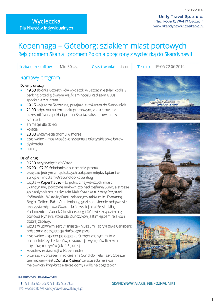16/06/2014 Unity Travel Sp. z o.o. Wycieczka Plac Rodła 8, 70-419 Szczecin www.skandynawskiewakacje.pl Dla klientów indywidualnych Kopenhaga – Göteborg: szlakiem miast portowych Rejs promem Skania i promem Polonia połączony z wycieczką do Skandynawii Liczba uczestników: Min.30 os. Czas trwania: 4 dni Termin: 19.06-22.06.2014 Ramowy program Dzień pierwszy 19.00 zbiórka uczestników wycieczki w Szczecinie (Plac Rodła 8 parking przed głównym wejściem hotelu Radisson BLU), spotkanie z pilotem 19.15 wyjazd ze Szczecina, przejazd autokarem do Świnoujścia 21.00 odprawa na terminalu promowym, zaokrętowanie uczestników na pokład promu Skania, zakwaterowanie w kabinach animacje dla dzieci kolacja 23.00 wypłynięcie promu w morze czas wolny – możliwość skorzystania z oferty sklepów, barów dyskoteka nocleg Dzień drugi 06.30 przypłynięcie do Ystad 06.00 – 07.30 śniadanie, opuszczenie promu przejazd jednym z najdłuższych połączeń między lądami w Europie - mostem Øresund do Kopenhagi wizyta w Kopenhadze – to jedno z największych miast Skandynawii, położone malowniczo nad cieśniną Sund, a strzeże go najsłynniejsza na świecie Mała Syrenka tuż przy Przystani Królewskiej. W stolicy Danii zobaczymy także m.in. Fontannę Bogini Gefion, Pałac Amalienborg, gdzie codziennie odbywa się uroczysta odprawa Gwardii Królewskiej a także siedzibę Parlamentu – Zamek Christiansborg i XVIII wieczną dzielnicę portową Nyhavn, która dla Duńczyków jest miejscem relaksu i dobrej zabawy. wizyta w „piwnym sercu”’ miasta - Muzeum Fabryki piwa Carlsberg połączona z degustacją duńskiego piwa. czas wolny – spacer po deptaku Stroget znanym mi.in z najmodniejszych sklepów, restauracji i występów licznych artystów, muzyków (ok. 1,5 godz.). kolacja w restauracji w Kopenhadze przejazd wybrzeżem nad cieśniną Sund do Helsingør. Obaszar ten nazwany jest „Duńską Riwierą” ze względu na swój malowniczy krajobraz a także domy i wille najbogatszych INFORMACJA I REZERWACJA: 91 35 95 657; 91 35 95 763 [email protected] SKANDYNAWIA JAKIEJ NIE POZNAŁ NIKT 16/06/2014 Unity Travel Sp. z o.o. Wycieczka Plac Rodła 8, 70-419 Szczecin www.skandynawskiewakacje.pl Dla klientów indywidualnych Duńczyków, które majestatycznie zwrócone są w stronę morza. przeprawa promowa na trasie Helsingor – Helsingborg przejazd autokarem do hotelu Clarion Grand Hotel •••• w Helsingborg, zakwaterowanie czas wolny i nocleg Dzień trzeci: 07.30 śniadanie, wykwaterowanie ok. 08.30 przejazd do Göteborga przejazd i zwiedzanie miasta Göteborg – umiejscowiony w pobliżu ujścia rzeki Gota, dzisiejszy Göteborg przyciąga turystów swoimi szerokimi alejami, parkami i imponującymi budowlami m.in.: Kamienny Pomost Stenpiren, Ratusz XVII w., klasycystyczna Katedra. W porcie Lilla Bommen na turystów czeka największy żaglowiec zbudowany w Skandynawii – The Viking z 1902 roku, w którym obecnie funkcjonuje hotel oraz budynek Opery, który kształtem przypomina skrzydła mewy. Na Starym mieście natomiast zobaczymy m.in. pomnik Gustav Adolfs Torg, pod którego rządami Szwecja w XVII wieku stała jedną z największych potęg militarnych Europy oraz wiele innych ciekawych zabudowań, gdzie zlokalizowane są restauracje, sklepy i kawiarnie. czas wolny w centrum miasta (możliwość wejścia do Ogrodu botanicznego we własnym zakresie) – ok. 1,5 godz. ok. 16.30 wyjazd z Göteborga i przejazd do Ystad 21.30 odprawa na terminalu promowym, zaokrętowanie uczestników na pokład promu Polonia, zakwaterowanie w kabinach animacje dla dzieci kolacja 22.30 wypłynięcie promu w morze czas wolny – możliwość skorzystania z oferty sklepów, barów dyskoteka nocleg Dzień czwarty: 06.45 przypłynięcie do Świnoujścia 06.00 – 07.00 śniadanie, opuszczenie promu ok. 09.00 przyjazd do Szczecina, zakończenie wycieczki Cena 1 104 PLN za osobę w pokoju/kabinie dwuosobowej 1 308 PLN za osobę w pokoju/kabinie jednoosobowej INFORMACJA I REZERWACJA: 91 35 95 657; 91 35 95 763 [email protected] SKANDYNAWIA JAKIEJ NIE POZNAŁ NIKT 16/06/2014 Unity Travel Sp. z o.o. Wycieczka Plac Rodła 8, 70-419 Szczecin www.skandynawskiewakacje.pl Dla klientów indywidualnych Specjalna cena dla dzieci od 4 do12 lat - 864 PLN Przy zakwaterowaniu w pokoju/kabinie z rodzicem Cena zawiera: Przejazd promem Skania na trasie Świnoujście - Ystad Przejazd promem Polonia na trasie Ystad - Świnoujście Miejsce w kabinie podczas rejsu nocnego na promie Skania i promie Polonia Kolacja na promie Skania na trasie Świnoujście - Ystad Śniadanie na promie Skania na trasie Świnoujście - Ystad Kolacja na promie Polonia na trasie Ystad - Świnoujście Śniadanie na promie Polonia na trasie Ystad - Świnoujście Suchy prowiant w II dniu wyjazdu Jeden nocleg ze śniadaniem w hotelu Clarion Grand Hotel •••• w Helsingborg w II dniu wyjazdu Kolacja w restauracji w Kopenhadze w II dniu wyjazdu Zwiedzanie Kopenhagi Zwiedzanie Göteborga Opłata za bilet wstępu do Muzeum Fabryki piwa Carlsberg w Kopenhadze w II dniu wyjazdu Opłata za przejazd autokaru mostem Øresund (Szwecja - Dania) w jedną stronę Opłata za przeprawę promową autokaru na trasie Helsingor Helsingborg (Dania - Szwecja) w jedną stronę Obsługa i przejazd autokarem na całej trasie wg programu Obsługa pilota/przewodnika w trakcie trwania wycieczki wg programu Ubezpieczenie NNW i KL Dodatek paliwowy Uwagi organizator zastrzega sobie prawo do zmiany programu, kolejności zwiedzania atrakcji turystycznych wymagane minimum uczestników – 30 osób sugerowane kieszonkowe: około 200 DKK i około 200 SEK oferta zawiera napoje do posiłków na promie Skania i promie Polonia (kawa lub herbata, woda mineralna, sok 0,2l) dzieci poniżej 3 roku życia – bezpłatnie, bez świadczeń dostępne są również pokoje/kabiny 3-osobowe w takiej samej cenie jak oferta z pokojem/kabiną 2-osobową wymagane jest posiadanie ważnego dokumentu toż