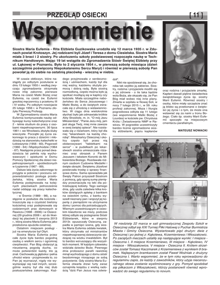 PRZEGLĄD OSIECKI [ 11 ] Wspomnienie Siostra Maria Eufemia - Rita Elżbieta Guzikowska urodziła się 12 marca 1935 r. w Zdunach powiat Krotoszyn. Jej rodzicami byli Józef i Teresa z domu Ciesielska. Siostra Maria miała 3 braci i 2 siostry. Po ukończeniu szkoły podstawowej rozpoczęła naukę w Technikum Handlowym. Mając 19 lat wstąpiła do Zgromadzenia Sióstr Świętej Elżbiety przy ul. Łąkowej w Poznaniu. Było to 2 stycznia 1954 r., w pierwszą sobotę miesiąca (dzień szczególnie poświęcony Niepokalanemu Sercu Maryi) i również w pierwszą sobotę Pan powołał ją do siebie na ostatnią placówkę - wieczną w niebie. W czasie obłóczyn, które nastąpiły po odbytym postulacie w dniu 13 lutego 1955 r. według zwyczaju zgromadzenia otrzymała nowe imię zakonne; pierwsze Maria na cześć Matki Bożej oraz Eufemia, na cześć św. Eufemii greckiej męczennicy z przełomu III i IV wieku. Po odbytym nowicjacie 25 lutego 1956 r. w Poznaniu złożyła Pierwszą Profesję. W Zgromadzeniu siostra Maria Eufemia kontynuowała naukę odbywając kursy katechetyczne oraz 2 - letnie studium do pracy z osobami niepełnosprawnymi. 30 lipca 1961 r. we Wrocławiu złożyła śluby wieczyste. Początki jej życia zakonnego to praca z dziećmi i młodzieżą na stanowisku katechetki w Łobieszynie (1956 - 60), Pogorzeli (1960 - 64) i Międzychodzie (1964 - 67). Następnie przez ponad dwadzieścia lat pełniła rolę wychowawczyni i opiekunki w Domu Pomocy Społecznej dla dzieci niepełnosprawnych - upośledzonych w Łopiennie (1967 - 89). Dalsze lata życia zakonnego to przyjęta w pokorze i poczuciu odpowiedzialności posługa przełożeńska, którą siostra Maria Eufemia podejmowała na kolejnych placówkach jednocześnie nadal oddając się pracy katechetycznej - w Śremie (1989 - 98), a następnie w posłudze dla kościoła troszczyła się o czystość bielizny kościelnej oraz podejmowała się codziennych prac domowych w Rawiczu (1998 - 2006) i w Osiecznej (29 grudnia 2006 r. aż do likwidacji tej placówki 5 sierpnia 2013 r., którą siostra Maria Eufemia jako przełożona opuściła ostatnia). Ostatnim miejscem posługi już na emeryturze był Otyń. Siostra Maria Eufemia przez całe życie była bardzo pogodną osobą o wielkim sercu i ogromnej cierpliwości. Pan Bóg obdarzył ją nieustanną pogodą ducha, co może potwierdzić każdy, kto ją znał. Cechowała ją głęboka i pełna ufności wiara - przyjmowała to, co Pan jej wyznaczył, nigdy nie wywyższając się nad innych, szczególnie ważny był dla niej ślub posłuszeństwa zakonnego. Każ- dego przyjmowała z serdecznością i uśmiechem, każdy był dla niej ważny, każdemu służyła pomocą i dobrą radą. Była siostrą rozmodloną, często można było ją spotkać modlącą się w kaplicy czy kościele. Miała szczególne nabożeństwo do Serca Jezusowego i Matki Bożej, a do świętych zwracała się z ufnością o wstawiennictwo. W ciągu dnia wielokrotnie słychać było jak odmawiała krótkie Akty Strzeliste, m. in. "O mój Jezu Miłosierdzia", "Panie Jezu mój, jam jest sługa Twój, miej mnie zawsze w swej świętej opiece". Nie rozstawała się z różańcem, który był dla niej "lekarstwem na każdą chorobę". Mieszkańcy Osiecznej i okolicy często byli przez nią obdarowywani "tabletkami na serce" - w pudełkach po lekarstwach siostra umieszczała różaniec oraz obrazek z Panem Jezusem i tekstem Koronki do Miłosierdzia Bożego. Rozdawała różnym osobom Cudowne Medaliki i święte obrazki. Świętemu Józefowi powierzała troskę o sprawy finansowe domu. Sama opowiadała jak Święty Patron przyszedł Siostrom z pomocą, gdy sporą sumę pieniędzy przeznaczyła na leki dla potrzebującej kobiety. Tego samego dnia, gdy uszła zaledwie kilka kroków dzielących aptekę z bankiem na osieckim rynku, z banku wyszedł nieznany pan i wręczył jej kopertę z pieniędzmi na utrzymanie domu i pomoc dla potrzebujących. Wiernym uczestniczącym w osieckim klasztorze we mszy, podczas której odbyło się pożegnanie Sióstr Elżbietanek, które w sierpniu 2013r. opuszczały Osieczną, zapadła w pamięci scena, gdy siostra Maria Eufemia oddała kwiatek, który otrzymała od ministrantów niepełnosprawnej dziewczynie siedzącej na wózku inwalidzkim. Był to bardzo wzruszający dla wszystkich moment. W każdym człowieku widziała dziecko Boże. Pewnego dnia proboszcz parafii rawickiej minął wychodzącego z domu sióstr bezdomnego niosącego ze sobą pożywienie. Gdy siostra Maria Eufemia otwarła drzwi furty zaraz oznajmiła księdzu z wielką radością "dziś Pan Jezus nas odwie- dził". Nikt nie spodziewał się, że choroba tak szybko ją zabierze. Siostry, rodzina i przyjaciele modlili się o jej zdrowie - o ile taka będzie wola Boża, ale okazało się, że Pan Bóg miał wobec niej inne plany. Zmarła w szpitalu w Nowej Soli, w nocy 7 lutego 2015 r., w 59. roku profesji zakonnej. Msza i liturgia pogrzebowa odbyła się 11 lutego (we wspomnienie Matki Bożej z Lourdes) w kościele pw. Chrystusa Króla i Zwiastowania NMP w Rawiczu. W pogrzebie uczestniczyły bardzo licznie zgromadzone siostry elżbietanki, pięciu kapłanów oraz rodzina i przyjaciele zmarłej. Kapłani dawali piękne świadectwa świątobliwego życia śp. siostry Marii Eufemii. Również siostry i osoby, które miały szczęście znać ją blisko są przekonane o świętości jej życia i o tym, że może ona wstawiać się za nami u tronu Bożego. Ciało śp. siostry Marii Eufemii spoczęło na miejscowym cmentarzu parafialnym. MATEUSZ NOWACKI W niedzielę 22 marca w sali gimnastycznej Zespołu Szkół w Osiecznej odbył się XXI Turniej Piłki Halowej o Puchar Burmistrza Miasta i Gminy Osieczna. Wystartowało pięć drużyn: dwie z Osiecznej i po jednej z: Kąkolewa, Krzemieniewa i Włoszakowic. Po zaciętych meczach ustaliły się następujące wyniki: I miejsce Osieczna I, II miejsce Krzemieniewo, III miejsce - Kąkol