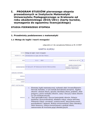 I. PROGRAM STUDIÓW pierwszego stopnia prowadzonych w Instytucie Matematyki Uniwersytetu Pedagogicznego w Krakowie od roku akademickiego 2010/2011 (karty kursów, wymagania do egzaminu licencjackiego) STUDIA PIERWSZEGO STOPNIA 1. Przedmioty podstawowe z matematyki 1.1 Wstęp do logiki i teorii mnogości załącznik nr 2 do zarządzenia Rektora nr R-12/2007 KARTA KURSU NAZWA Wstęp do logiki i teorii mnogości NAZWA W J. ANG. Introduction to Logic and Set Theory 11.1- KOD -810 PUNKTACJA ECTS 8 ZESPÓŁ DYDAKTYCZNY KOORDYNATOR Dr hab prof. UP Katarzyna Korwin-Słomczyńska Katedra Zastosowań i Podstaw Matematyki WARUNKI WSTĘPNE WIEDZA UMIEJĘTNOŚCI KURSY EFEKTY KSZTAŁCENIA 1. WIEDZA 2. Elementy logiki matematycznej: rachunek zdań i kwantyfikatorów. Dowody formalne, w tym metoda dowodzenia niewprost. Algebra zbiorów: element zbioru, sposoby określania zbioru, podzbiór, zbiór potęgowy, prawa rachunku zbiorów, sumy i iloczyny rodzin zbiorów (w tym nieskończonych). Para uporządkowana i iloczyn kartezjański zbiorów. Relacje: dziedzina i przeciwdziedzina, składanie relacji, relacja odwrotna. Własności relacji: zwrotność, symetryczność, antysymetryczność, przechodniość i spójność. Relacje równoważności: klasy abstrakcji, zbiór ilorazowy, relacja równoważności a podział zbioru, zastosowanie do tworzenia pojęć abstrakcyjnych. 3. 4. 1. 2. UMIEJĘTNOŚCI 3. 4. Konstrukcja liczb całkowitych i wymiernych. Zbiory częściowo i liniowo uporządkowane: elementy wyróżnione, porządek gęsty. Funkcje: obraz i przeciwobraz, składanie funkcji, funkcja odwrotna, injekcja, surjekcja, bijekcja, twierdzenie o faktoryzacji. Liczby naturalne, indukcja matematyczna, zasada minimum i definiowanie przez indukcję. Pojęcie równoliczności zbiorów: zbiory przeliczalne i nieprzeliczalne, przeliczalność zbioru liczb wymiernych i nieprzeliczalność zbioru liczb rzeczywistych. Stosowanie rachunku zdań i kwantyfikatorów oraz indukcji matematycznej w prowadzeniu rozumowań, w szczególności w dowodzeniu twierdzeń. wykonywania działań na zbiorach i funkcjach. interpretowania zagadnień znanych z innych dziedzin matematyki w języku teorii zbiorów rozumienie zagadnień związanych z różnymi rodzajami nieskończoności oraz porządków w zbiorach. ORGANIZACJA FORMA ZAJĘĆ ĆWICZENIA W GRUPACH WYKŁAD (W) A 30 LICZBA GODZIN K L S P 30 FORMY SPRAWDZANIA EFEKTÓW KSZTAŁCENIA W egzamin A zaliczenie – na podstawie kolokwiów K L S P OCENA Ocena z egzaminu UWAGI PODSTAWOWA 1. LITERATURA 2. 3. A. Chronowski, Zadania z elementów teorii mnogości i logiki matematycznej, Wydawnictwo ,,Dla szkoły'', Wilkowice 1999. W. Guzicki, P. Zakrzewski, Wstęp do matematyki. Zbiór zadań, Wydawnictwo Naukowe PWN, Warszawa 2005. W. Guzicki, P. Zakrzewski, Wykłady ze wstępu do matematyki, UZUPEŁNIAJĄCA 1. 2. 3. 4. A. Chronowski, Elementy teorii mnogości, WN WSP, Kraków 2000. J. Cichoń, Wykłady ze wstępu do matematyki, Dolnośląskie Wydawnictwo Edukacyjne, Wrocław 2003. K. Kuratowski, Wstęp do teorii mnogości i topologii, PWN,Warszawa 2004. R. Murawski, K. Świrydowicz, 4. 5. Wydawnictwo Naukowe PWN, Warszawa 2005. W. Marek, J. Onyszkiewicz, Elementy logiki i teorii mnogości w zadaniach, PWN, Warszawa 2006. H. Rasiowa, Wstęp do matematyki Wstęp do teorii mnogości, Wydawnictwo Naukowe UAM, Poznań 2006. współczesnej, PWN, Warszawa 2007. 1.2 Analiza matematyczna 1 KARTA KURSU NAZWA Analiza matematyczna 1 NAZWA W J. ANG. Mathematical Analysis 1 11.1- KOD -810 PUNKTACJA ECTS 8 ZESPÓŁ DYDAKTYCZNY KOORDYNATOR Prof. dr hab. Tadeusz Winiarski Katedra Analizy Matematycznej i Równań Funkcyjnych WARUNKI WSTĘPNE WIEDZA UMIEJĘTNOŚCI KURSY EFEKTY KSZTAŁCENIA 5. 6. 7. WIEDZA UMIEJĘTNOŚCI Liczby rzeczywiste. Aksjomatyka liczb rzeczywistych. Kresy zbiorów. Liczby zespolone. Odwzorowania. Składanie, odwracanie, obrazy i przeciwobrazy zbiorów. Podstawowe funkcje elementarne w dziedzinie rzeczywistej, ciągi i podciągi. 8. Teoria granic. Granica ciągu liczbowego. Granica dolna i górna ciągu liczbowego i funkcji rzeczywistej w punkcie. Przestrzenie metryczne, otoczenia punktów, zbiory otwarte i domknięte, punkty skupienia. Zwartość, spójność i zupełność podzbiorów przestrzeni euklidesowej. 9. Odwzorowania ciągłe i ich własności. Podstawowe funkcje elementarne w dziedzinie rzeczywistej, ich ciągłość i granice z nimi związane. Własność Darboux. Ciągłość jednostajna. 10. Rachunek różniczkowy funkcji zmiennej rzeczywistej. Interpretacja fizyczna i geometryczna pochodnej. Działania na funkcjach a pochodna. Twierdzenia o wartości średniej. 1. 2. 3. obliczanie granic cigów, funkcji jednej zmiennej. badania zbieżności ciągów. obliczanie pochodnych 4. badanie przebiegu funkcji. ORGANIZACJA FORMA ZAJĘĆ ĆWICZENIA W GRUPACH WYKŁAD (W) A 30 LICZBA GODZIN K L S P 30 FORMY SPRAWDZANIA EFEKTÓW KSZTAŁCENIA W egzamin A zaliczenie – na podstawie kolokwiów K L S P OCENA Ocena z egzaminu UWAGI UZUPEŁNIAJĄCA PODSTAWOWA 1. 2. 3. LITERATURA 4. 5. 6. J. Banaś, S. Wędrychowicz, Zbiór zadań z analizy matematycznej, WNT, Warszawa 1994. G. N. Berman, Zbiór zadań z analizy matematycznej, Wydawnictwo Pracowni Komputerowej Jacka Skalmierskiego, Gliwice 1999. B. P. Demidowicz, Sbornik zadacz i uprażnienij po matemematiczeskomu analizu, Izdat. Nauka, Moskwa 1977. G. M. Fichtenholz, Rachunek różniczkowy i całkowy, t. I, PWN, Warszawa 1985. F. Leja, Rachunek różniczkowy i całkowy, PWN, Warszawa 1976. W. Rudin, Podstawy analizy matematycznej, PWN, Warszawa 1982. 1.3 Analiza matematyczna 2 1. 2. 3. 4. 5. 6. J. Dieudonne, Foundations of Modern Analysis, Academic Press, New York and London, 1969. W. Kaczor, M. Nowak, Zadania z analizy matematycznej, cz. I,II, Wydawnictwo UMCS, Lublin 1996. W. Krysicki, L. Włodarski, Analiza matematyczna w zadaniach, cz. I, PWN, Warszawa 1994. T. Krasiński, Analiza matematyczna (funkcje jednej zmiennej), WUŁ, Łódź 