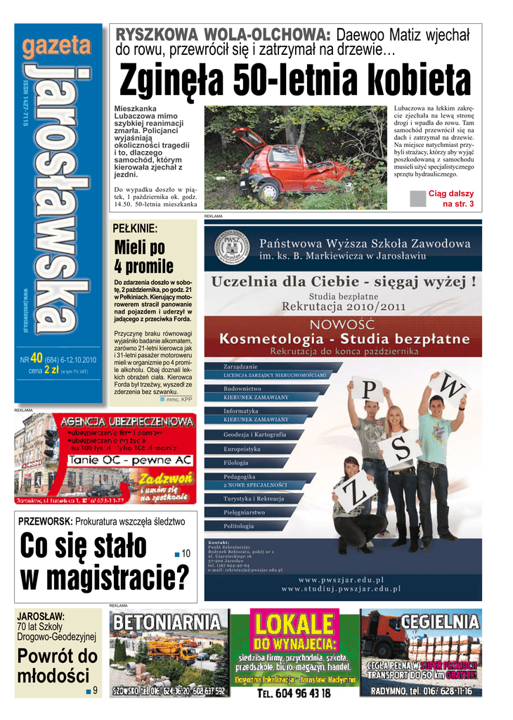 Ryszkowa Wola-Olchowa: Daewoo Matiz wjechał do rowu, przewrócił się i zatrzymał na drzewie… Zginęła 50-letnia kobieta Mieszkanka Lubaczowa mimo szybkiej reanimacji zmarła. Policjanci wyjaśniają okoliczności tragedii i to, dlaczego samochód, którym kierowała zjechał z jezdni. Lubaczowa na lekkim zakręcie zjechała na lewą stronę drogi i wpadła do rowu. Tam samochód przewrócił się na dach i zatrzymał na drzewie. Na miejsce natychmiast przybyli strażacy, którzy aby wyjąć poszkodowaną z samochodu musieli użyć specjalistycznego sprzętu hydraulicznego. Do wypadku doszło w piątek, 1 października ok. godz. 14.50. 50-letnia mieszkanka Ciąg dalszy na str. 3 reklama Pełkinie: Mieli po 4 promile Do zdarzenia doszło w sobotę, 2 października, po godz. 21 w Pełkiniach. Kierujący motorowerem stracił panowanie nad pojazdem i uderzył w jadącego z przeciwka Forda. 40 NR (684) 6-12.10.2010 cena 2 zł (w tym 7% VAT) Przyczynę braku równowagi wyjaśniło badanie alkomatem, zarówno 21-letni kierowca jak i 31-letni pasażer motoroweru mieli w organizmie po 4 promile alkoholu. Obaj doznali lekkich obrażeń ciała. Kierowca Forda był trzeźwy, wyszedł ze zderzenia bez szwanku. ■ mmc, KPP reklama Przeworsk: Prokuratura wszczęła śledztwo Co się stało w magistracie? 10 reklama Jarosław: 70 lat Szkoły Drogowo-Geodezyjnej Powrót do młodości 9 rozmaitości w w w. j a r o s l a w s k a . p l Ponad 3 promile na rowerze 3 października ok. godz. 18.50 w Woli Buchowskiej, policjanci zatrzymali 51-letniego mieszkańca tej wsi, który poruszał się po drodze publicznej rowerem mając 3,3 promila alkoholu w organizmie. Poszukiwani sprawcy Policjanci poszukują sprawców rozboju, do którego doszło 3 października w Woli Buchowskiej. Dwóch zamaskowanych mężczyzn weszło do domu 87-letniej kobiety i używając wobec niej przemocy, obezwładnili ją i skradli z kieszeni 400 zł. Przywieziony na miejsce pies policyjny zgubił trop. Bandyci najprawdopodobniej odjechali z miejsca napadu samochodem. Kobieta na szczęście nie doznała obrażeń ciała. Mimo zakazu 2 października ok. godz. 15 funkcjonariusze Policji zatrzymali 54-letniego mieszkańca Cetuli, który poruszał się rowerem mając 1,5 promila alkoholu w organizmie. Podczas działań wyszło także na jaw, iż 8 lipca b.r. mężczyzna otrzymał sądowy zakaz prowadzenia pojazdów. Łupem 1000 zł Policjanci jarosławskiej Komendy zatrzymali kobietę, która 30 września przy ul. Słowackiego dopuściła się kradzieży portfela, w którym było 1000 zł. Sprawczynią okazała się 48-letnia mieszkanka Mielca. Sprawca zatrzymany Policjanci zatrzymali sprawcę włamania, do którego doszło w nocy z 24 na 25 sierpnia w Surochowie. Sprawca po uprzednim wyłamaniu zamka w drzwiach do budynku gospodarczego skradł z jego wnętrza spawarkę, pompę wodną oraz przedłużacz. Łączna wartość strat to 3 000 zł. Sprawcą okazał się 20-letni mieszkaniec Surochowa. ■ mmc, KPP Łańcut, Jarosław: Policja zatrzymała 22-letniego mężczyznę, który na swoim koncie ma ponad dwadzieścia włamań do plebani Włamywacz do plebani zatrzymany 26 września, Dyżurny Komendy Powiatowej w Łańcucie odebrał zgłoszenie o włamaniu do jednej z miejscowych plebani. W tym przypadku łupem złodzieja padło 10 tys. zł. Policjanci przeprowadzili oględziny i zabezpieczyli ślady. Dzięki i informacjom, jakie przekazał pokrzywdzony, funkcjonariusze bardzo szybko natrafili na włamywacza. Okazał się nim 22-letni mieszkaniec powiatu jarosławskiego, który słynie z tego typu włamań. Kilka miesięcy temu mężczyzna został zatrzymany na gorącym uczynku, gdy włamywał się do plebani w Manasterzu (pow. przeworski), o czym informowaliśmy na łamach GJ w nr 11 z 17 marca br. Jest podejrzany o liczne włamania do plebani na terenie powiatu prze- powiat jarosławski: Akcja Granica Zakończyła się prowadzona na drogach powiatu jarosławskiego akcja „Granica 2010”, odbywająca się w naszym rejonie już po raz kolejny. Priorytetem wspólnych działań Policji i Straży Granicznej było zapewnienie bezpieczeństwa na drogach w terenie przygranicznym. Stróże prawa przeprowadzili wzmożone kontrole, które miały na celu wyeliminowanie z ruchu kierowców będących pod wpływem alkoholu, niesprawnych pojazdów oraz prób przemytu. W tym celu, na kilku punktach kontrolnych policjanci przeprowadzili 22 szczegółowe kontrole, w wyniku których ujawniono 4 przypadki niesprawnych technicznie samochodów, nałożono 8 mandatów karnych o łącznej kwocie 800 zł i zastosowano 5 pouczeń. ■ mmc, KPP Jarosław: Lekarz zatrzymany za łapówki worskiego, łańcuckiego, jarosławskiego, leżajskiego, rzeszowskiego, a nawet w okolicach Warszawy. Mężczyzna wykorzystywał okazję, kiedy księża odprawiali nabożeństwa, upewniał się, że wewnątrz budynku nikogo nie ma, wyważał drzwi, bądź wybijał okno i wchodził do środka. Zdarzało się, że mężczyzna był wybredny i często kradł tylko banknoty o wysokich nominałach. W marcu został tymczasowo aresztowany na okres dwóch miesięcy następnie zwolniony. Mimo grożącej mu odpowiedzialności karnej powrócił do „zawodu”. Został zatrzymany 27 września. Przyznał się do kradzieży. Policjanci odzyskali część skradzionych pieniędzy. ■ mmc, KPP Korczowa: Ponton z nielegalnym towarem płynął do Polski rzeką Szkło Przemyt na pontonie Dzięki dobrej współpracy Służb Granicznych Polski i Ukrainy odnotowano kolejny sukces. Uzyskane ze strony ukraińskiej informacje pozwoliły zatrzymać dwóch mieszkańców powiatu jarosławskiego, którzy będąc w zmowie z ukraińskimi „dostawcami”, próbowali przemycić do Polski 5 tys. paczek papierosów. Rynkowa wartość tej kontrabandy to 40 tys. zł. – Papierosy zapakowane były w pudła i owinięte niebieską, nieprzemakalną folią. Ponton z nielegalnym towarem został spławiony rzeką Szkło