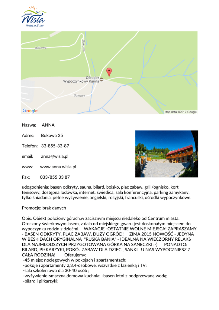 Nazwa: ANNA Adres: Bukowa 25 Telefon: 33-855-33-87 email: [email protected] www: www.anna.wisla.pl Fax: 033/855 33 87 udogodnienia: basen odkryty, sauna, bilard, boisko, plac zabaw, grill/ognisko, kort tenisowy, dostępna lodówka, internet, świetlica, sala konferencyjna, parking zamykany, tylko śniadania, pełne wyżywienie, angielski, rosyjski, francuski, ośrodki wypoczynkowe. Promocje: brak danych Opis: Obiekt położony górach,w zacisznym miejscu niedaleko od Centrum miasta. Otoczony świerkowym lasem, z dala od miejskiego gwaru jest doskonałym miejscem do wypoczynku rodzin z dziećmi. WAKACJE -OSTATNIE WOLNE MIEJSCA! ZAPRASZAMY - BASEN ODKRYTY, PLAC ZABAW, DUŻY OGRÓD! ZIMA 2015 NOWOŚĆ - JEDYNA W BESKIDACH ORYGINALNA "RUSKA BANIA" - IDEALNA NA WIECZORNY RELAKS DLA NAJMŁODSZYCH PRZYGOTOWANA GÓRKA NA SANECZKI :-) PONADTO: BILARD, PIŁKARZYKI, POKÓJ ZABAW DLA DZIECI, SANKI U NAS WYPOCZNIESZ Z CAŁĄ RODZINĄ! Oferujemy: -45 miejsc noclegowych w pokojach i apartamentach; -pokoje i apartamenty 2,3,4-osobowe, wszystkie z łazienką i TV; -sala szkoleniowa dla 30-40 osób ; -wyżywienie-smaczna,domowa kuchnia; -basen letni z podgrzewaną wodą; -bilard i piłkarzyki; -sauna -masaże:relaksacyjne oraz klasyczne wykonywane przez dyplomowanego fizjoterapuetę, -dostęp do Internetu; -pokój zabaw dla dzieci; -plac zabaw dla dzieci; -boisko do koszykówki, -boisko do siatkówki i piłki nożnej, -trampolina, -tenis stołowy, -zadaszone miejsce do grillowania; --chata do grillowania na 60 osób, -własny parking; -dogodny dojazd(1,5km od centrum miasta,05km od dworca PKP i PKS); -500m od ośrodka znajduje sie kompleks basenów tropikalnych; -znajdujemy się 500m od Hotelu Gołębiewski- zapewniamy noclegi dla uczestników konferencji. Serdecznie zapraszamy