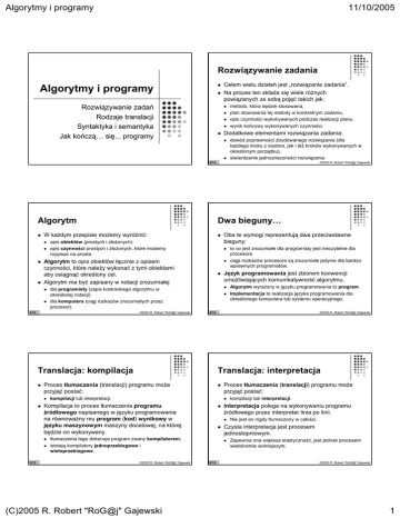 Algorytmy i programy 11/10/2005 Rozwiązywanie zadania Algorytmy i programy ! ! Rozwiązywanie zadań Rodzaje translacji Syntaktyka i semantyka Jak kończą… się... programy Celem wielu działań jest „rozwiązanie zadania”. Na proces ten składa się wiele różnych powiązanych ze sobą pojęć takich jak: ! ! ! ! ! metoda, która będzie stosowana, plan stosowania tej metody w konkretnym zadaniu, opis czynności wykonywanych podczas realizacji planu, wynik końcowy wykonywanych czynności. Dodatkowe elementami rozwiązania zadania: ! ! dowód poprawności zbudowanego rozwiązania (dla każdego kroku z osobna, jak i też kroków wykonywanych w określonym porządku), stwierdzenie jednoznaczności rozwiązania. 2/12 Algorytm ! ! ! ! Dwa bieguny… W każdym przepisie możemy wyróżnić: ! ! opis obiektów (prostych i złożonych) opis czynności prostych i złożonych, które możemy rozpisać na proste. ! ! ! ©2005 R. Robert ‘RoG@j’ Gajewski ! ! 5/12 ! kompilacji lub interpretacji. Proces tłumaczenia (translacji) programu może przyjąć postać: ! Kompilacja to proces tłumaczenia programu źródłowego napisanego w języku programowania na równoważny mu program (kod) wynikowy w języku maszynowym maszyny docelowej, na której będzie on wykonywany. ! ©2005 R. Robert ‘RoG@j’ Gajewski Translacja: interpretacja Proces tłumaczenia (translacji) programu może przyjąć postać: ! ! Algorytm wyrażony w języku programowania to program. Implementacja to realizacja języka programowania dla określonego komputera lub systemu operacyjnego. 4/12 Translacja: kompilacja ! to co jest zrozumiałe dla programisty jest nieczytelne dla procesora ciągi rozkazów procesora są zrozumiałe jedynie dla bardzo wprawnych programistów. Język programowania jest zbiorem konwencji umożliwiających komunikatywność algorytmu. ! dla programisty (zapis konkretnego algorytmu w określonej notacji) dla komputera (ciąg rozkazów zrozumiałych przez procesor). 3/12 Oba te wymogi reprezentują dwa przeciwstawne bieguny: ! Algorytm to opis obiektów łącznie z opisem czynności, które należy wykonać z tymi obiektami aby osiągnąć określony cel. Algorytm ma być zapisany w notacji zrozumiałej ! ©2005 R. Robert ‘RoG@j’ Gajewski ! ! ! tłumaczenia tego dokonuje program zwany kompilatorem; istnieją kompilatory jednoprzebiegowe i wieloprzebiegowe. ©2005 R. Robert ‘RoG@j’ Gajewski (C)2005 R. Robert "RoG@j" Gajewski Nie jest on nigdy tłumaczony w całości. Czysta interpretacja jest procesem jednostopniowym. ! 6/12 kompilacji lub interpretacji. Interpretacja polega na wykonywaniu programu źródłowego przez interpreter linia po linii. Zapewnia ona większa elastyczność, jest jednak procesem wielokrotnie wolniejszym. ©2005 R. Robert ‘RoG@j’ Gajewski 1 Algorytmy i programy 11/10/2005 Cel programowania ! Implementacja komputerowa Podstawowym celem każdego języka programowania jest pomoc w budowie programu (programowaniu) w sferze: ! ! ! ! ! projektowania programu (zakres programu, specyfikacja danych); przejrzystości (wyrażanie akcji w sposób zrozumiały); dokumentacja powinna być integralną częścią procesu programowania; program powinien być zapisany czytelnie, aby umożliwić jego konserwację i dokonywanie w nim poprawek i rozszerzeń; weryfikacji (łatwość określania poprawności i testowania). 7/12 ©2005 R. Robert ‘RoG@j’ Gajewski ! ! ! ! ©2005 R. Robert ‘RoG@j’ Gajewski Semantyka Syntaktyka języka programowania (składnia) zajmuje się formą pisania programów i jest zbiorem reguł, które definiują sposób konstruowania łańcuchów symboli. ! ! Semantyka zajmuje się znaczeniem programów, czyli tym, co się dzieje podczas wykonywania programów. ! Dopuszczalne zbiory łańcuchów nazywamy programami poprawnymi syntaktycznie. Pomyśl o ‘mowie potocznej’ – wypowiedziach polityków, które są zgodne z regułami gramatyki, formalnie poprawne, ale… mogą być one całkowicie pozbawione sensu! ! ©2005 R. Robert ‘RoG@j’ Gajewski ! ! ! ! poprawne zakończenie przerwanie wykonywania na skutek błędu, proces nieskończony ! Treść programu może być pisana w formatach: ! ! ©2005 R. Robert ‘RoG@j’ Gajewski Komentarze Rozróżnia się trzy warianty zakończenia działania programu: ! stałym (od określonej kolumny, odstępy nie mają znaczenia!!! swobodnym (odstępy są istotnym elementem). Dla uzyskania komunikatywnego przedstawienia algorytmów programista musi mieć możliwość robienia bezpośrednio w programie adnotacji (komentarzy). Możliwe są różne konwencje pisania w programie komentarzy: ! ! ! 11/12 Granica pomiędzy składnią a semantyka nie jest ściśle i jednoznacznie zdefiniowana. 10/12 Wykonanie i treść… ! Reguły semantyczne języka definiują zbiór programów poprawnych semantycznie, a także błędy semantyczne. Ciąg znaków (instrukcji, zdań) poprawny składniowo (syntaktycznie) może się okazać błędny semantycznie (jest to widoczne podczas wykonywania programu). ! 9/12 dostępnością (dla jakich maszyn i systemów operacyjnych istnieją kompilatory danego języka); bibliotekami (czy istnieje wsparcie w postaci gotowych podprogramów); efektywnością (czy kompilator działa szybko i czy produkuje efektywny kod wynikowy); dokumentacją (czy istnieje precyzyjny opis lub norma języka i dokumentacja kompilatora). 8/12 Syntaktyka ! Problem implementacji komputerowej łączy się z następującymi sprawami: ©2005 R. Robert ‘RoG@j’ Gajewski (C)2005 R. Robert "RoG@j" Gajewski 12/12 rozpoczęcie komentarza w z góry zadanej kolumnie obejmuje on wówczas wszystkie znaki do końca wiersza; użycie specjalnego symbolu, oznaczającego, że wiersz jest komentarzem; rozpoczęcie i kończenie komentarza symbolami specjalnymi. ©2005 R. Robert ‘RoG@j’ Gajewski 2
