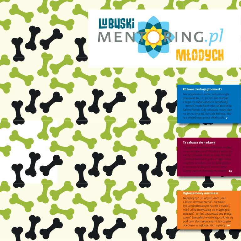 LUbuski Różowe okulary groomerki Nie wyobrażam sobie, żebym mogła pracować 10, 20, 30 lat i nie czerpać z tego, co robię radości i satysfakcji – mówi Dorota Kochinke, właścicielka Salonu Westi. Gdy układała nowy plan na życie, była już dojrzała kobietą, która z niejednego pieca chleb jadła. 7 Ta zabawa się nadawa Czy jesteś kreatywny? Umiesz myśleć nieschematycznie? Wyobraź sobie, że każdy człowiek ma trzy nogi. Pomyśl o konsekwencjach, jakie z tego faktu mogłyby wynikać. Co by było gdyby drzewa rosły do góry korzeniami? Gdyby żarówki świeciły na czarno? 11 Ogłoszeniowy miszmasz Najlepiej być „młodym”, mieć „min. 2-letnie doświadczenie”. Ale także być „zorientowanym na cele i wyniki”, mieć „silną motywację do osiągnięcia sukcesu”, i umieć „pracować pod presją czasu”. Specjaliści wyjaśniają, co kryje się pod tymi sformułowaniami, tak często obecnymi w ogłoszeniach o pracę. 20 spis treści 3 O CZYM MARZYCIE, CO WAS KRĘCI? Pytamy Was młodzi, bo nas to bardzo ciekawi. 4 Z DRUGIEJ STRONY BIURKA Czyli szkoła oczami byłej nauczycielki, Hanny Musiejkiewicz. Szczerze. 7 RÓŻOWE OKULARY GROOMERKI Miała odwagę, motywację i nie bała się zmian. Była pielęgniarką, została psim fryzjerem. Historia Doroty Kochinke. 11 TA ZABAWA SIĘ NADAWA O kreatywności słów kilkaset. Jesteś pomysłowy? Sprawdź się! 15 MŁODY, NAJLEPIEJ NIE RÓB JUŻ NIC Dość zgryźliwy felieton redaktorki naczelnej. Dlatego, że jest już stara i czasem z młodymi staro się czuje. 16 DZIĘKI HUNE ODNALAZŁAM HARMONIĘ O zmianie pracy i przemianie duchowej, opowiada Irmina Balcerek. 20 OGŁOSZENIOWY MISZMASZ Najlepiej, żebyś był wysoce zmotywowany, zorientowany na cele i wyniki, dyspozycyjny… ale co właściwie oznaczają te zwroty, często używane w ogłoszeniach o pracę? 2 mentoring lubuski.pl O czym marzycie? Co was kręci? Weźcie do ręki ten numer naszego magazynu, a jak nie do ręki, to sięgnijcie po wersję elektroniczną, do pobrania na www.lubuskimentoring.pl. Przeczytajcie go koniecznie od dechy do dechy. Ten numer biuletynu jest szczególnie ważny, bo na tapecie jest edukacja i wszystko co się z nią wiąże. Próbujemy dotknąć tematu z różnych stron – pytamy, notujemy, coś nam nie daje spokoju, więc znowu pytamy. Ale czy znajdziemy złoty środek? Chyba takiego nie ma, przynajmniej ja o tym nie wiem. Ale o tym przeczytacie we wstępie dla „starych”. Ja raczej chcę napisać dzisiaj o was, o tym jacy jesteście, o czym marzycie, co was kręci. Macie dobrze, tak, tak, bo możecie się buntować i wszyscy wam to wybaczą. Ja też się czasem buntuję, ale to już jest inny rodzaj buntu – wynikający z doświadczenia i przeżyć oraz postrzegania rzeczywistości. Ale powróćmy do tego, co was boLI Ostatnio, próbując pozyskać kolejne środki na działania dla młodzieży, przeprowadziliśmy diagnozę. Okazało się, że gimnazjaliści w ocenie swoich nauczycieli są kreatywni, a w szkołach ponadgimnazjalnych coś się zaczyna zmieniać. Kochani „o co kaman?” A może to tylko nam dorosłym się wydaje, że tak jest. Bo w tej sytuacji wybrzmiał nam paradoks – narzekamy na system oświaty, jest przecież wielu przeciwników gimnazjów, a mimo wszystko gimnazjaliści w ocenie pedagogów wypadają lepiej. Dlaczego szkoła średnia zmienia młodzież? A może to właśnie wina gimnazjów, których wpływ przez 3 lata, działa na młodych ludzi destrukcyjnie? A potem w szkołach ponadgimnazjalnych pojawiają się młodzi niezbyt kreatywni i niepewni siebie. Może po prostu po 9 latach trwania w systemie coś w was pęka? I przyznam się, jakoś mnie to nie dziwi. Czy TO system, czy LUdZIe? Bo tu chyba jest największy problem. Nigdy nie będzie tak, że wszystko się będzie wszystkim podobać. Ale nie wystarczy gadać, trzeba próbować zmieniać system, który nie zawsze się sprawdza i mieć na to realny wpływ. Ja wam życzę, abyście na swojej drodze spotykali mądrych nauczycieli, mentorów, wskazujących drogę. Ludzi o otwartych umysłach, których nie ogranicza tylko raz napisana interpretacja wiersza wieszcza. Takich, którzy wyjdą poza system przekazując wam swoją wiedzę i najlepsze wartości. Trzymajcie się! Marzena Słodownik 3 mentoring lubuski.pl Z drugiej strony biurka Z Hanną Musiejkiewicz, nauczycielką historii, rozmawia Katarzyna Buchwald-Piotrowska Szkoła oczami nauczyciela to... Miejsce pracy. Moim zdaniem obecnie dla większości to przede wszystkim miejsce wykonywanej pracy. Kiedyś było inaczej? Tak, wydaje mi się, że tak. Bycie nauczycielem było sposobem na życie, pedagog był kimś więcej niż tylko pracownikiem. Nigdy nie wychodził z nauczycielskich „butów”. Nawet poza szkołą był Panem Profesorem czy Panią Profesor. A obecnie dla większości jest to wykonywanie zawodu, jak każdego innego. Czyli nastąpiło pewne „odmisyjnienie” zawodu nauczyciela – jako wychowawcy, pedagoga, mentora, prawda? To również kryzys autorytetu nauczyciela, który widoczny jest w nich samych, także w całym społeczeństwie – w tym w rodzi- cach, uczniach. Jakby sami nauczyciele nie do końca wiedzieli, kim mają być. Trafiłam w swojej pracy na kapitalnych nauczycieli oddanych całym sercem, ale też takich, którzy nie traktowali uczniów z szacunkiem. To wydaje mi się ogromnym pro- Czyli wywiązywanie się z określonych obowiązków, praca „od-do”? Tak, można tak to ująć. Chyba sami nauczyciele nie życzą sobie za bardzo tego, żeby praca przenosiła się poza szkołę. Cenią sobie niezależność, to, że wychodzą z pracy i są osobami prywatnymi. Nie chcą, żeby uczniowie ich podglądali, oceniali – to już nie ich sprawa, co robią po szkole. Choć wiem, że na pewno część nauczycieli oburzy się na to stwierdzenie, bo przecież zabierają pracę do domu muszą przygotować się do lekcji, sprawdzić testy czy napisać sprawozdani