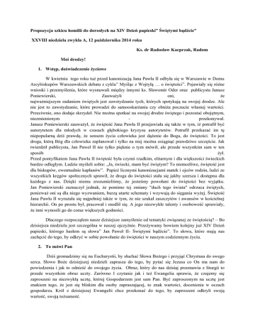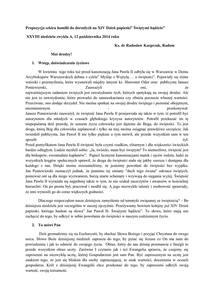 Propozycja szkicu homilii do dorosłych na XIV Dzień papieski” Świętymi bądźcie” XXVIII niedziela zwykła A, 12 października 2014 roku Ks. dr Radosław Kacprzak, Radom Moi drodzy! 1. Wstęp, doświadczenie życiowe W kwietniu tego roku tuż przed kanonizacją Jana Pawła II odbyła się w Warszawie w Domu Arcybiskupów Warszawskich debata z cyklu” Myśląc z Wojtyłą … o świętości”. Pojawiały się różne wnioski i przemyślenia, które wysnuwali między innymi ks. Sławomir Oder oraz publicysta Janusz Poniewierski, Zauważyli oni, że najważniejszym zadaniem świętych jest zawstydzanie tych, których spotykają na swojej drodze. Ale nie jest to zawstydzanie, które prowadzi do samooskarżania czy obniża poczucie własnej wartości. Przeciwnie, ono dodaje skrzydeł. Nie można spotkać na swojej drodze świętego i pozostać obojętnym, niezmienionym przekonywał. Janusz Poniewierski zauważył, że świętość Jana Pawła II przejawiała się także w tym, iż potrafił być autorytetem dla młodych w czasach głębokiego kryzysu autorytetów. Potrafił przekazać im tę niepopularną dziś prawdę, że sensem życia człowieka jest dążenie do Boga, do świętości. To jest droga, którą Bóg dla człowieka zaplanował i tylko na niej można osiągnąć prawdziwe szczęście. Jak twierdził publicysta, Jan Paweł II nie tylko pięknie o tym mówił, ale przede wszystkim sam w ten sposób żył. Przed pontyfikatem Jana Pawła II świętość była czymś rzadkim, elitarnym i dla większości świeckich bardzo odległym. Ludzie myśleli sobie: „Ja, świecki, mam być świętym? To niemożliwe, świętość jest dla biskupów, ewentualnie kapłanów”. Papież licznymi kanonizacjami matek i ojców rodzin, ludzi ze wszystkich kręgów społecznych sprawił, że droga do świętości stała się jakby szersza i dostępna dla każdego z nas. Dzięki niemu zrozumieliśmy, że jesteśmy powołani do świętości bez wyjątku. Jan Poniewierski zaznaczył jednak, że pomimo tej zmiany "duch tego świata" odrzuca świętych, ponieważ oni są dla niego wyzwaniem, burzą utarte schematy i wzywają do sięgania wyżej. Świętość Jana Pawła II wyrażała się najpełniej także w tym, że nie szukał zaszczytów i awansów w kościelnej hierarchii. On po prostu był, pracował i modlił się. A jego niezwykłe talenty i osobowość sprawiały, że inni wynosili go do coraz większych godności. Dlaczego rozpocząłem nasze dzisiejsze zamyślenie od tematyki związanej ze świętością? – Bo dzisiejsza niedziela jest szczególna w naszej ojczyźnie. Przeżywamy bowiem kolejny już XIV Dzień papieski, którego hasłem są słowa” Jan Paweł II- Świętymi bądźcie”. To słowa, które mają nas zachęcić do tego, by odkryć w sobie powołanie do świętości w naszym codziennym życiu. 2. To mówi Pan Dziś gromadzimy się na Eucharystii, by słuchać Słowa Bożego i przyjąć Chrystusa do swego serca. Słowo Boże dzisiejszej niedzieli zaprasza do tego, by pytać się Jezusa co On ma nam do powiedzenia i jak to odnieść do swojego życia. Obraz, który do nas dzisiaj przemawia z liturgii to przede wszystkim obraz uczty. Zarówno I czytanie jak i też Ewangelia sprawia, że czujemy się zaproszeni na niezwykłą ucztę, której Gospodarzem jest sam Pan. Być zaproszonym na ucztę jest znakiem tego, że jest się bliskim dla osoby zapraszającej, to znak wartości, docenienia w oczach gospodarza. Król z dzisiejszej Ewangelii chce przekonać do tego, by zaproszeni odkryli swoją wartość, swoją tożsamość. Jak zareagowali zaproszeni na ucztę weselną przygotowaną przez króla? – Zlekceważyli zaproszenie, znajdując wiele wymówek, by nie spotkać się na niezwykłej uczcie: jeden poszedł na swoje pole, drugi do kupiectwa, a inni pochwycili sługi swego króla i znieważywszy ich pozabijali. Jednym słowem wszyscy, mówiąc językiem współczesnym- mieli to w nosie i nie skorzystali z niezwykłego zaproszenia, które zaproponował im król. Wydaje się, że każdy z zaproszonych chciał tak naprawdę uniknąć osobistej konfrontacji z królem, który być może mógł zapytać również o niewygodne sprawy. Pierwszy zaproszonych to człowiek, który nie jest panem swojego czasu, nie potrafi przejąć steru życia we własne ręce. Przyzwyczaił się do takiego stylu życia i boi się jakichkolwiek zmian. Drugi zaproszony, skoncentrowany na kupiectwie to mówiąc jeżykiem współczesnym-biznesmen, właściciel dobrze prosperującej firmy, która przynosi dochody. Jednak był tak zapracowany, że nie potrafił się zatrzymać. Może nawet gardził tymi, którzy odpoczywali zasiadając przy wspólnym stole. Jego życiem kierował raczej prawo rynku a nie prawo serca. Jest też trzecia grupa zaproszonych. To ci, którzy pochwycili sługi króla i znieważywszy ichpozabijali. To ludzie, których ogarnęło przerażenie, gdy usłyszeli o uczcie. Oni wybrali drogę agresji, i brutalności całkowicie lekceważąc zaproszenie króla, uważając, ze spotkanie z nim nie ma sensu. 3. Aktualizacja, zastosowanie Myślę, że w każdym z nas można by odnaleźć jakieś podobieństwo do bohaterów z dzisiejszej przypowieści. Bo często bywa tak, że znajdujemy tysiąc różnych wymówek, by nie spotkać się na tej niezwykłej uczcie – Eucharystycznej, na którą w każdą niedzielę i święto zaprasza nas Bóg. Tymczasem Jezus chce nam uświadomić, że każdy człowiek ochrzczony zaproszony jest dom osobistego dialogu z Bogiem,który jest możliwy w czasie spotkania na Uczcie Eucharystycznej. Potrzeba więc naszej refleksji nad tym czy przychodząc na Ucztę nie tylko znajduję czas, odpowiednio się ubieram, zajmuję miejsce w ławce, ale czy chcę przede wszystkim rozmawiać z Królem, który zaprasza mnie do niezwykłej współpracy. Do czego jestem jeszcze zaproszony? Myślę, że do tego, by zauważyć, że w czasie spotkania z Bogiem mam okazję, by