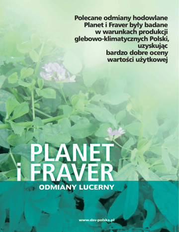Polecane odmiany hodowlane Planet i Fraver by∏y badane w warunkach produkcji glebowo-klimatycznych Polski, uzyskujàc bardzo dobre oceny wartoÊci u˝ytkowej PLANET i FRAVER ODMIANY LUCERNY www.dsv-polska.pl Planet Co decyduje o powodzeniu za∏o˝enia lucernika ? Wymagania glebowe. Pod upraw´ lucerny najbardziej odpowiednie sà gleby kompleksów pszennych, ˝ytniego bardzo dobrego i dobrego oraz zbo˝owo-pastewnego mocnego (klasa bonitacyjna I-IVa). Optymalne pH wynosi 6,5-7,0. Cechuje si´ du˝ym i stabilnym plonowaniem w okresie u˝ytkowania; daje du˝y plon suchej masy, potencjalnie 16-17 ton z hektara i blisko 3 tony bia∏ka rocznie. RoÊliny cechujà si´ dobrà zimotrwa∏oÊcià, szybko odrastajà wiosnà i po koszeniach. Odmiana jest Êrednio podatna na wyleganie. Wykazuje du˝à odpornoÊç na pora˝enie chorobami powodujàcymi wi´dni´cie p´dów lucerny (werticiloz´ i fuzarioz´). Przedplon. Najlepszym przedplonem sà roÊliny okopowe, pod które zastosowano nawozy naturalne. Lucern´ uprawia si´ tak˝e po rzepaku i zbo˝ach. Nie powinno si´ uprawiaç lucerny po roÊlinach stràczkowych i innych motylkowatych. Konieczne jest przygotowanie stanowiska odchwaszczonego!. Trzeba tak˝e unikaç takiego pola, na którym stosowano w du˝ych iloÊciach herbicydy do odchwaszczania roÊlin przedplonowych, zw∏aszcza kukurydzy, buraków i rzepaku. Ich pozosta∏oÊci w glebie mogà uszkodziç siewki lucerny. Odmian´ mo˝na uprawiaç we wszystkich rejonach Polski. W latach o dostatecznej iloÊci opadów najbardziej korzystny jest czterokrotny zbiór plonu w sezonie wegetacyjnym. Uprawa i przygotowanie gleby. Lucerna wymaga bardzo dobrze przygotowanej roli. Wa˝ne jest g∏´bokie spulchnienie gleby i usuni´cie z pola chwastów. Po zbiorze przedplonu nale˝y zastosowaç uprawki odchwaszczajàce, a jesienià wykonaç starannà, g∏´bokà ork´ zimowà. Wiosnà niezb´dne jest w∏ókowanie i bronowanie. Przedsiewnà upraw´ gleby najlepiej przeprowadziç agregatem uprawowym. Powierzchnia pola przed siewem powinna byç wyrównana i optymalnie wilgotna. W przypadku, gdy wierzchnia warstwa jest nadmiernie spulchniona, trzeba jà lekko zwa∏owaç. Fraver Nawo˝enie mineralne. Powinno si´ uwzgl´dniç przede wszystkim silnà reakcj´ lucerny na zakwaszenie gleby oraz jej wymagania pokarmowe. Potrzeba wapnowania wynika z oznaczonej kwasowoÊci i rodzaju gleby. Dawka wapna przewa˝nie wynosi 1,0-2,5 t/ha. Wapnowanie pola najlepiej zastosowaç ju˝ pod przedplon, a najpóêniej pod ork´ zimowà. Nawo˝enie fosforowo-potasowe zale˝y od zawartoÊci w glebie przyswajalnych form tych sk∏adników, uwzgl´dniajàc potrzeby lucerny oraz roÊliny ochronnej. Przedsiewnie wielkoÊç dawek wynosi najcz´Êciej 60-100 kg P2O5 i 100-140 kg K2O na 1 ha. Odpowiednie nawozy najlepiej zastosowaç w trakcie wykonywania uprawek doprawiajàcych gleb´. Tu˝ przed siewem nasion, zaleca si´ wysiaç niewielkà iloÊç nawozów azotowych – 20 kg/ha. W warunkach wsiewki lucerny w roÊlin´ ochronnà dawk´ azotu trzeba zwi´kszyç do oko∏o 60-80 kg/ha. Wytwarza du˝y plon zielonki; plon suchej masy w pierwszym i drugim roku u˝ytkowania mo˝e osiàgaç wielkoÊç oko∏o 17 ton z hektara. Daje rocznie prawie 3 tony bia∏ka z ha. Odmiana jest Êredniowczesna. RoÊliny dobrze zimujà, szybko odrastajà po skoszeniu i sà Êrednio podatne na wyleganie. Stosunkowo dobrze znoszà okresy posuchy. Odmiana przejawia du˝à odpornoÊç na choroby fuzaryjne i werticilioz´ lucerny. Odmiana mo˝e byç uprawiana w ró˝nych rejonach Polski. Przeznaczona jest zw∏aszcza trzy-, czteroletniego intensywnego u˝ytkowania koÊnego. Siew i piel´gnacja zasiewów. Stosowane sà dwa sposoby siewu – bez roÊliny ochronnej lub w roÊlin´ ochronnà. Zaopatrujàc si´ w nasiona odmian o dobrej wartoÊci siewnej wystarczy w korzystnych warunkach wysiew oko∏o 15-20 kg lucerny na 1 hektar, w rozstawie rz´dów 12-15 cm. Nasiona lucerny powinny byç umieszczone p∏ytko w glebie, na g∏´bokoÊci 1-2 cm. Uprawiajàc lucern´ jako wsiewk´ w roÊlin´ ochronnà, najpierw wysiewa si´ zbo˝e, a nast´pnie oddzielnym przejazdem siewnika nasiona lucerny. RoÊlinà ochronnà z regu∏y jest zbo˝e jare, g∏ównie j´czmieƒ. Nale˝y wybieraç ni˝sze odmiany zbó˝, odporniejsze na wyleganie. Konieczne jest tak˝e zmniejszenie o 1/3 normy wysiewu roÊliny ochronnej. Najkorzystniejszy jest wiosenny termin siewu od po∏owy kwietnia do po∏owy maja. Mo˝liwy jest tak˝e letni siew lucerny, który przeprowadza si´ bez roÊliny ochronnej w czerwcu i lipcu, lecz jest on bardziej zawodny. Oko∏o 2-3 tygodnie przed siewem, nasiona powinny byç zaprawione preparatem grzybobójczym. Tu˝ przed siewem zaleca si´ zastosowaç szczepionk´ bakteryjnà Nitragina. Je˝eli po siewie gleba ulegnie zaskorupieniu, trzeba zastosowaç lekki wa∏ kolczasty, aby umo˝liwiç równomierne wschody. W roku siewu najwi´kszym zagro˝eniem dla upraw lucerny jest nadmierne zachwaszczenie. Do zwalczania chwastów mo˝na stosowaç herbicydy zalecane przez Instytut Ochrony RoÊlin. Lucerna uprawiana bez roÊliny ochronnej, w roku siewu, po raz pierwszy powinna byç koszona najwczeÊniej w okresie kwitnienia. Przy tym sposobie uprawy do koƒca wrzeÊnia wykonuje si´ najcz´Êciej dwa zbiory plonu. W przypadku uprawy lucerny jako wsiewki, po zbiorze roÊliny ochronnej, odrost lucerny (Êciernianki) powinien byç skoszony jak najpóêniej, gdy roÊliny dobrze si´ rozrosnà. Nale˝y przestrzegaç zasady, ˝e , poniewa˝ m∏ode roÊliny lucerny sà bardzo wra˝liwe na udeptywanie. DSV Polska Sp. z o.o. ul. Straszewska 70 62-100 Wàgrowiec tel.067/ 26 80 750 fax 067/ 26 80 755 e-mail: [email protected] www.dsv-polska.pl