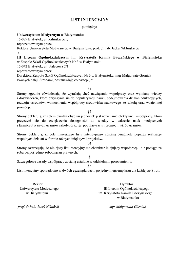 LIST INTENCYJNY pomiędzy: Uniwersytetem Medycznym w Białymstoku 15-089 Białystok, ul. Kilińskiego1, reprezentowanym przez: Rektora Uniwersytetu Medycznego w Białymstoku, prof. dr hab. Jacka Niklińskiego a III Liceum Ogólnokształcącym im. Krzysztofa Kamila Baczyńskiego w Białymstoku w Zespole Szkół Ogólnokształcących Nr 3 w Białymstoku 15-042 Białystok, ul. Pałacowa 2/1, reprezentowanym przez: Dyrektora Zespołu Szkół Ogólnokształcących Nr 3 w Białymstoku, mgr Małgorzatę Górniak zwanych dalej Stronami, postanawiają co następuje: §1 Strony zgodnie oświadczają, że wyrażają chęć nawiązania współpracy oraz wymiany wiedzy i doświadczeń, które przyczynią się do popularyzacji nauki, podejmowania działań edukacyjnych, rozwoju ośrodków, wzmocnienia współpracy środowiska naukowego ze szkołą oraz wzajemnej promocji. §2 Strony deklarują, iż celem działań obydwu jednostek jest rozwijanie efektywnej współpracy, która przyczyni się do zwiększenia dostępności do wiedzy w zakresie nauk medycznych i farmaceutycznych uczniów szkoły, oraz jej popularyzacji i promocji wśród uczniów. §3 Strony deklarują, iż cele niniejszego listu intencyjnego zostaną osiągnięte poprzez realizację wspólnych działań w formie różnych inicjatyw i projektów. §4 Strony zastrzegają, że niniejszy list intencyjny ma charakter inicjujący współpracę i nie pociąga za sobą bezpośrednio zobowiązań prawnych. § Szczegółowe zasady współpracy zostaną ustalone w oddzielnym porozumieniu. §5 List intencyjny sporządzono w dwóch egzemplarzach, po jednym egzemplarzu dla każdej ze Stron. Rektor Uniwersytetu Medycznego w Białymstoku prof. dr hab. Jacek Nikliński Dyrektor III Liceum Ogólnokształcącego im. Krzysztofa Kamila Baczyńskiego w Białymstoku mgr Małgorzata Górniak