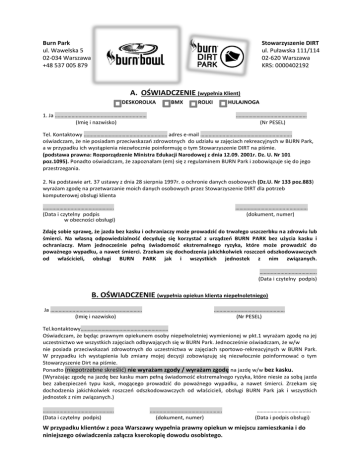 Burn Park ul. Wawelska 5 02-034 Warszawa +48 537 005 879 Stowarzyszenie DIRT ul. Puławska 111/114 02-620 Warszawa KRS: 0000402192 A. OŚWIADCZENIE (wypełnia Klient) DESKOROLKA BMX ROLKI HULAJNOGA 1. Ja ………………………………………………………… (Imię i nazwisko) …………………………………………… (Nr PESEL) Tel. Kontaktowy …………………………………………………… adres e-mail ………………………………………………………… oświadczam, że nie posiadam przeciwskazao zdrowotnych do udziału w zajęciach rekreacyjnych w BURN Park, a w przypadku ich wystąpienia niezwłocznie poinformuję o tym Stowarzyszenie DIRT na piśmie. (podstawa prawna: Rozporządzenie Ministra Edukacji Narodowej z dnia 12.09. 2001r. Dz. U. Nr 101 poz.1095). Ponadto oświadczam, że zapoznałam (em) się z regulaminem BURN Park i zobowiązuje się do jego przestrzegania. 2. Na podstawie art. 37 ustawy z dnia 28 sierpnia 1997r. o ochronie danych osobowych (Dz.U. Nr 133 poz.883) wyrażam zgodę na przetwarzanie moich danych osobowych przez Stowarzyszenie DIRT dla potrzeb komputerowej obsługi klienta ……………………………………….….. (Data i czytelny podpis w obecności obsługi) ……………………………………………. (dokument, numer) Zdaję sobie sprawę, że jazda bez kasku i ochraniaczy może prowadzid do trwałego uszczerbku na zdrowiu lub śmierci. Na własną odpowiedzialnośd decyduję się korzystad z urządzeo BURN PARK bez użycia kasku i ochraniaczy. Mam jednocześnie pełną świadomośd ekstremalnego ryzyka, które może prowadzid do poważnego wypadku, a nawet śmierci. Zrzekam się dochodzenia jakichkolwiek roszczeo odszkodowawczych od właścicieli, obsługi BURN PARK jak i wszystkich jednostek z nim związanych. ………………………………….. (Data i czytelny podpis) B. OŚWIADCZENIE (wypełnia opiekun klienta niepełnoletniego) Ja ………………………………………………………… (Imię i nazwisko) …………………………………………… (Nr PESEL) Tel.kontaktowy……………………………………………………… Oświadczam, że będąc prawnym opiekunem osoby niepełnoletniej wymienionej w pkt.1 wyrażam zgodę na jej uczestnictwo we wszystkich zajęciach odbywających się w BURN Park. Jednocześnie oświadczam, że w/w nie posiada przeciwskazao zdrowotnych do uczestnictwa w zajęciach sportowo-rekreacyjnych w BURN Park. W przypadku ich wystąpienia lub zmiany mojej decyzji zobowiązuję się niezwłocznie poinformowad o tym Stowarzyszenie Dirt na piśmie. Ponadto (niepotrzebne skreślid) nie wyrażam zgody / wyrażam zgodę na jazdę w/w bez kasku. (Wyrażając zgodę na jazdę bez kasku mam pełną świadomośd ekstremalnego ryzyka, które niesie za sobą jazda bez zabezpieczeo typu kask, mogącego prowadzid do poważnego wypadku, a nawet śmierci. Zrzekam się dochodzenia jakichkolwiek roszczeo odszkodowawczych od właścicieli, obsługi BURN Park jak i wszystkich jednostek z nim związanych.) ……………………………………….….. (Data i czytelny podpis) ……………………………………………. (dokument, numer) ………………………………… (Data i podpis obsługi) W przypadku klientów z poza Warszawy wypełnia prawny opiekun w miejscu zamieszkania i do niniejszego oświadczenia załącza kserokopię dowodu osobistego.