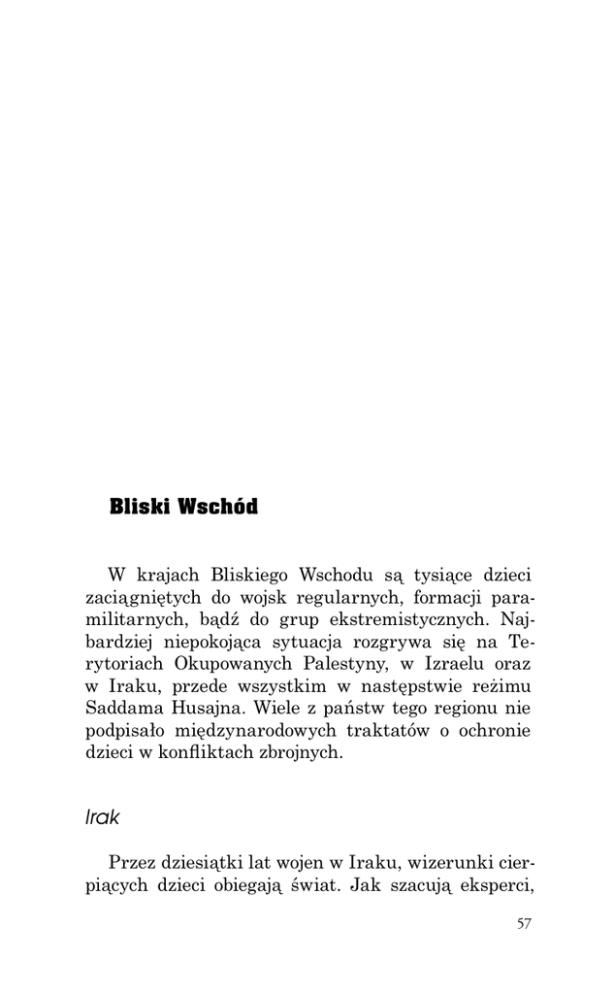 kiem İycia, zostaje „zaadoptowanych” przez rosyjskie struktury wojskowe. ChodzĈ do szkoãy, otrzymujĈ İoãnierskie przeszkolenie, a w niektórych przypadkach, mieszkajĈ w koszarach. Nie ma natomiast İadnych informacji na temat ich zaangaİowania w strefach konfliktów85. Jak podaje Global Report, przypadki przymusowej rekrutacji zarejestrowano w Armenii i Tadİykistanie. W Turkmenistanie obniİony zostaã do 17 lat minimalny wiek werbunku ochotniczego, bĈdĮ przymusowego, bez pozostawienia moİliwoĤci zastĈpienia obowiĈzku wojskowego innym rodzajem sãuİby, z powodów osobistych przekonaę, natomiast w Estonii sãuİbč wojskowĈ odbywa sič po ukoęczeniu 16 lat. Bliski Wschód W krajach Bliskiego Wschodu sĈ tysiĈce dzieci zaciĈgničtych do wojsk regularnych, formacji paramilitarnych, bĈdĮ do grup ekstremistycznych. Najbardziej niepokojĈca sytuacja rozgrywa sič na Terytoriach Okupowanych Palestyny, w Izraelu oraz w Iraku, przede wszystkim w nastčpstwie reİimu Saddama Husajna. Wiele z paęstw tego regionu nie podpisaão mičdzynarodowych traktatów o ochronie dzieci w konfliktach zbrojnych. Irak Przez dziesiĈtki lat wojen w Iraku, wizerunki cierpiĈcych dzieci obiegajĈ Ĥwiat. Jak szacujĈ eksperci, 57 wskaĮnik umieralnoĤci dzieci poniİej 5 roku İycia wynosi 130 na 1 000 urodzeę. Ponadto, 22% dzieci mniej niİ 5-letnich, dotkničtych jest problemami niedoİywienia, co jest wynikiem wielu lat sankcji. 11 milionów mãodych poniİej 18 roku İycia (okoão 50% populacji irackiej) cierpi w efekcie z sankcji, okaleczeę przez miny przeciwpiechotne, jak i z wielu innych powodów. Wiele dzieci wzičão czynny udziaã w konfliktach, które szarpaãy krajem, aİ do momentu doprowadzenia go, w 2003 roku, do ruiny86. Faktycznie przypuszcza sič, iİ dzieci byãy zaangaİowane jako İoãnierze w konflikcie Iran-Irak (1980 -1989), w Wojnie w Zatoce Perskiej (1991) oraz w ostatnim konflikcie, który poãoİyã kres reİimowi Saddama Husajna. W Iraku Raìsa, prawo zezwalaão na ochotniczy werbunek w wieku 15 lat, a w okresach wojny mãodzi mogli byþ wzywani pod broę, nawet gdy nie mieli jeszcze ukoęczonych 18 lat. Szacuje sič, iİ w 2002 roku w szeregach irackich siã zbrojnych znajdowaão sič okoão 1 000 mãodych ludzi. Reİim, aby zasiliþ swojĈ milicjč, nie pozostawaã jedynie przy tradycyjnej rekrutacji. RozwinĈã caãy system szkolny, zmierzajĈc tym samym w kierunku przeprowadzania szkoleę i przygotowywania mãodzieİy do wojny, oraz w perspektywie – militaryzacji irackiego spoãeczeęstwa i kultury87. Szkoãy te byãy uczčszczane zarówno przez chãopców, jak i przez dziewczčta juİ od wieku 10 lat. Najwaİniejszymi kursami szkoleniowymi byãy „Raad” i „al-Anfal”, przez które przeszãy ponad 23 tysiĈce dzieci, a takİe „Ashbal Saddam” (LwiĈtka Lwa Saddama), który wyksztaãciã okoão 8 000 dzieci. Ta jednostka paramilitarna, utworzona w 1991 roku po Wojnie w Zatoce, byãa ĤciĤle zwiĈzana z „Fedayeen Saddam” (Ludzie oddani Saddamowi), milicja dowodzona przez Udaya, najstarszego syna dyktatora. 58 W raporcie amerykaęskiego Departamentu Stanu, zatytuãowanym Iraq: A Population Silenced („Irak: ludnoĤþ zmuszona do milczenia”), à propos „Ashbal Saddam”, czytamy, İe reİim zmusza „dzieci mičdzy 10 a 15 rokiem İycia do uczčszczania na trzytygodniowe kursy nauki obsãugi broni, walki „czãowiek-czãowiek” oraz taktyk piechoty. Dzieci te znoszĈ 14 godzin dziennie szkolenia fizycznego i presji psychicznej.” Raport dodaje, iİ jeĤli rodziny opierajĈ sič, by ich dzieci staãy sič İoãnierzami Saddama, „grozi im sič utratĈ karty, dajĈcej prawo do poİywienia88. Obok „Ashbal Saddam”, byãa takİe „Youth Civil Defense Force”, rekrutujĈca dzieci od 12 do 17 lat, oraz „al-Quds”: obydwie grupy majĈ w swoich strukturach İoãnierzy zarówno pãci mčskiej, jak i İeęskiej89. Tak samo uzbrojone grupy opozycyjne wewnĈtrz Iraku uciekaãy sič do wykorzystywania dzieci-İoãnierzy. Oszacowano, iİ w 1998 roku Partia PracujĈcych Kurdystanu (PKK), miaãa w swych szeregach okoão 3 000 nastolatków, z których ponad 10% stanowiãy dziewczynki. Z niektórych Įródeã wynika, İe PKK posãugiwaãa sič nieletnimi od 1994 roku, jak równieİ powoãaãa do İycia batalion zãoİony z samej mãodzieİy pod nazwĈ „Tabura Zaroken Sehit Agit”. Natomiast Patriotyczna Unia Kurdystanu (PUK), kolejny iracki ruch oporu, w swoich szeregach mieĤciã dziesičcioletnie dzieci90. W sierpniu 2004, Sunday Herald podniósã w swoim badaniu problem nieletnich zamkničtych w wičzieniach mičdzynarodowej koalicji, której przewodniczĈ Stany Zjednoczone. Jednym z takich miejsc jest Abu Ghraib, które niechlubnie zasãynčão z aktów przemocy, mičdzy innymi z tego, jak sfotografowano pewnĈ 21-letniĈ İoãnierkč amerykaęskĈ, gdy trzymaãa na smyczy nagiego wičĮnia irackiego. Wedãug Neila Mackaya, odpowiedzialnego za badanie, w wičzieniach przetrzymywano ponad 100 dzieci, nawet 10 -letnich, które poddawane byãy przemocy i torturom91. 59 Dziennikarz przywoãaã oĤwiadczenia kilku osób, które byãy obecne przy tego typu czynach. Naoczny Ĥwiadek, Kasim Mehaddi Hilas, zeznaã, İe widziaã İoãnierza zadajĈcego gwaãt pičtnastolatkowi w wičzieniu Abu Ghraib, oraz dodaã, İe wszystkie drzwi zostaãy wczeĤniej uszczelnione, aby na zewnĈtrz nie byão sãychaþ krzyków. Thaar Salman Dawod, byãy wičzieę, wyznaã Sunday Herald, iİ uczestniczyã w torturach dwóch nagich chãopców, których policzkowano, podczas gdy İoãnierz amerykaęski okãadaã ich kijem. Wedãug opowiadania Ĥwiadka, przy zdarzeniu byãa obecna grupa wojskowych, którzy robili zdjčcia, a trzy İoãnierki wyĤmiewaãy wičĮniów. W raporcie Sunday Herald znajduje sič takİe oĤwiadczenie kilku wysokich urzčdników Pentagonu, którzy potwierdzili obecnoĤþ 14-letnich dzieci w amerykaęskich wičzieniach na terytorium Iraku, za