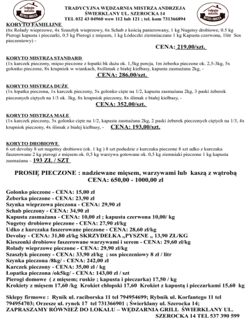 TRADYCYJNA WĘDZARNIA MISTRZA ANDRZEJA ŚWIERKLANY UL. SZEROCKA 14 TEL 032 43 04960 wew 112 lub 121 ; tel. kom 731366894 KORYTO FAMILIJNE (6x Rolady wieprzowe, 4x Szaszłyk wieprzowy, 6x Schab z kością panierowany, 1 kg Nugetsy drobiowe, 0.5 kg Pierogi kapusta i pieczarki, 0.5 kg Pierogi z mięsem, 1 kg Łódeczki ziemniaczane 1 kg Kapusta czerwona, 1litr Sos pieczeniowy) - CENA: 219,00/szt. KORYTO MISTRZA STANDARD (1x karczek pieczony, mięso pieczone z łopatki bk duża ok. 1,5kg porcja, 1m żeberka pieczone ok. 2,5-3kg, 5x golonko pieczone, 8x krupniok w wiankach, 8xślimak z białej kiełbasy, kapusta zasmażana 2kg, - CENA: 286,00/szt. KORYTO MISTRZA DUŻE (1x łopatka pieczona, 1x karczek pieczony, 5x golonko cięte na 1/2, kapusta zasmażana 2kg, 3 paski żeberek pieczonych ciętych na 1/3 ok. 3kg, 8x krupniok pieczony, 8x ślimak z białej kiełbasy, - CENA: 352,00/szt. KORYTO MISTRZA MAŁE (1x karczek pieczony, 3x golonko cięte na 1/2, kapusta zasmażana 2kg, 2 paski żeberek pieczonych ciętych na 1/3, 4x krupniok pieczony, 4x ślimak z białej kiełbasy, - CENA: 193,00/szt. KORYTO DROBIOWE 6 szt devolay 8 szt nugettsy drobiowe (ok. 1 kg ) 8 szt podudzie z kurczaka pieczone 8 szt udko z kurczaka faszerowane 2 kg pierogi z mięsem ok. 0,5 kg warzywa gotowane ok. 0,5 kg ziemniaki pieczone 1 kg kapusta zasmażana – 193 ZŁ / SZT PROSIĘ PIECZONE : nadziewane mięsem, warzywami lub kaszą z wątrobą CENA: 650,00 - 1000,00 zł Golonko pieczone - CENA: 15,00 zł Żeberka pieczone - CENA: 23,90 zł Szynka wieprzowa pieczona - CENA: 29,90 zł Schab pieczony - CENA: 34,90 zł Kapusta zasmażana - CENA: 10,00 zł ; kapusta czerwona 10,00/ kg Nugetsy drobiowe pieczone - CENA: 27,90 zł/kg Udko z kurczaka faszerowane pieczone - CENA: 28,60 zł/kg Devolay - CENA: 31,80 zł/kg SKRZYDEŁKA „PYSZNE „ 13,90 ZŁ/KG Kieszonki drobiowe faszerowane warzywami i serem - CENA: 29,60 zł/kg Rolady wieprzowe pieczone - CENA: 29,90 zł/kg Szaszłyk pieczony - CENA: 33,90 zł/kg ; sos pieczeniowy 8 zł / litr Szynka pieczona /8kg/ - CENA: 242,00 zł Karczek pieczony - CENA: 35,00 zł / kg Łopatka pieczona /ok5kg/ - CENA: 143,00 zł / szt Pierogi domowe ( z mięsem; ruskie ; kapusta i pieczarka) 17,50 / kg Krokiety z mięsem 17,60 /kg Krokiet chłopski 17,60 Krokiet z kapustą i pieczarkami 15,60 kg Sklepy firmowe : Rynik ul. raciborska 11 tel 794954699; Rybnik ul. Korfantego 11 tel 794954703; Orzesze ul. rynek 17 tel 731366901 ; Świerklany ul. Szerocka 14; ZAPRASZAMY RÓWNIEŻ DO LOKALU – WĘDZARNIA GRILL ŚWIERKLANY UL. SZEROCKA 14 TEL 537 390 599
