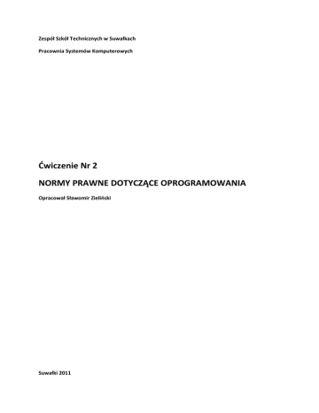 Zespół Szkół Technicznych w Suwałkach Pracownia Systemów Komputerowych Ćwiczenie Nr 2 NORMY PRAWNE DOTYCZĄCE OPROGRAMOWANIA Opracował Sławomir Zieliński Suwałki 2011 Cel ćwiczenia Zapoznanie z typami licencji oprogramowania oraz z podstawowymi normami prawnymi regulującymi dystrybucję programów komputerowych Zadania 1. Na podstawie podręcznika podać, jakie prawo chroni autorów oprogramowania w Polsce. 2. Co wolno a czego nie wolno użytkownikowi oprogramowania w świetle prawa w Polsce? 3. Podaj możliwe przykłady naruszenia praw autorskich przy pisaniu sprawozdań laboratoryjnych w ramach obecnych zajęć. 4. Wymień, co nie podlega prawu autorskiemu. 5. Wyjaśnij, czym jest licencja na oprogramowanie. 6. Co wolno, a czego nie wolno czynić z oprogramowaniem o licencji typu ‘freeware’? 7. Na podstawie podręcznika oraz dostępnej literatury wyjaśnij, co obejmuje licencja typu ‘GNU GPL’. 8. Podaj przykłady dwóch programów chronionych licencją ‘GNU GPL’. 9. Jaka jest zaleta licencji typu ‘GNU GPL’ w porównaniu z innymi typami licencji? 10. Przy pomocy tabeli porównaj najbardziej popularne typy licencji oprogramowania. 11. Wyjaśnij, czym jest piractwo komputerowe. 12. Wykonaj Ćwiczenie 1.2 z podręcznika. W sprawozdaniu streść wnioski z tego ćwiczenia i podaj odpowiedni odnośnik literaturowy do źródła wykorzystywanej informacji. 13. Wykonaj Ćwiczenie 1.3 z podręcznika. W tabeli podsumuj najważniejsze przepisy kodeksu karnego związanego z informatyką. Podaj numery artykułów oraz odpowiednie odnośniki literaturowe do źródeł wykorzystywanej informacji. Opracowanie Odpowiedzi do powyższych pytań należy przekazać nauczycielowi w postaci pisemnego sprawozdania na zakończenie danego ćwiczenia.