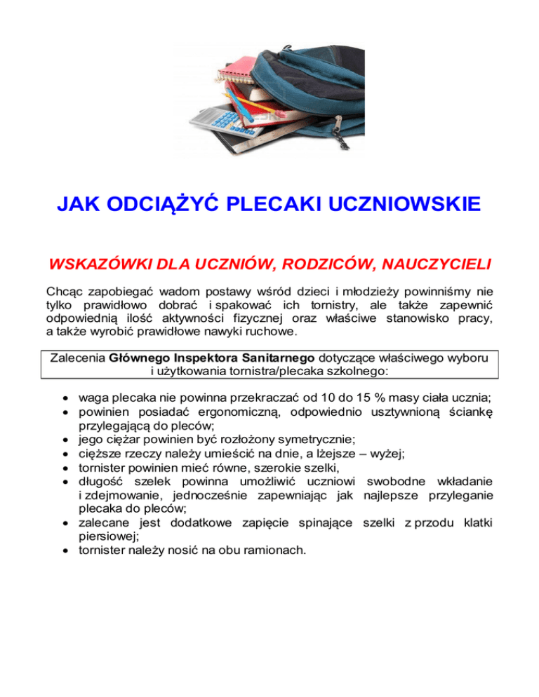 JAK ODCIĄŻYĆ PLECAKI UCZNIOWSKIE WSKAZÓWKI DLA UCZNIÓW, RODZICÓW, NAUCZYCIELI Chcąc zapobiegać wadom postawy wśród dzieci i młodzieży powinniśmy nie tylko prawidłowo dobrać i spakować ich tornistry, ale także zapewnić odpowiednią ilość aktywności fizycznej oraz właściwe stanowisko pracy, a także wyrobić prawidłowe nawyki ruchowe. Zalecenia Głównego Inspektora Sanitarnego dotyczące właściwego wyboru i użytkowania tornistra/plecaka szkolnego: waga plecaka nie powinna przekraczać od 10 do 15 % masy ciała ucznia; powinien posiadać ergonomiczną, odpowiednio usztywnioną ściankę przylegającą do pleców; jego ciężar powinien być rozłożony symetrycznie; cięższe rzeczy należy umieścić na dnie, a lżejsze – wyżej; tornister powinien mieć równe, szerokie szelki, długość szelek powinna umożliwić uczniowi swobodne wkładanie i zdejmowanie, jednocześnie zapewniając jak najlepsze przyleganie plecaka do pleców; zalecane jest dodatkowe zapięcie spinające szelki z przodu klatki piersiowej; tornister należy nosić na obu ramionach. Rodzice!!! zwracajcie uwagę na rodzaj materiału, z jakiego został wykonany tornister lub plecak (waga pustego tornistra waha się od 0,5 kg do 2 kg); kupujcie zeszyty najwyżej 32 – kartkowe w cienkich okładkach; w miarę możliwości zamieniajcie grubsze zeszyty na cieńsze; systematycznie kontrolujcie, co Wasze dziecko pakuje do tornistra; sprawdzajcie, czy Wasze dziecko nie nosi przedmiotów nie związanych bezpośrednio z programem nauczania, takich jak: pamiętniki, albumy, zabawki, itp. oraz dodatkowe słowniki i książki; na bieżąco sprawdzajcie zawartość piórnika; sprawdzajcie, czy dziecko spakowane jest zgodnie z planem lekcji; zwróćcie uwagę na to, w jaki sposób dziecko nosi swój plecak – czy uczeń nosi plecak tylko na jednym, czy na obu ramionach; pakując tornister, pamiętajcie, aby Wasze dziecko wykorzystało wszystkie przegrody i kieszenie; dawajcie dziecku napoje w plastikowych butelkach. Uczniowie!!! noście plecaki na obu ramionach; pakując plecak, pamiętajcie o wykorzystaniu wszystkich przegródek i kieszeni; pakujcie plecak zgodnie z planem lekcji na dany dzień tygodnia; wypakujcie podręczniki i ćwiczenia, które nie są Wam potrzebne na następny dzień; nie noście zbędnych, niepotrzebnych rzeczy do szkoły; zapiszcie w zeszytach przedmiotowych, których podręczników i przyborów nie musicie nosić – zgodnie ze wskazówkami Waszych nauczycieli; Nauczyciele!!! rozmawiajcie z uczniami o konsekwencjach zdrowotnych noszenia zbyt ciężkich plecaków; przygotujcie miejsce w swojej sali, w którym uczniowie będą mogli zostawiać podręczniki i przybory oraz wskażcie je uczniom; codziennie przekazujcie uczniom, które podręczniki i przybory mogą zostawić w domu; w miarę możliwości wykorzystujcie dostępne w szkole dodatkowe podręczniki. STOP CIĘŻKIM PLECAKOM!!!