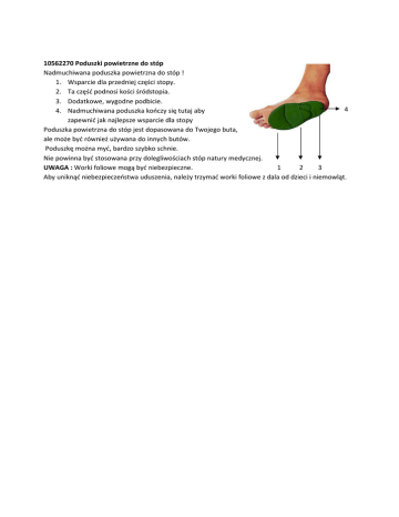 10562270 Poduszki powietrzne do stóp Nadmuchiwana poduszka powietrzna do stóp ! 1. Wsparcie dla przedniej części stopy. 2. Ta część podnosi kości śródstopia. 3. Dodatkowe, wygodne podbicie. 4 4. Nadmuchiwana poduszka kończy się tutaj aby zapewnić jak najlepsze wsparcie dla stopy Poduszka powietrzna do stóp jest dopasowana do Twojego buta, ale może być również używana do innych butów. Poduszkę można myć, bardzo szybko schnie. Nie powinna być stosowana przy dolegliwościach stóp natury medycznej. UWAGA : Worki foliowe mogą być niebezpieczne. 1 2 3 Aby uniknąć niebezpieczeństwa uduszenia, należy trzymać worki foliowe z dala od dzieci i niemowląt.