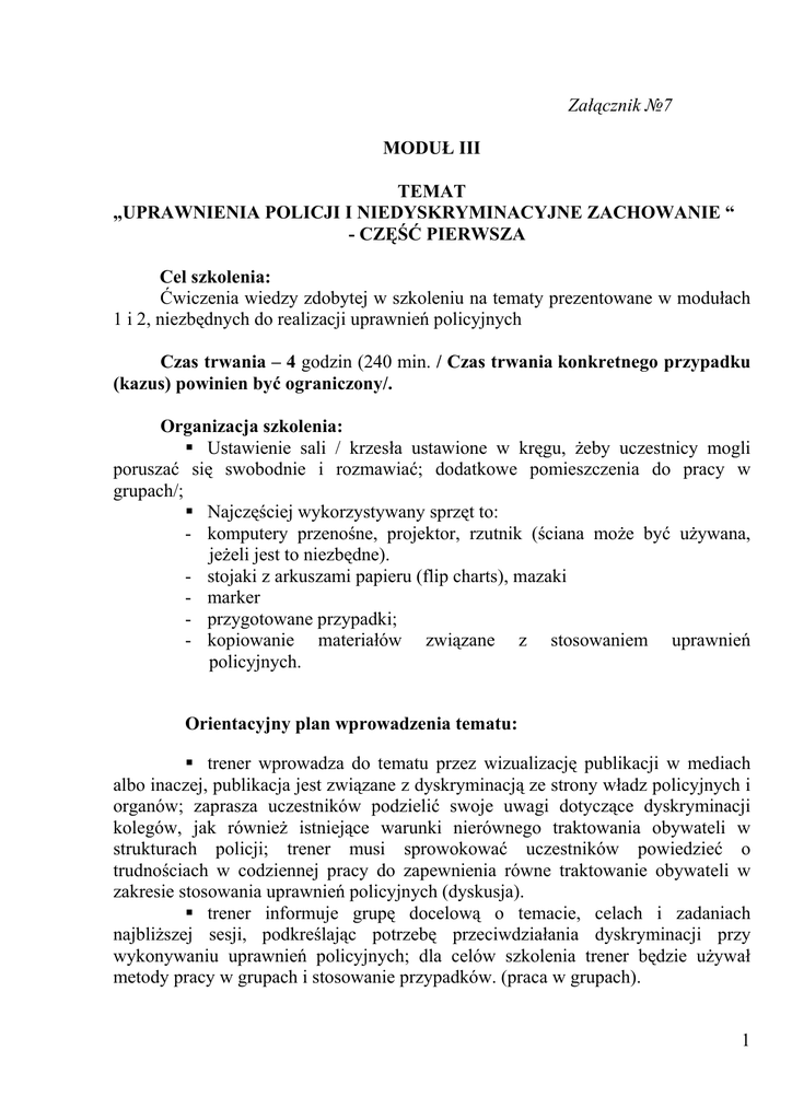 Załącznik №7 MODUŁ ІІI TEMAT „UPRAWNIENIA POLICJI I NIEDYSKRYMINACYJNE ZACHOWANIE “ - CZĘŚĆ PIERWSZA Cel szkolenia: Ćwiczenia wiedzy zdobytej w szkoleniu na tematy prezentowane w modułach 1 i 2, niezbędnych do realizacji uprawnień policyjnych Czas trwania – 4 godzin (240 min. / Czas trwania konkretnego przypadku (kazus) powinien być ograniczony/. Organizacja szkolenia: Ustawienie sali / krzesła ustawione w kręgu, żeby uczestnicy mogli poruszać się swobodnie i rozmawiać; dodatkowe pomieszczenia do pracy w grupach/; Najczęściej wykorzystywany sprzęt to: - komputery przenośne, projektor, rzutnik (ściana może być używana, jeżeli jest to niezbędne). - stojaki z arkuszami papieru (flip charts), mazaki - marker - przygotowane przypadki; - kopiowanie materiałów związane z stosowaniem uprawnień policyjnych. Orientacyjny plan wprowadzenia tematu: trener wprowadza do tematu przez wizualizację publikacji w mediach albo inaczej, publikacja jest związane z dyskryminacją ze strony władz policyjnych i organów; zaprasza uczestników podzielić swoje uwagi dotyczące dyskryminacji kolegów, jak również istniejące warunki nierównego traktowania obywateli w strukturach policji; trener musi sprowokować uczestników powiedzieć o trudnościach w codziennej pracy do zapewnienia równe traktowanie obywateli w zakresie stosowania uprawnień policyjnych (dyskusja). trener informuje grupę docelową o temacie, celach i zadaniach najbliższej sesji, podkreślając potrzebę przeciwdziałania dyskryminacji przy wykonywaniu uprawnień policyjnych; dla celów szkolenia trener będzie używał metody pracy w grupach i stosowanie przypadków. (praca w grupach). 1 Grupa docelowa wyświetla podstawowe funkcje policyjne / stosowane w ustawie/, trener pisze na flipcharcie uprawnienia i obowiązki policji (burza mozgów) trener robi podział uczestników na małe grupy, składające się z 5-6 osób i postawienie im określonego zadania; jedna osoba musi przedstawić przypadka trener postawia uczestnikom określonego zadania; zadania, związane z: - wprowadzeniem i omówieniem przypadków; - identyfikacją problemu/problemów dyskryminacji z pewnych cech; - uzasadnienie prawne problemu / problemów związanych z dyskryminacją; - formułowanie zaleceń. rozdawanie przypadków i materiałów/papier dla flipczartu i markery/ informacja odwrotna o gotowości grup do pracy praca w grupach w określonym terminie i zgodnie z zadaniami / na wniosek grupy, trener prowadza dodatkowe wyjaśnienia i wskazówki i nie dając odpowiedzi /. prezentacji wyników, które wcześniej zostały zapisane na flipczarcie: - prezentacja przypadku; - sformułowanie problemu i argumentacja prawna; - przedstawienie zaleceń; dyskusja w sprawie decyzji przez grupę w celu sformułowania ogólnych wniosków. zawarcie sprawy na podstawie ogólnej dyskusji i wyświetlenie podstawowe zasady postępowania na mocy zasady niedyskryminacji (trener pisze na flipczarcie wyświetlone zasady, takie jak użycie siły i środki pomocnicze). powyższa sekwencja odnosi się do wszystkich spraw rozpatrywanych trener podsumowuje pracę grupy i dziękuje za staranność, rozpoznając najbardziej aktywnych uczestników; zapewnia dodatkowe zalecenia i źródła dodatkowej informacji, określa zadania dla uczestników. / opracować, w miarę potrzeby, analizy przypadku/. Ocena działań funkcjonariuszy policji: 1. Które z działań policjantów, zawierają elementy dyskryminacji? 2. Które z działań policjantów są legalne a które nie? 3. Co byś zrobił w takiej sytuacji? 2