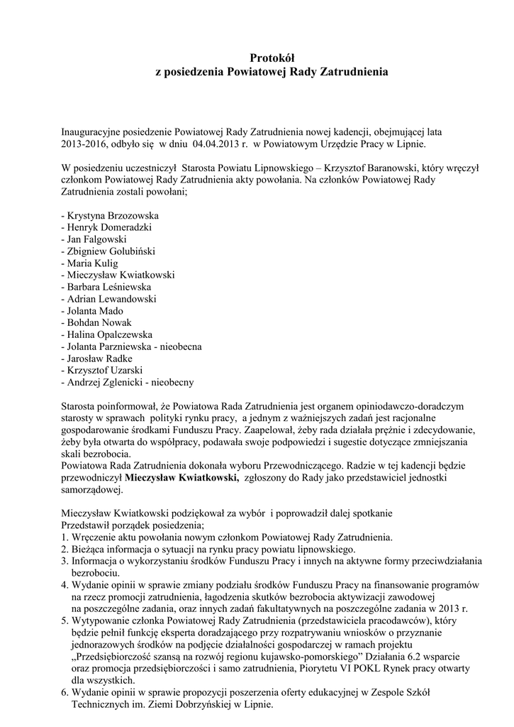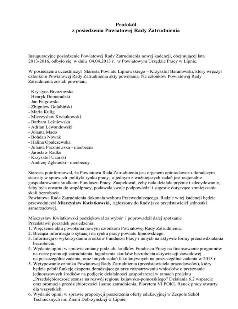 Protokół z posiedzenia Powiatowej Rady Zatrudnienia Inauguracyjne posiedzenie Powiatowej Rady Zatrudnienia nowej kadencji, obejmującej lata 2013-2016, odbyło się w dniu 04.04.2013 r. w Powiatowym Urzędzie Pracy w Lipnie. W posiedzeniu uczestniczył Starosta Powiatu Lipnowskiego – Krzysztof Baranowski, który wręczył członkom Powiatowej Rady Zatrudnienia akty powołania. Na członków Powiatowej Rady Zatrudnienia zostali powołani; - Krystyna Brzozowska - Henryk Domeradzki - Jan Falgowski - Zbigniew Golubiński - Maria Kulig - Mieczysław Kwiatkowski - Barbara Leśniewska - Adrian Lewandowski - Jolanta Mado - Bohdan Nowak - Halina Opalczewska - Jolanta Parzniewska - nieobecna - Jarosław Radke - Krzysztof Uzarski - Andrzej Zglenicki - nieobecny Starosta poinformował, że Powiatowa Rada Zatrudnienia jest organem opiniodawczo-doradczym starosty w sprawach polityki rynku pracy, a jednym z ważniejszych zadań jest racjonalne gospodarowanie środkami Funduszu Pracy. Zaapelował, żeby rada działała prężnie i zdecydowanie, żeby była otwarta do współpracy, podawała swoje podpowiedzi i sugestie dotyczące zmniejszania skali bezrobocia. Powiatowa Rada Zatrudnienia dokonała wyboru Przewodniczącego. Radzie w tej kadencji będzie przewodniczył Mieczysław Kwiatkowski, zgłoszony do Rady jako przedstawiciel jednostki samorządowej. Mieczysław Kwiatkowski podziękował za wybór i poprowadził dalej spotkanie Przedstawił porządek posiedzenia; 1. Wręczenie aktu powołania nowym członkom Powiatowej Rady Zatrudnienia. 2. Bieżąca informacja o sytuacji na rynku pracy powiatu lipnowskiego. 3. Informacja o wykorzystaniu środków Funduszu Pracy i innych na aktywne formy przeciwdziałania bezrobociu. 4. Wydanie opinii w sprawie zmiany podziału środków Funduszu Pracy na finansowanie programów na rzecz promocji zatrudnienia, łagodzenia skutków bezrobocia aktywizacji zawodowej na poszczególne zadania, oraz innych zadań fakultatywnych na poszczególne zadania w 2013 r. 5. Wytypowanie członka Powiatowej Rady Zatrudnienia (przedstawiciela pracodawców), który będzie pełnił funkcję eksperta doradzającego przy rozpatrywaniu wniosków o przyznanie jednorazowych środków na podjęcie działalności gospodarczej w ramach projektu „Przedsiębiorczość szansą na rozwój regionu kujawsko-pomorskiego” Działania 6.2 wsparcie oraz promocja przedsiębiorczości i samo zatrudnienia, Piorytetu VI POKL Rynek pracy otwarty dla wszystkich. 6. Wydanie opinii w sprawie propozycji poszerzenia oferty edukacyjnej w Zespole Szkół Technicznych im. Ziemi Dobrzyńskiej w Lipnie. 7. Wydanie opinii w sprawie celowości programu specjalnego. 8. Wolne wnioski, dyskusja. Porządek posiedzenia został przyjęty jednogłośnie. Punkt 2 omówił Dyrektor Powiatowego Urzędu Pracy – Mieczysław Rojek. Poinformował, że stopa bezrobocia na koniec lutego br na terenie kraju wynosiła 14,4% , na terenie województwa 19,1% a na terenie powiatu 29,5 %. Na koniec marca liczba bezrobotnych wynosi 7.147 osób. Na koniec grudnia 2012 r. stopa bezrobocia w woj. kujawsko-pomorskim wynosiła 17,9% . W 2012 r. ogółem Urząd Pracy posiadał 2.160 ofert pracy. W I kwartale 2013 r. były 1.254 oferty. Następnie przedstawił strukturę osób bezrobotnych wg wykształcenia, wieku , czasu pozostawania w rejestrze osób bezrobotnych a także wg stażu pracy. Rośnie liczba osób bezrobotnych z wykształceniem wyższym, największą liczbę stanowią osoby zarejestrowane, które ukończyły studia o kierunku – pedagogika lub administracja.. Następnie Dyrektor omówił punkt 3 dotyczący wykorzystania środków Funduszu Pracy. Poinformował, że limit środków Funduszu Pracy przyznany wg algorytmu został zwiększony o 8.300,- zł i w związku z tym jest konieczny podział środków, który przedstawia się następująco; - prace interwencyjne - 2.000.000,- szkolenia i przekwalifikowania 50.000,- staż - 1.645.000,- badania lekarskie 50.000,- prace społecznie użyteczne 814.060,- dotacje dla przedsiębiorców 300.000,- refundacja kosztów dojazdu i zakwaterowania 300.000,- opieka nad dzieckiem 8.300,- stypendium z tytułu nauki 32.000,- programy specjalne 684.240,Ogółem : 5.883.600,Na dzień 31.03.2013 r. zaangażowane środki wynosiły 5.120.613,24 zł. Pozostało jeszcze wolnych środków 754.686,76 zł. Po przedstawieniu informacji o wykorzystaniu środków finansowych – Przewodniczący Powiatowej Rady Zatrudnienia odczytał treść uchwały nr 4/2013 z dnia 04.04.2013 r. w sprawie zaopiniowania zmiany podziału środków Funduszu Pracy na aktywne formy przeciwdziałania bezrobociu i innych fakultatywnych zadań będących w dyspozycji PUP w Lipnie na rok 2013 r. Za przyjęciem uchwały głosowało - 13 członków Przeciw - -------Wstrzymało się od głosu - -------Uchwała stanowi integralną część niniejszego protokołu. Traci moc uchwała nr 1/2013 z dnia 11 stycznia 2013 roku. Następnie dokonano wyboru eksperta doradzającego przy rozpatrywaniu wniosków o przyznanie jednorazowych środków na podjęcie działalności gospodarczej w ramach projektu pn: „Przedsiębiorczość szansą na rozwój regionu kujawsko-pomorskiego” w ramach Działania 6.2 Wsparcie oraz promocja przedsiębiorczości i samo zatrudnienia Priorytetu VI Rynek pracy otwarty dla wszystkich Programu Operacyjnego Kapitał Ludzki. Cel główny projektu to: stworzenie w latach 2012-2014 warunków do podjęcia działalności gospodarczej dla osób bezrobotnych zarejestrowanych w powiatowych urzędach pracy województwa kujawsko-pomorskiego znajdujących się w najtrudniejszej sytuacji na rynku pracy. Przewiduje się, że w 2013 roku dotację na własną firmę otrzyma ok. 80 osób. Maksymalna wartość dotacji to kwota 20.980,- zł. Pan Golubiński zaproponował na eksperta doradzającego Pana Adriana Lewandowskiego, a Pan Falgowski - Pana Krzysztofa Uzarskiego. Pan Uzarski zrezygnował z kandydowania na eksperta doradzają