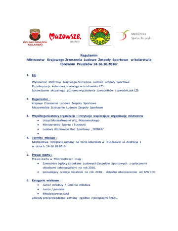 Regulamin Mistrzostw Krajowego Zrzeszenia Ludowe Zespoły Sportowe w kolarstwie torowym Pruszków 14-16.10.2016r 1. Cel Wyłonienie Mistrzów Krajowego Zrzeszenia Ludowe Zespoły Sportowe Popularyzacja kolarstwa torowego w środowisku LZS Sprawdzenie aktualnego poziomu wyszkolenia zawodników i zawodniczek LZS 2. Organizator : Krajowe Zrzeszenie Ludowe Zespoły Sportowe Mazowieckie Zrzeszenie Ludowe Zespoły Sportowe 3. Współorganizatorzy organizacje – instytucje wspierające organizację mistrzostw Urząd Marszałkowski Woj. Mazowieckiego Ministerstwo Sportu i Turystyki Ludowy Uczniowski Klub Sportowy „TRÓJKA” 4. Termin i miejsce : Mistrzostwa rozegrane zostaną na torze kolarskim w Pruszkowie ul. Andrzeja 1 w dniach 14-16.10.2016r. 5. Prawo startu : Prawo startu w Mistrzostwach mają : Zawodnicy będący członkami Ludowych Zespołów Sportowych z opłaconymi składkami członkowskimi na rok 2016, posiadający licencje kolarskie na rok 2016 , aktualne ubezpieczenie od NW i OC 6. Kategorie wiekowe : Junior młodszy / juniorka młodsza Junior / juniorka Młodzieżowiec K/M Zawody przeprowadzone zostaną zgodnie z przepisami PZKoL. 7. Zgłoszenia Zgłoszenia na drukach PZKOL należy przesyłać na adres: Mazowieckie Zrzeszenie LZS 04-161 Warszawa ul. Komorska 54/3 lub [email protected] do dnia 10.10.2016r. Ostateczne przyjmowanie zgłoszeń w dniu 14.10.2015r w godzinach 11-12 w biurze zawodów na torze kolarskim w Pruszkowie . Odprawa techniczna w dniu 14.10.2016r godzina 13.00 na torze kolarskim w Pruszkowie. 8. Finasowanie zawodów : Koszty organizacyjne pokrywa organizator Koszty udziału w zawodach pokrywają uczestniczące kluby Organizator nie pobiera startowego od zawodników 9. Nagrody : W klasyfikacji indywidualnej zawodnicy i zawodniczki otrzymują medale i zdobywają Tytuł Mistrza Krajowego Zrzeszenia LZS w kolarstwie torowym na rok 2016 W klasyfikacji drużynowej województw 6 pierwszych woj. otrzymują puchary Punktacja poszczególnych konkurencji 1 m-ce 6pkt 2 m –ce 4pkt 3 m-ce 3pkt 4 m-ce 2pkt 5 m-ce 1 pkt 10. Postanowienie końcowe : Zawodnicy muszą posiadać aktualne ubezpieczenie NW i OC Organizator nie ponosi odpowiedzialności za wypadki zaistniałe podczas zawodów Organizator nie ponosi odpowiedzialności za rzeczy zaginione oraz sprzęt kolarski zniszczony podczas trwania zawodów Komisję sędziowską wyznacza PZKol W sprawach organizacyjnych nie uregulowanych niniejszym regulaminem decyduje Organizator, w sprawach sportowych – komisja sędziowska Program zawodów : 14.10.2016 11.00-12.00 Weryfikacja zawodników 12,30 Odprawa techniczna 13.00 start I konkurencji 13.00 Sprint drużynowy ( Mistrzostwa KZ LZS ) 15.30 eliminacje do wyścigu scratch ( Mistrzostwa Polski + KZLZS) 17.30 eliminacje do wyścigu punktowego ( Mistrzostwa Polski + KZLZS) 19.00 wyścig drużynowy na dystansie 3000/4000m ( Mistrzostwa Polski + KZLZS ) 15.10.2016 10.00 wyścig na dystansie 500/1000m ( Mistrzostwa Polski +Krajowego Zrzeszenia LZS) 13.00 eliminacje do wyścigu eliminacyjnego 16.00 sctatch ( Mistrzostwa Polski + KZLZS) FINAŁ 17.00 Uroczyste otwarcie Mistrzostw 17.30 wyścig eliminacyjny FINAŁ Mistrzostwa Polski K jmł-LZS K j+Mł-MP+LZS M jmł-LZS M j-MP+LZS MMł-MP+LZS K jmł -LZS K j +Mł –MP+LZS M jmł - LZS M j – MP+LZS M Mł –MP+LZS K jmł -LZS K j +Mł – MP+LZS M jmł - LZS M j – MP+LZS M Mł – MP+LZS K jmł -LZS K j +Mł –MP+LZS M jmł – LZS M j – MP+LZS M Mł MP+LZS K jmł - LZS K j +Mł – MP+LZS M jmł- LZS M j – MP+LZS M Mł – MP+LZS K jmł K j +Mł M jmł Mj M Mł K jmł - LZS K j +Mł - MP+LZS M jmł- LZS M j- MP+LZS M Mł- MP+LZS K j +Mł – MP M j – MP M Mł- MP 16.10.2016 10.00 Wyścig ze startu zatrzymanego na dystansie 3000/4000 ( Mistrzostwa Polski +KZLZS) 13.00 Wyścig Punktowy Finał ( Mistrzostwa Polski + KZLZS) K jmł- LZS K j +Mł-MP+LZS M jmł- LZS M j- MP+LZS M Mł-MP+LZS K jmł - LZS K j +Mł- MP+LZS M jmł – MP+LZS M j-MP+LZS M Mł MP+LZS 17.00 Wyścig Medison (Mistrzostwa Polski ) K j +Mł- MP M j- MP M Mł -MP 19.00 ZAKOŃCZENIE ZAWODÓW Organizator : Mazowieckie Zrzeszenie LZS