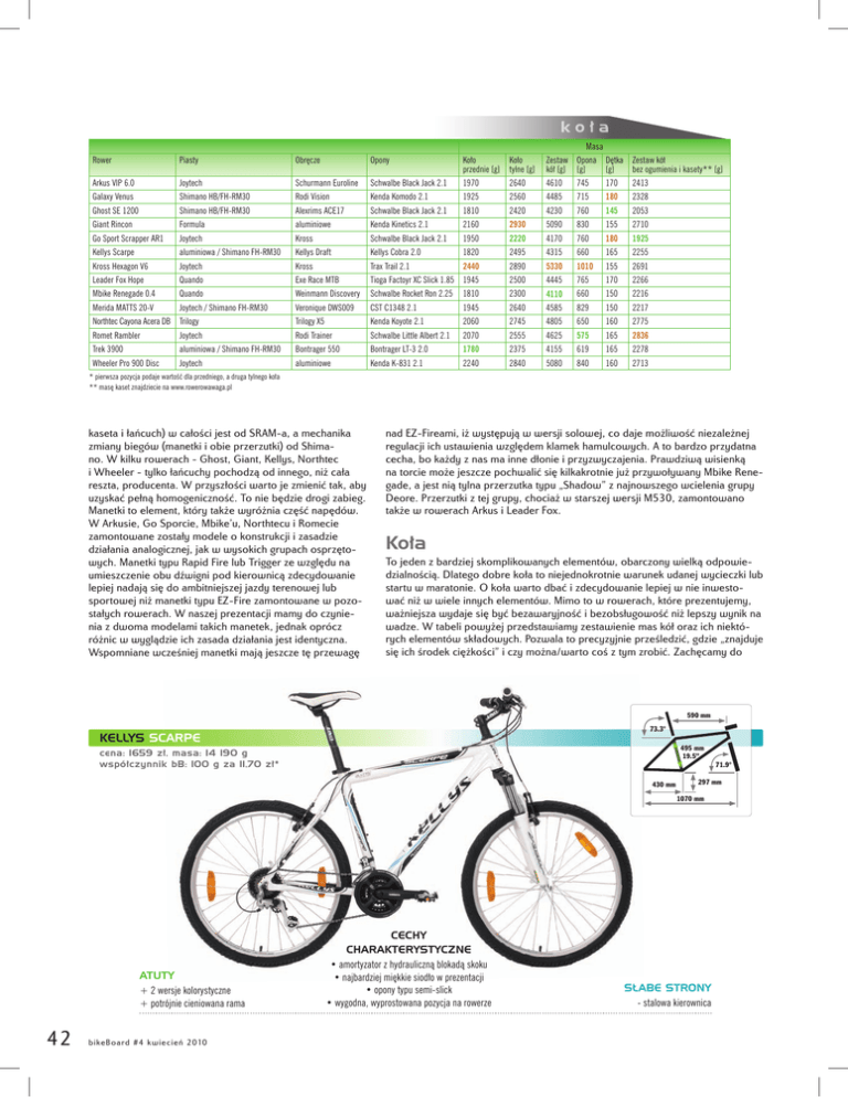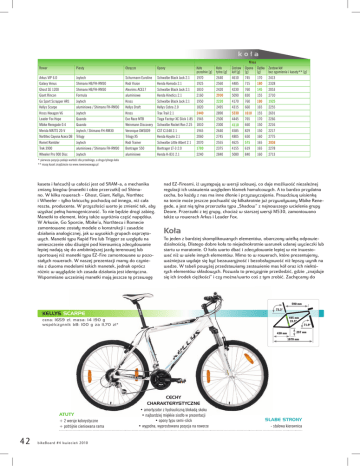 Masa Rower Piasty Obręcze Opony Koło przednie [g] Koło tylne [g] Zestaw Opona Dętka Zestaw kół kół [g] [g] [g] bez ogumienia i kasety** [g] Arkus VIP 6.0 Joytech Schurmann Euroline Schwalbe Black Jack 2.1 1970 2640 4610 745 170 2413 Galaxy Venus Shimano HB/FH-RM30 Rodi Vision Kenda Komodo 2.1 1925 2560 4485 715 180 2328 Ghost SE 1200 Shimano HB/FH-RM30 Alexrims ACE17 Schwalbe Black Jack 2.1 1810 2420 4230 760 145 2053 Giant Rincon Formula aluminiowe Kenda Kinetics 2.1 2160 2930 5090 830 155 2710 Go Sport Scrapper AR1 Joytech Kross Schwalbe Black Jack 2.1 1950 2220 4170 760 180 1925 Kellys Scarpe aluminiowa / Shimano FH-RM30 Kellys Draft Kellys Cobra 2.0 1820 2495 4315 660 165 2255 Kross Hexagon V6 Joytech Kross Trax Trail 2.1 2440 2890 5330 1010 155 2691 Leader Fox Hope Quando Exe Race MTB Tioga Factoyr XC Slick 1.85 1945 2500 4445 765 170 2266 Mbike Renegade 0.4 Quando Weinmann Discovery Schwalbe Rocket Ron 2.25 1810 2300 4110 660 150 2216 Merida MATTS 20-V Joytech / Shimano FH-RM30 2217 Veronique DWS009 CST C1348 2.1 1945 2640 4585 829 150 Northtec Cayona Acera DB Trilogy Trilogy X5 Kenda Koyote 2.1 2060 2745 4805 650 160 2775 Romet Rambler Joytech Rodi Trainer Schwalbe Little Albert 2.1 2070 2555 4625 575 165 2836 Trek 3900 aluminiowa / Shimano FH-RM30 Bontrager 550 Bontrager LT-3 2.0 1780 2375 4155 619 165 2278 Wheeler Pro 900 Disc Joytech aluminiowe Kenda K-831 2.1 2240 2840 5080 840 160 2713 * pierwsza pozycja podaje wartość dla przedniego, a druga tylnego koła ** masę kaset znajdziecie na www.rowerowawaga.pl kaseta i łańcuch) w całości jest od SRAM-a, a mechanika zmiany biegów (manetki i obie przerzutki) od Shimano. W kilku rowerach - Ghost, Giant, Kellys, Northtec i Wheeler - tylko łańcuchy pochodzą od innego, niż cała reszta, producenta. W przyszłości warto je zmienić tak, aby uzyskać pełną homogeniczność. To nie będzie drogi zabieg. Manetki to element, który także wyróżnia część napędów. W Arkusie, Go Sporcie, Mbike’u, Northtecu i Romecie zamontowane zostały modele o konstrukcji i zasadzie działania analogicznej, jak w wysokich grupach osprzętowych. Manetki typu Rapid Fire lub Trigger ze względu na umieszczenie obu dźwigni pod kierownicą zdecydowanie lepiej nadają się do ambitniejszej jazdy terenowej lub sportowej niż manetki typu EZ-Fire zamontowane w pozostałych rowerach. W naszej prezentacji mamy do czynienia z dwoma modelami takich manetek, jednak oprócz różnic w wyglądzie ich zasada działania jest identyczna. Wspomniane wcześniej manetki mają jeszcze tę przewagę nad EZ-Fireami, iż występują w wersji solowej, co daje możliwość niezależnej regulacji ich ustawienia względem klamek hamulcowych. A to bardzo przydatna cecha, bo każdy z nas ma inne dłonie i przyzwyczajenia. Prawdziwą wisienką na torcie może jeszcze pochwalić się kilkakrotnie już przywoływany Mbike Renegade, a jest nią tylna przerzutka typu „Shadow” z najnowszego wcielenia grupy Deore. Przerzutki z tej grupy, chociaż w starszej wersji M530, zamontowano także w rowerach Arkus i Leader Fox. Koła To jeden z bardziej skomplikowanych elementów, obarczony wielką odpowiedzialnością. Dlatego dobre koła to niejednokrotnie warunek udanej wycieczki lub startu w maratonie. O koła warto dbać i zdecydowanie lepiej w nie inwestować niż w wiele innych elementów. Mimo to w rowerach, które prezentujemy, ważniejsza wydaje się być bezawaryjność i bezobsługowość niż lepszy wynik na wadze. W tabeli powyżej przedstawiamy zestawienie mas kół oraz ich niektórych elementów składowych. Pozwala to precyzyjnie prześledzić, gdzie „znajduje się ich środek ciężkości” i czy można/warto coś z tym zrobić. Zachęcamy do 590 mm 73.3° KELLYS SCARPE 495 mm 19.5” cena: 1659 zł, masa: 14 190 g współczynnik bB: 100 g za 11,70 zł* 71.9° 430 mm 297 mm 1070 mm ATUTY + 2 wersje kolorystyczne + potrójnie cieniowana rama 42 bi ke Bo ar d # 4 k wi e cień 2010 CECHY CHARAKTERYSTYCZNE • amortyzator z hydrauliczną blokadą skoku • najbardziej miękkie siodło w prezentacji • opony typu semi-slick • wygodna, wyprostowana pozycja na rowerze SŁABE STRONY - stalowa kierownica