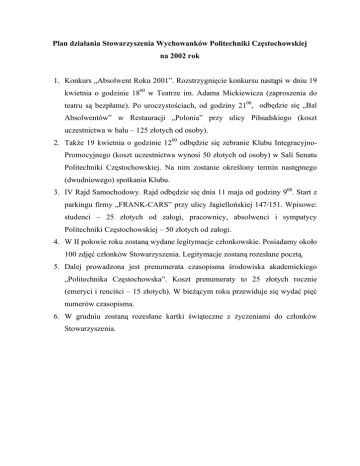 Plan działania Stowarzyszenia Wychowanków Politechniki Częstochowskiej na 2002 rok 1. Konkurs „Absolwent Roku 2001”. Rozstrzygnięcie konkursu nastąpi w dniu 19 kwietnia o godzinie 1800 w Teatrze im. Adama Mickiewicza (zaproszenia do teatru są bezpłatne). Po uroczystościach, od godziny 2100, odbędzie się „Bal Absolwentów” w Restauracji „Polonia” przy ulicy Piłsudskiego (koszt uczestnictwa w balu – 125 złotych od osoby). 2. Także 19 kwietnia o godzinie 1200 odbędzie się zebranie Klubu IntegracyjnoPromocyjnego (koszt uczestnictwa wynosi 50 złotych od osoby) w Sali Senatu Politechniki Częstochowskiej. Na nim zostanie określony termin następnego (dwudniowego) spotkania Klubu. 3. IV Rajd Samochodowy. Rajd odbędzie się dnia 11 maja od godziny 900. Start z parkingu firmy „FRANK-CARS” przy ulicy Jagiellońskiej 147/151. Wpisowe: studenci – 25 złotych od załogi, pracownicy, absolwenci i sympatycy Politechniki Częstochowskiej – 50 złotych od załogi. 4. W II połowie roku zostaną wydane legitymacje członkowskie. Posiadamy około 100 zdjęć członków Stowarzyszenia. Legitymacje zostaną rozesłane pocztą. 5. Dalej prowadzona jest prenumerata czasopisma środowiska akademickiego „Politechnika Częstochowska”. Koszt prenumeraty to 25 złotych rocznie (emeryci i renciści – 15 złotych). W bieżącym roku przewiduje się wydać pięć numerów czasopisma. 6. W grudniu zostaną rozesłane kartki świąteczne z życzeniami do członków Stowarzyszenia.