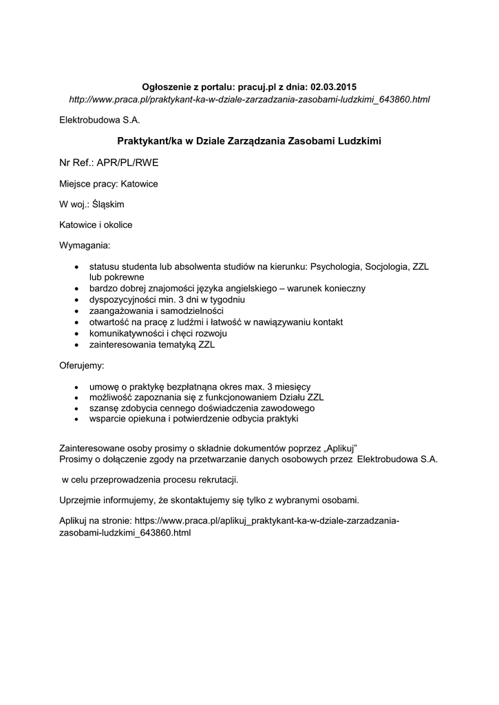 Ogłoszenie z portalu: pracuj.pl z dnia: 02.03.2015 http://www.praca.pl/praktykant-ka-w-dziale-zarzadzania-zasobami-ludzkimi_643860.html Elektrobudowa S.A. Praktykant/ka w Dziale Zarządzania Zasobami Ludzkimi Nr Ref.: APR/PL/RWE Miejsce pracy: Katowice W woj.: Śląskim Katowice i okolice Wymagania: statusu studenta lub absolwenta studiów na kierunku: Psychologia, Socjologia, ZZL lub pokrewne bardzo dobrej znajomości języka angielskiego – warunek konieczny dyspozycyjności min. 3 dni w tygodniu zaangażowania i samodzielności otwartość na pracę z ludźmi i łatwość w nawiązywaniu kontakt komunikatywności i chęci rozwoju zainteresowania tematyką ZZL Oferujemy: umowę o praktykę bezpłatnąna okres max. 3 miesięcy możliwość zapoznania się z funkcjonowaniem Działu ZZL szansę zdobycia cennego doświadczenia zawodowego wsparcie opiekuna i potwierdzenie odbycia praktyki Zainteresowane osoby prosimy o składnie dokumentów poprzez „Aplikuj” Prosimy o dołączenie zgody na przetwarzanie danych osobowych przez Elektrobudowa S.A. w celu przeprowadzenia procesu rekrutacji. Uprzejmie informujemy, że skontaktujemy się tylko z wybranymi osobami. Aplikuj na stronie: https://www.praca.pl/aplikuj_praktykant-ka-w-dziale-zarzadzaniazasobami-ludzkimi_643860.html