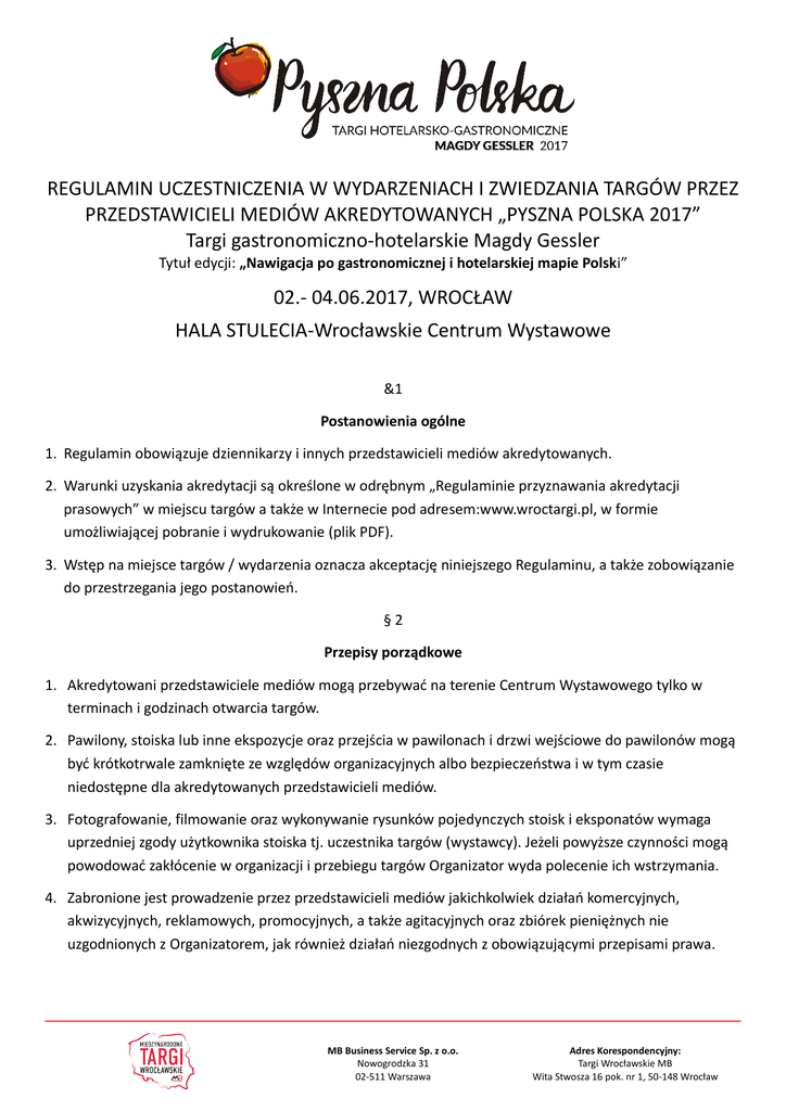 REGULAMIN UCZESTNICZENIA W WYDARZENIACH I ZWIEDZANIA TARGÓW PRZEZ PRZEDSTAWICIELI MEDIÓW AKREDYTOWANYCH „PYSZNA POLSKA 2017” Targi gastronomiczno-hotelarskie Magdy Gessler Tytuł edycji: „Nawigacja po gastronomicznej i hotelarskiej mapie Polski” 02.- 04.06.2017, WROCŁAW HALA STULECIA-Wrocławskie Centrum Wystawowe &1 Postanowienia ogólne 1. Regulamin obowiązuje dziennikarzy i innych przedstawicieli mediów akredytowanych. 2. Warunki uzyskania akredytacji są określone w odrębnym „Regulaminie przyznawania akredytacji prasowych” w miejscu targów a także w Internecie pod adresem:www.wroctargi.pl, w formie umożliwiającej pobranie i wydrukowanie (plik PDF). 3. Wstęp na miejsce targów / wydarzenia oznacza akceptację niniejszego Regulaminu, a także zobowiązanie do przestrzegania jego postanowień. §2 Przepisy porządkowe 1. Akredytowani przedstawiciele mediów mogą przebywać na terenie Centrum Wystawowego tylko w terminach i godzinach otwarcia targów. 2. Pawilony, stoiska lub inne ekspozycje oraz przejścia w pawilonach i drzwi wejściowe do pawilonów mogą być krótkotrwale zamknięte ze względów organizacyjnych albo bezpieczeństwa i w tym czasie niedostępne dla akredytowanych przedstawicieli mediów. 3. Fotografowanie, filmowanie oraz wykonywanie rysunków pojedynczych stoisk i eksponatów wymaga uprzedniej zgody użytkownika stoiska tj. uczestnika targów (wystawcy). Jeżeli powyższe czynności mogą powodować zakłócenie w organizacji i przebiegu targów Organizator wyda polecenie ich wstrzymania. 4. Zabronione jest prowadzenie przez przedstawicieli mediów jakichkolwiek działań komercyjnych, akwizycyjnych, reklamowych, promocyjnych, a także agitacyjnych oraz zbiórek pieniężnych nie uzgodnionych z Organizatorem, jak również działań niezgodnych z obowiązującymi przepisami prawa. MB Business Service Sp. z o.o. Nowogrodzka 31 02-511 Warszawa Adres Korespondencyjny: Targi Wrocławskie MB Wita Stwosza 16 pok. nr 1, 50-148 Wrocław 5. W miejscu targów / wydarzenia obowiązują zakazy: a) wnoszenia i używania broni, amunicji i materiałów pirotechnicznych oraz szkodliwych substancji chemicznych, a także ognia otwartego, stanowiących zagrożenie pożarowe, uszkodzenia mienia oraz stwarzających niebezpieczeństwo dla zdrowia i życia osób, b) wnoszenia i spożywania alkoholu oraz rozprowadzania i zażywania środków odurzających, c) zakłócania porządku publicznego (np. głośne, agresywne zachowania), d) wprowadzania zwierząt, a także rowerów, deskorolek itp., e) palenia wyrobów tytoniowych w pawilonach wystawienniczych, konferencyjnych i innych obiektach, z wyjątkiem miejsc wydzielonych i specjalnie oznaczonych, f) zanieczyszczanie pawilonów i terenów otwartych odpadami wygenerowanymi przez siebie (opakowania po napojach i jedzeniu, niedopałki, gumy do żucia itp.), g) niszczenia infrastruktury (np. oklejanie ścian, posadzek ulotkami reklamowymi)oraz roślinności na terenie Centrum Warstwowego, h) opierania się o elementy zabudowy stoisk, konstrukcje reklamowe i inne elementy aranżacji przestrzeni. 6. Osoby będące w stanie wyraźnego odurzenia narkotykowego lub upojenia alkoholowego albo próbujące wnieść alkohol, środki odurzające lub niebezpieczne przedmioty, nie będą wpuszczane na miejsce wydarzenia. 7. W razie nieprzestrzegania zakazów wymienionych w ust. 5 , Organizator zastrzega sobie prawo natychmiastowego wyprowadzenia akredytowanego dziennikarza z miejsca targów / wydarzenia i uniemożliwienia ponownego wstępu, a w uzasadnionych przypadkach wezwania Policji. 8. Zabronione jest pozostawianie bez opieki wszelkich przedmiotów, w tym bagażu lub innego mienia. 9. Przedmioty i substancje określone w ust.5 pkt. a) oraz przedmioty pozostawione bez opieki na terenie wystawowym określone w ust. 8, mogą ze względów bezpieczeństwa zostać przez Organizatora albo służby usunięte lub zniszczone z obowiązującymi przepisami prawa na koszt osoby pozostawiającej przedmioty / substancje, chyba, że nie uda się ustalić do kogo należały. Organizator nie ponosi z tego tytułu odpowiedzialności. Jeżeli konieczna będzie ewakuacja osób z pawilonów lub terenów targów to kosztami tej ewakuacji zostaną obciążone osoby, które pozostawiły te przedmioty. 10. W miejscu targów lub innych wydarzeń obowiązują nakazy: a) respektowania oznaczeń ciągów komunikacyjnych oraz stref wydzielonych z ruchu podlegających ochronie przeciwpożarowej, b) przestrzegania przepisów o ruchu drogowym, które obowiązują w strefie ruchu w miejscu targów, c) usuwania wygenerowanych przez siebie odpadów i ich wrzucania do zlokalizowanych przed wejściami do pawilonów pojemników, oznakowanych zgodnie z zasadą selektywnej zbiórki odpadów, d) wykonywania poleceń porządkowych wydawanych przez służby Centrum Wystawowego ze względów organizacyjnych i bezpieczeństwa (konieczności zabezpieczenia mienia i zapewnienia bezpieczeństwa osób przebywających w miejscu wydarzenia), np. nakazujących usunięcie własnych przedmiotów z ciągu komunikacyjnego, dotyczących ewakuacji osób z pawilonów, MB Business Service Sp. z o.o. Nowogrodzka 31 02-511 Warszawa Adres Korespondencyjny: Targi Wrocławskie MB Wita Stwosza 16 pok. nr 1, 50-148 Wrocław e) wykonywania poleceń funkcjonariuszy Straży Pożarnej lub innych służb państwowych podczas ewakuacji, akcji ratowniczych albo czynności kontrolno-rozpoznawczych. §3 Odpowiedzialność i ubezpieczenie 1. Organizator zastrzega sobie prawo odwołania, skrócenia albo przełożenia terminu targów lub innego wydarzenia i zobowiązują się do poinformowania o tym na stronach internetowych targów / wydarzeń, ze stosownym wyprzedzeniem terminów ich rozpoczęcia. 2. Organizator nie ponosi odpowiedzialności za szkody na osobach przedstawicieli mediów spowodowane przez osoby trzecie lub z winy poszkodowanego. 3. Organizator nie ponosi odpowiedzialności za szkody w mie