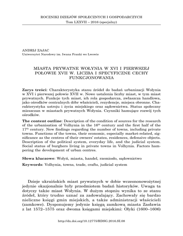 ROCZNIKI DZIEJÓW SPOŁECZNYCH I GOSPODARCZYCH Tom LXXVII – 2016 (specjalny) ANDRIJ ZAJAC Uniwersytet Narodowy im. Iwana Franki we Lwowie MIASTA PRYWATNE WOŁYNIA W XVI I PIERWSZEJ POŁOWIE XVII W. LICZBA I SPECYFICZNE CECHY FUNKCJONOWANIA Zarys treści: Charakterystyka stanu źródeł do badań urbanizacji Wołynia w XVI i pierwszej połowie XVII w. Nowe ustalenia liczby miast, w tym miast prywatnych. Funkcje tych miast, ich rola gospodarcza, zwłaszcza handlowa, jako ośrodków centralnych dóbr właścicieli, rezydencje, miejsca obronne. Charakterystyka ustroju i życia miejskiego oraz sądownictwa. Status społeczny mieszczan w miastach prywatnych Wołynia. Czynniki hamujące rozwój tych ośrodków. The content outline: Description of the condition of sources for the research of the urbanisation of Volhynia in the 16th century and the first half of the 17th century. New findings regarding the number of towns, including private towns. Functions of the towns, their economic, especially market-related, significance as the centres of their owners’ estates, residences, defensive objects. Description of the political system, everyday life, and the judicial system. Social status of burghers living in private towns in Volhynia. Factors hampering the development of urban centres. Słowa kluczowe: Wołyń, miasta, handel, rzemiosło, sądownictwo Keywords: Volhynia, towns, trade, crafts, judicial system Dzieje ukraińskich miast prywatnych w dobie wczesnonowożytnej jedynie okazjonalnie były przedmiotem badań historyków. Uwaga ta dotyczy także miast Wołynia. W dużym stopniu wynika to ze stanu źródeł, który trudno uznać za zadowalający. Zachowały się bardzo nieliczne księgi gmin miejskich, a także administracji właścicieli (zamkowe). Dysponujemy jedynie księgą zamkową miasta Zasławia z lat 1572–1575 oraz dwoma księgami miejskimi: Ołyki (1600–1606) http://dx.doi.org/10.12775/RDSG.2016.SI.08 180 Andrij Zajac i Koźlina (1604–1749). Ta ostatnia to faktycznie fragmenty dawnych ksiąg, ponadto w złym stanie zachowania. Jednocześnie udało się odnaleźć informacje, że księgi zamkowe były w Nowym Korczynie1, Ostrogu2, Murawicy3, Ołyce4, Stepaniu5, Torczynie6, Konstantynowie7, Równem8, Korcu9, Rachmanowie10, Dubnie11, Bazalii12, a także Zwiahelu oraz Sułżyńcach13. Oprócz tego w dokumentach można znaleźć wzmianki o księgach miejskich w Horochowie14, Torczynie15, Beresteczku16, Tuczynie17, Ożohowcach18, Zwiahelu19, Ostrogu20, Połonnem Nowym21, Krasnym Korcu22. Odnotowanie w źródłach wzmianek o pisarzach miejskich pozwala przypuszczać obecność w takich miastach ksiąg miejskich. Udało się potwierdzić źródłowo informacje o pisarzach miejskich w Andrzejowie23, Jezierzanach24, Kamieniu25, Klewaniu26, AP w Krakowie, Archiwum Sanguszków, Teki rzymskie, sygn. XXXIV/20, k. 95, 97 (1621 r.). 2 Центральний державний історичний архів України в Києві (dalej: ЦДІАУК), f. 25, op. 1, spr. 11, k. 150–150v; spr. 458, k. 155v (1571 r.). 3 Tamże, spr. 12, k. 136v–137 (1570 r.). 4 Tamże, spr. 37, k. 795v (1587 r.). 5 Tamże, spr. 458, k. 454v (1571 r.). 6 Tamże, spr. 9, k. 70v (1567 r.); tamże, spr. 63, k. 274–275 (1601 r.). 7 Tamże, spr. 4, k. 142v (1562 r.). 8 Tamże, spr. 8, k. 243v (1566 r.). 9 Tamże, spr. 36, k. 265v (1585 r.). 10 Tamże, spr. 79, k. 79 (1606 r.). 11 Tamże, spr. 12, k. 335–335v (1570 r.); tamże, spr. 88, k. 346v (1610 r.); tamże, spr. 100, k. 228v (1614 r.). 12 ЦДІАУК, f. 21, op. 1, spr. 80, k. 19–19v. 13 І. Тесленко, Заславська замкова книга як джерело до історії Південно-Східної Волині, w: Наукові записки. Збірник праць молодих вчених та аспірантів, Київ 2009 (Інститут Української Археографії та Джерелознавства НАН України, 19), ks. 1, s. 235. 14 ЦДІАУК, f. 25, op. 1, spr. 103, k. 929v (1616 r.); tamże, spr. 172, k. 181 (1630 r.). 15 Tamże, spr. 5, k. 364 (1585 r.); tamże, spr. 111, k. 503v (1619 r.); AP w Krakowie, Archiwum Sanguszków, Teki rzymskie, sygn. XX/47, k. 337. 16 ЦДІАУК, f. 25, op. 1, spr. 93, k. 776v (1612 r.). 17 Tamże, spr. 236, k. 166v (1643 r.). 18 ЦДІАУК, f. 21, op. 1, spr. 50, k. 75–76v (1613 r.). 19 ЦДІАУК, f. 25, op. 1, spr. 31, k. 546–546v (1584 r.). 20 ЦДІАУК, f. 2228, op. 1, spr. 3, k. 2 (1624 r.). 21 ЦДІАУК, f. 25, op. 1, spr. 82, k. 330 (1609 r.). 22 Tamże, spr. 79, k. 627 (1607 r.). 23 Tamże, spr. 172, k. 341 (1630 r.). 24 ЦДІАУК, f. 28, op. 1, spr. 44, k. 31 (1612 r.). 25 Tamże, spr. 57, k. 446v (1624 r.). 26 Tamże, spr. 172, k. 210 (1630 r.). 1 Miasta prywatne Wołynia w XVI i pierwszej połowie XVII w. 181 Krasnopolu (Chłapotyniu)27, Derażni28, Żornowie29, Sokulu30, Czetwertni31, Lubartowie32, Międzyrzeczu (Korzeckim)33, Romanowie (Kołkach)34, Aleksandrii35, Stepaniu36, Dubnie37, Równem38, Targowicy39, Ostropolu40, Połonnem41, Radziwiłłowie42, Szepetówce43. Odnotowanie w miastach ratuszy również pozwala z dużym prawdopodobieństwem przypuszczać, że prowadzono tam księgi miejskie. Do niewymienionych wcześniej miast, w których źródła notują ratusze, należały jeszcze Międzyrzec (Ostrogski)44 oraz Konstantynów45 (ogółem ratusze odnotowano w 8 miastach prywatnych). Księgi miejskie w przypadku istnienia ratusza prowadzono w nim lub w domu wójta. W 1616 r. wójt horochowski Omelan Nikiforowicz skarżył się na szlachcica Stanisława Olizarowskiego, który z uzbrojoną służbą napadł „na dom jego własny w mieście Horochowie będący, w którym sądy wójtowskie zwykle odprawiano”46. Dodajmy, że nastąpiło to w czasie, gdy w Horochowie istniał ratusz47. Natomiast w Rożyszczach rozprawy sądowe odbywały się właśnie w ratuszu48. O tym, czy prowadzono księgi