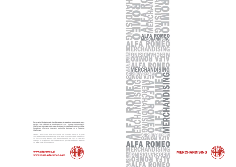 Dane, opisy i ilustracje mają charakter wyłącznie poglądowy, a rzeczywiste cechy Dati, descrizioni e illustrazioni hanno solo valore indicativo e i prodotti wyrobu mogą odbiegać od caratteristiche przedstawionych diverse (np. z przyczyn possono rappresentare anche produkcyjnych). per esigenze Alfa Romeo zastrzega sobie prawo do dowolnej modyfikacji swoich qualsiasi wyrobów. produttive. L’Alfa Romeo si riserva il diritto di apportare Dodatkowe informacje dotyczące dostępne consultare są u Dealerów modificazione ai suoi prodotti. Per produktów ulteriori informazioni il sito Alfa Romeo. internet: www.store.alfaromeo.com Details, descriptions and illustrations are intended solely as a guide and product characteristics may differ from those indicated, sometimes for manufacturing reasons. Alfa Romeo reserves the right to make any changes to its products. For further details, please consult our website at: www.store.alfaromeo.com www.alfaromeo.pl www.store.alfaromeo.com www.store.alfaromeo.com MERCHANDISING www.alfaromeo.pl www.store.alfaromeo.com Alfa Romeo, to nie tylko emocje jakie dostarcza sam samochód, Alfa Romeo, not just automotive thrills, but also a world of ale także moda i styl życia. Kolekcja przedstawiona w tym kata- style to be experienced and worn. This catalogue presents logu inspirowana jest wartościami Brand. Produkty są dostępne the collection inspired by the values of the Brand. The entire lub możliwe do zamówienia u dealerów Alfa Romeo oraz na collection is available from Alfa Romeo Dealerships or at www.store.alfaromeo.com www.store.alfaromeo.com Osiągi 2 4 Performance 4 Styl 10 Style 10 Technologia 16 Technology 16 Pasja 20 Passion 20 Dziedzictwo 24 Heritage 24 3 Osiągi Sportowy charakter Alfa Romeo, dla tych którzy chcą „nosić się” z charakterem. Performance Alfa Romeo sportiness in a play of references, for those who want to dress with spirit. 4 5 Bluza unisex zapinana na zamek. 100% bawełna, z logo Alfa Romeo w kolorze bluzy. Full-zip unisex sweatshirt. 100% cotton with Alfa Romeo brand embroidered in the same colour. CZARNA – BLACK S rys. 5916459 M rys. 5916456 L rys. 5916457 XL rys. 5916458 XXL rys. 5916460 CZERWONA – RED S rys. 5916461 M rys. 5916462 L rys. 5916463 XL rys. 5916464 XXL rys. 5916465 Bluza czerwonana zapinana zamek, zawiera logo Bluza zapinana zamek. na 100% bawełna, zawiera Alfa w kolorze bluzy. logo Romeo Alfa Romeo w kolorze bluzy. Full-zip sweatshirt sweatshirtwith with Alfa Romeo brand Alfa Romeo brand embroidered in the same samecolour. colour. UNISEX UNISEX SS M M L XL XXL XL XXL rys. rys. rys rys. rys. rys. rys. rys. rys. 5916461 5916461 5916462 5916462 5916463 5916464 5916465 5916464 5916465 Spinki do koszuli Giuliano Mazzuoli. Stalowe z logo Alfa Romeo. Giuliano Mazzuoli Nut & Bolt Cufflinks. Made of steel with laser-engraved logo. rys. 5916510 W W W. M A Z Z U O L I . I T Koszulka polo z krótkim Z mikrofibry, Polo manica corta bianco.rękawem, Realizzatabiała. in microfibra con zawiera Alfarosso Romeo w kolorze czerwonym oraz logo Alfalogo Romeo ricamato e bottoniera in tinta. czerwoną wstawkę przy White short-sleeved polozapięciu. shirt. Made of microfibre with White short-sleeved polo shirt.logo Made microfibre with embroidered red Alfa Romeo andofmatching buttons. embroidered red Alfa Romeo logo and matching buttons. DAMSKA - WOMAN DAMSKA –rys. WOMAN XS 5916480 SS cod. 5916481 rys. 5916481 M rys. 5916482 M cod: 5916482 LL cod. 5916483 rys. 5916483 MĘSKA – MAN M SKA - MAN SS rys. rys. MM rys. rys. LL rys. rys. XL rys. XL rys. XXL rys. XXL rys. 5916450 5916450 5916451 5916451 5916452 5916452 5916478 5916478 5916479 5916479 Spinki do koszuli srebrne. Design z tarczą grilla Alfa Romeo. Silver cufflinks. Grille design from Alfa Romeo sports cars. rys. 6 7 5916090 Kurtka skórzana Brema. Unisex, wykonana ze skóry typu nappa. Brema jacket. Nappa leather unisex design. 42 44 46 48 50 rys. rys. rys. rys. rys. 5916507 5916518 5916519 5916502 5916503 52 54 56 58 60 rys. rys. rys. rys. rys. 5916504 5916505 5916506 5916520 5916521 Bluza Urban Style. 100% bawełna, z logo Alfa Romeo w kolorze bluzy. Urban Style sweatshirt. 100% cotton, with raised Alfa Romeo brand in the same colour. DAMSKA – WOMAN S rys. 5916493 M rys. 5916494 L rys. 5916495 MĘSKA M L XL XXL – MAN rys. rys. rys. rys. Spinki do koszuli ze znaczkiem zielonej koniczynki – Quadrifoglio Verde. Quadrifoglio Verde butterfly cufflinks. rys. Kurtka Brema. Model unisex wykonany z tkaniny technicznej. Brema jacket. Hi-tech fabric unisex design. Pin z Quadrifoglio Verde. Quadrifoglio Verde pin. rys. S M L XL XXL rys. rys. rys. rys. rys. 5916573 5916574 5916497 5916498 5916499 5916500 5916501 Breloczek na klucze metalowy ze znaczkiem Quadrifoglio Verde. Quadrifoglio Verde metal key ring. rys. 5916572 Breloczek na klucze skórzany ze znaczkiem Quadrifoglio Verde. Quadrifoglio Verde inlaid leather key ring. rys. 8 9 5916575 5916489 5916490 5916491 5916492 Styl Każdy element znajdujący się wewnątrz samochodu Alfa Romeo zaprojektowany jest z dużą troską o design. Oferta Merchandising zaprojektowana jest z taką samą troską jeżeli chodzi o formę i materiały. Style Every detail on board an Alfa Romeo is the result of attentive design research. The merchandising collection follows the same principle of exploring shapes and materials. 10 11 Torba Mialuis o sportowym fasonie. Wykonana z cielęcej skóry. Wymiary: 51 x 33 x 26 cm. Mialuis holdall. Natural calfskin leather with sporty appearance. Size: 51 x 33 x 26 cm. rys. 5916614 Zestaw przyborów do pisania Giuliano Mazzuoli. Struktura z aluminium z ręcznymi wykończeniami. Zestaw składa się z: pióra, długopisu kulkowego, długopisu oraz ołówka 5,5 mm. Giuliano Mazzuoli Officina 4 Tempi pen set. Hand worked aluminium body, convertible into 4 different pen types: fountain pen, roller ball pen, ballpoint pen and 5.5 mm pencil. rys. 5916512 W W W. M A Z Z U O L I . I T Długopis Mi