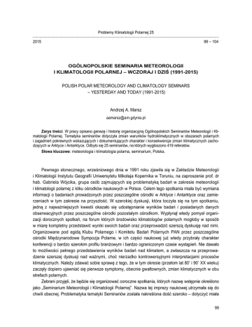 Problemy Klimatologii Polarnej 25 2015 99 – 104 OGÓLNOPOLSKIE SEMINARIA METEOROLOGII I KLIMATOLOGII POLARNEJ – WCZORAJ I DZIŚ (1991-2015) POLISH POLAR METEOROLOGY AND CLIMATOLOGY SEMINARS – YESTERDAY AND TODAY (1991-2015) Andrzej A. Marsz [email protected] Zarys treści. W pracy opisano genezę i historię organizacyjną Ogólnopolskich Seminariów Meteorologii i Klimatologii Polarnej. Tematyka seminariów dotyczyła zmian warunków hydroklimatycznych w obszarach polarnych i zagadnień pokrewnych wskazujących i dokumentujących charakter i konsekwencje zmian klimatycznych zachodzących w Arktyce i Antarktyce. Odbyło się 25 seminariów, na których wygłoszono 419 referatów. Słowa kluczowe: meteorologia i klimatologia polarna, seminarium, Polska. Pewnego słonecznego, wrześniowego dnia w 1991 roku zjawiła się w Zakładzie Meteorologii i Klimatologii Instytutu Geografii Uniwersytetu Mikołaja Kopernika w Toruniu, na zaproszenie prof. dr hab. Gabriela Wójcika, grupa osób zajmujących się problematyką badań w zakresie meteorologii i klimatologii polarnej z kilku ośrodków naukowych w Polsce. Celem tego spotkania miała być wymiana informacji o badaniach prowadzonych przez poszczególne ośrodki w Arktyce i Antarktyce oraz zamierzeniach w tym zakresie na przyszłość. W szerokiej dyskusji, która toczyła się na tym spotkaniu, jedną z najważniejszych kwestii okazało się udostępnianie wyników badań i posiadanych danych obserwacyjnych przez poszczególne ośrodki pozostałym ośrodkom. Wypłynął wtedy pomysł organizacji dorocznych spotkań, na forum których środowisko klimatologów polarnych mogłoby w sposób w miarę kompletny przedstawić wyniki swoich badań oraz przeprowadzić szerszą dyskusję nad nimi. Organizowane pod egidą Klubu Polarnego i Komitetu Badań Polarnych PAN przez poszczególne ośrodki Międzynarodowe Sympozja Polarne, w ich części naukowej już wtedy przybrały charakter konferencji o bardzo szerokim profilu branżowym i bardzo ograniczonym czasie wystąpień. Nie dawało to możliwości pełnego przedstawienia wyników badań nad klimatem, a zwłaszcza na przeprowadzenie szerszej dyskusji nad ważnymi, choć nierzadko kontrowersyjnymi interpretacjami procesów klimatycznych. Należy zdawać sobie sprawę z tego, że w tym okresie (przełom lat 80’ i 90’ XX wieku) zaczęły dopiero ujawniać się pierwsze symptomy, obecnie gwałtownych, zmian klimatycznych w obu strefach polarnych. Zebrani przyjęli, że będzie się organizować coroczne spotkania, których nazwę wstępnie określono jako „Seminarium Meteorologii i Klimatologii Polarnej”. Nazwa tej imprezy naukowej utrzymała się do chwili obecnej. Problematyka tematyki Seminariów została nakreślona dość szeroko – dotyczyć miała 99 nie tylko procesów pogodowych i klimatu w strefie najwyższych szerokości, ale również wszelkich zagadnień pokrewnych (glacjologia i kriologia, oceanografia, hydrologia lądowa, ekologia, etc.) wskazujących czy też dokumentujących charakter i konsekwencje zmian klimatycznych zachodzących w Arktyce i Antarktyce. Miało to dać możliwość zaistnienia „sprzężenia zwrotnego” między klimatologami, a badaczami krain polarnych innych niż meteorologia i klimatologia, specjalności. Przyjęto, że seminaria takie będą organizowane przemiennie – przez Zakład Klimatologii i Meteorologii Instytutu Geografii UMK w Toruniu i Katedrę Meteorologii i Oceanografii Nautycznej Wyższej Szkoły Morskiej w Gdyni. Mając na względzie organizację roku akademickiego w uczelniach oraz terminy wyjazdów i powrotów z ekspedycji arktycznych i antarktycznych, a także czas potrzebny na opracowanie wyników prowadzonych w danym roku badań, zgodzono się, że najkorzystniejszym terminem odbywania takich spotkań będzie druga połowa kwietnia – pierwsza dekada maja. Seminaria będą miały charakter ogólnopolski, będą mogli w nich brać czynny i bierny udział wszyscy zainteresowani, a udział w nich będzie bezpłatny. Ustalono, że spotkanie toruńskie będzie traktowane jako pierwsze Ogólnopolskie Seminarium Meteorologii i Klimatologii Polarnej, a następne, 2 Seminarium odbędzie się w Gdyni. Jednocześnie postanowiono rozważyć wydawanie rocznika – materiałów wystąpień na Seminariach i innych nadesłanych prac zgodnych z zakreśloną problematyką, tak, aby stały się powszechnie dostępne. Rocznik ten następnie uzyskał tytuł „Problemy Klimatologii Polarnej”. Idea organizowania takich spotkań spotkała się z pozytywnym odzewem wszystkich ośrodków prowadzących badania polarne w zakresie meteorologii i klimatologii. Ogólnopolski charakter tych spotkań wymagał jednak instytucjonalnego ich powiązania z jakąś placówką naukową o ponaduczelnianym charakterze. Dobrym rozwiązaniem, zdaniem prof. G. Wójcika, członka Komitetu Badań Polarnych PAN, byłoby powiązanie Seminariów z tym właśnie Komitetem. Na jego wniosek, przy życzliwym poparciu prof. dra hab., inż. Krzysztofa Birkenmajera, Przewodniczącego Komitetu Badań Polarnych PAN, w 1992 roku została powołana do życia Komisja Meteorologii i Klimatologii Polarnej przy Komitecie Badań Polarnych PAN. Komisja ta, obok ośrodka organizującego, była, do jej likwidacji w roku 2011, stałym koordynatorem i współorganizatorem Seminariów. Od roku 2012, w związku z wejściem w życie Ustawy o Polskiej Akademii Nauk, Komisja Meteorologii i Klimatologii Polarnej musiała zostać zlikwidowana, a Seminaria były firmowane przez ośrodek, który je organizował oraz powstały w obrębie Komitetu Badań Polarnych PAN – Zespół Klimatologii i Kriologii Polarnej. Rolę stałego koordynatora organizacyjnego seminariów w latach 2012-2015, niezależnie od tego, który z ośrodków je organizował, pełniła Katedra Meteorologii i Oceanografii Nautycznej Akademii Morskiej w Gdyni. Między rokiem 1991 i 2015 Ogólnopolskie Seminaria Meteorologii i Klimato