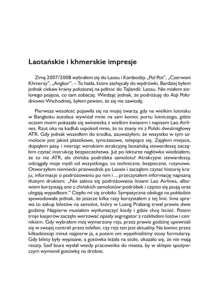 Laotańskie i khmerskie impresje Zimą 2007/2008 wybrałem się do Laosu i Kambodży. „Pol Pot”, „Czerwoni Khmerzy”, „Angkor”. – To hasła, które zachęcały do wędrówki. Bardziej byłem jednak ciekaw krainy położonej na północ do Tajlandii: Laosu. Nie miałem zielonego pojęcia, co tam zobaczę. Wiedząc jednak, że podróżuję do Azji Południowo-Wschodniej, byłem pewien, że się nie zawiodę. Pierwsza wesołość pojawiła się na mojej twarzy, gdy na wielkim lotnisku w Bangkoku autobus wywiózł mnie na sam koniec portu lotniczego, gdzie oczom moim pokazała się awionetka z wielkim kwiatem i napisem Lao Airlines. Rzut oka na kadłub uspokoił mnie, że to znany mi z Polski dwuśmigłowy ATR. Gdy jednak wszedłem do środka, zauważyłem, że wszystko w tym samolocie jest jakieś plastikowe, tymczasowe, telepiące się. Zająłem miejsce, dopiąłem pasy, i mierząc wzrokiem atrakcyjną laotańską stewardessę zacząłem czytać instrukcję bezpieczeństwa. Już po lekturze nagłówka wiedziałem, że to nie ATR, ale chińska podróbka samolotu! Atrakcyjne stewardessy, odciągały moje myśli od wszystkiego, co techniczne, bezpieczne, rutynowe. Otworzyłem niemiecki przewodnik po Laosie i zacząłem czytać historię kraju, informacje o podróżowaniu po nim i … przeczytałem informację napisaną tłustym drukiem: „Nie zaleca się podróżowania liniami Lao Airlines, albowiem korzystają one z chińskich samolotów-podróbek i często się psują oraz ulegają wypadkom.” Ciepło mi się zrobiło. Sympatyczna obsługa na pokładzie spowodowała jednak, że jeszcze kilka razy korzystałem z tej linii. Inna sprawa to zakup biletów na samolot, który w Luang Prabang trwał prawie dwie godziny. Najpierw musiałem wytłumaczyć kiedy i gdzie chcę lecieć. Potem troje kasjerów zaczęło wertować opasły segregator z rozkładem lotów i cennikiem. Gdy wybrałem mój wymarzony rejs, przez prawie godzinę upewniali się w swojej centrali przez telefon, czy rejs ten jest aktualny. Na koniec przez kilkadziesiąt minut najpierw ja, a potem oni wypełnialiśmy stosy formularzy. Gdy bilety były wypisane, a gotówka leżała na stole, okazało się, że nie mają reszty. Szef biura wysłał wtedy pracownika do miasta, by w sklepie spożywczym wymienił gotówkę na drobne. 92 Mój świat Piękna jest wędrówka przez dżunglę laotańską przerywaną polami ryżowymi i malowniczymi strumieniami. Spokój udziela się natychmiast. Zapominasz o pracy, zieleń staje się balsamem na wszystko. Piękne jest dorzecze Mekongu podczas wyprawy łodzią po tajemniczej Nam Ou. – Łagodne góry, dziewicza dżungla, pośród tego wszystkiego wartka górska rzeka, a w drewnianej łodzi ja. Żwawa azjatycka młodość, zblazowana Europa i takie tam podobne spostrzeżenia Oto kilka spostrzeżeń skreślonych w Laosie ołówkiem w moim dzienniku: „Młodzi ludzie. Wszędzie są. Zawsze pracowici, ruchliwi, pilni. Siedzę w knajpie nad Mekongiem, zaraz wylatuję z Pnom Penh. Obok mnie turyści z Niemiec. Przyjechali klimatyzowanym minibusem. Starsi, elegancko ubrani ludzie, narzekają na brak klimatyzacji. A siedzimy przecież na tarasie na zewnątrz! Wokół nich gromadka młodzieży kambodżańskiej. – Podają niezadowolonym turystom z Niemiec wyśmienite jedzenie, cieszą się z pracy. Z biegiem lat coraz bardziej brzydzę się Europą. – Starą, sklerotyczną, narzekającą, pełną przeżarcia, znudzenia. Za niedługo wracam do Azji! W Europie czuję się obco.” „Zjadałem zdrowe, pozbawione chemii i bajecznie przyrządzone warzywa oraz multum owoców. W Azji Południowo-Wschodniej nie ma ludzi otyłych. Dzięki aktywności oraz wspaniałej i zdrowej kuchni. Maszkarony, wieloryby i kaszaloty oraz pasztety to domena Stanów i Europy.” „Muzeum-więzienie z czasów Czerwonych Khmerów. Pol Pot wymordował w trzy lata 20% ludności swego malowniczego kraju. Do dziś nie wiadomo dlaczego. Mordował inteligencję, bo mogła przekazać ludziom różne wywrotowe idee. Mordował nauczycieli, zlikwidował wszystkie szkoły w kraju. Mordował lekarzy. Mordował i okrutnie torturował małe dzieci, bo ich rodzice byli wykształceni. Po trzech latach pustoszenia własnego kraju nie zostało nic. Teraz, po wielu latach widać optymizm. – Młodzi ludzie, jak wszędzie w Azji, wzięli się do ciężkiej i systematycznej pracy. Oni przeganiają już Europę w wielu sferach. Trzymam za nich kciuki.” Laotańskie i khmerskie impresje 93 Jak jeść? Od dziecka uczą nas: Jedz powoli. Ja dorzucę do tego wspominając sielankę Rejs-ową: Jedz w pięknych okolicznościach przyrody. Niepowtarzalnych. Tak, jak się żyje w Laosie. Knajpki w Luang Prabang nad Mekongiem. – Spokój na rzece, wyśmienite jedzenie. Mekong z daleka wygląda sennie. Łódki suną leniwie z prądem rzeki. Z wysokiego brzegu patrzę na świat, na pobliskie pagórki, na ludzi płynących rzeczką. Jedzenie? Najlepiej na świecie przyrządzone ryby słodkowodne. Aromatyczne koktajle owocowe. Luang Prabang w Laosie to wyśnione miejsce na krótki wypoczynek po wielogodzinnej podróży z zimowej Europy. W moim dzienniku zapisałem gdzieś na południu Kambodży taką oto myśl w sprawie jedzenia: „Owoce morza w knajpce na plaży na wybrzeżu kambodżańskim. – Życie jest piękne – śmierć frajerom, którzy żrą w tym samym czasie obleśnawą kiełbasę z grilla albo stoją w korku na Zakopiance. Najpiękniejsze plaże odkryłem nie tam, gdzie zmierzają tłumy gawiedzi i hołoty (Francja, Włochy, Chorwacja, Kuba, Bali, Egipt). Najcudowniejsze, bo spokojne, dziewicze plaże, gdzie można siedzieć na piaseczku przy malutkim stoliczku i delektować się zachodem słońca oraz wyśmienitą kuchnią, odkryłem na Zanzibarze, w Kambodży, na Borneo, Sulawesi, gdzies na Togeans, no i na pięknych i dziewiczych wysepkach południowej Tajlandii. Tam nie ma tłumów, nie są tam w stanie dotrzeć panie w szpi
