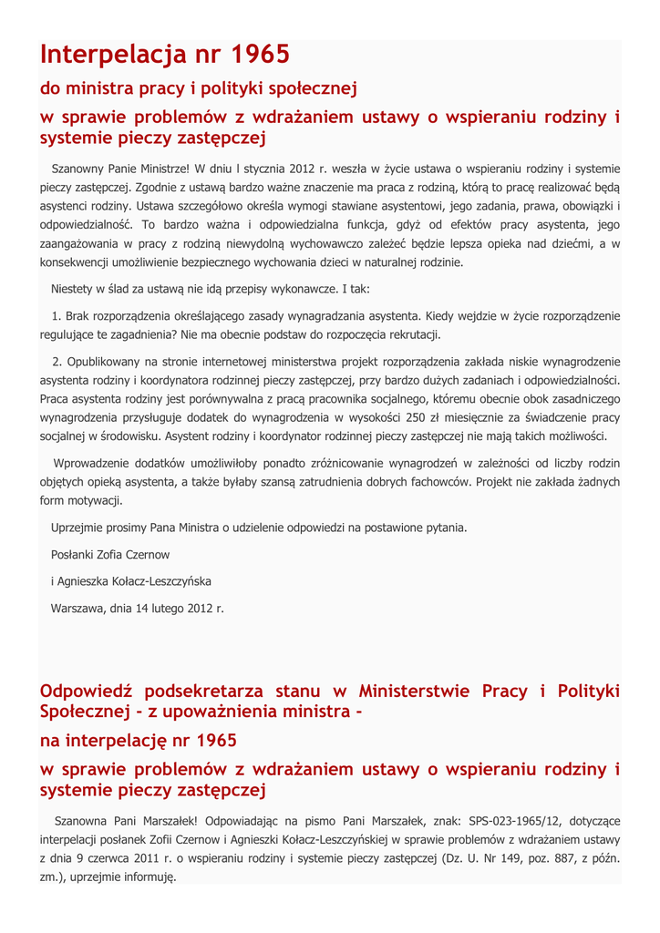 Interpelacja nr 1965 do ministra pracy i polityki społecznej w sprawie problemów z wdrażaniem ustawy o wspieraniu rodziny i systemie pieczy zastępczej Szanowny Panie Ministrze! W dniu l stycznia 2012 r. weszła w życie ustawa o wspieraniu rodziny i systemie pieczy zastępczej. Zgodnie z ustawą bardzo ważne znaczenie ma praca z rodziną, którą to pracę realizować będą asystenci rodziny. Ustawa szczegółowo określa wymogi stawiane asystentowi, jego zadania, prawa, obowiązki i odpowiedzialność. To bardzo ważna i odpowiedzialna funkcja, gdyż od efektów pracy asystenta, jego zaangażowania w pracy z rodziną niewydolną wychowawczo zależeć będzie lepsza opieka nad dziećmi, a w konsekwencji umożliwienie bezpiecznego wychowania dzieci w naturalnej rodzinie. Niestety w ślad za ustawą nie idą przepisy wykonawcze. I tak: 1. Brak rozporządzenia określającego zasady wynagradzania asystenta. Kiedy wejdzie w życie rozporządzenie regulujące te zagadnienia? Nie ma obecnie podstaw do rozpoczęcia rekrutacji. 2. Opublikowany na stronie internetowej ministerstwa projekt rozporządzenia zakłada niskie wynagrodzenie asystenta rodziny i koordynatora rodzinnej pieczy zastępczej, przy bardzo dużych zadaniach i odpowiedzialności. Praca asystenta rodziny jest porównywalna z pracą pracownika socjalnego, któremu obecnie obok zasadniczego wynagrodzenia przysługuje dodatek do wynagrodzenia w wysokości 250 zł miesięcznie za świadczenie pracy socjalnej w środowisku. Asystent rodziny i koordynator rodzinnej pieczy zastępczej nie mają takich możliwości. Wprowadzenie dodatków umożliwiłoby ponadto zróżnicowanie wynagrodzeń w zależności od liczby rodzin objętych opieką asystenta, a także byłaby szansą zatrudnienia dobrych fachowców. Projekt nie zakłada żadnych form motywacji. Uprzejmie prosimy Pana Ministra o udzielenie odpowiedzi na postawione pytania. Posłanki Zofia Czernow i Agnieszka Kołacz-Leszczyńska Warszawa, dnia 14 lutego 2012 r. Odpowiedź podsekretarza stanu w Ministerstwie Pracy i Polityki Społecznej - z upoważnienia ministra na interpelację nr 1965 w sprawie problemów z wdrażaniem ustawy o wspieraniu rodziny i systemie pieczy zastępczej Szanowna Pani Marszałek! Odpowiadając na pismo Pani Marszałek, znak: SPS-023-1965/12, dotyczące interpelacji posłanek Zofii Czernow i Agnieszki Kołacz-Leszczyńskiej w sprawie problemów z wdrażaniem ustawy z dnia 9 czerwca 2011 r. o wspieraniu rodziny i systemie pieczy zastępczej (Dz. U. Nr 149, poz. 887, z późn. zm.), uprzejmie informuję. W dniu 1 stycznia 2012 r. weszła w życie ustawa z dnia 9 czerwca 2011 r. o wspieraniu rodziny i systemie pieczy zastępczej. Zakłada ona stworzenie systemu wsparcia rodziny, która przeżywa problemy w wypełnianiu obowiązków opiekuńczo-wychowawczych wobec swoich dzieci. Asystent rodziny jest w nowych rozwiązaniach jednym z najważniejszych narzędzi nowego systemu pracy z rodziną biologiczną. Natomiast koordynator rodzinnej pieczy zastępczej to osoba, która ma wspierać rodzinę zastępczą w organizacji opieki nad powierzonymi dziećmi. W dniu 20 lutego 2012 r. zostało ogłoszone w Dzienniku Ustaw pod pozycją 190 rozporządzenie Rady Ministrów z dnia 8 lutego 2012 r., zmieniające rozporządzenie w sprawie wynagrodzeń pracowników samorządowych. Zmiana ta miała na celu uzupełnienie wykazu stanowisk pracowników samorządowych o nowe stanowiska, które wprowadza ustawa z dnia 9 czerwca 2011 r. o wspieraniu rodziny i systemie pieczy zastępczej wraz z określeniem przypisanych im wymagań kwalifikacyjnych oraz minimalnego poziomu wynagrodzenia zasadniczego. Tak określona stawka wynagrodzenia pozwala samorządom lokalnym na dostosowanie poziomu wynagrodzeń do możliwości finansowych jednostki oraz struktury wynagrodzeń na danym terenie. Ponadto należy zauważyć, że wskazanie w rozporządzeniu w sprawie wynagrodzeń pracowników samorządowych możliwości zatrudnienia asystenta rodziny i odpowiednio koordynatora rodzinnej pieczy zastępczej jako młodszego asystenta rodziny, asystenta rodziny i starszego asystenta rodziny daje samorządowi możliwość wyznaczenia ścieżki rozwoju zawodowego i awansu stanowiskowego i finansowego dla asystentów rodziny i koordynatorów rodzinnej pieczy zastępczej. W rozporządzeniu bowiem wskazane są jedynie kwoty minimalnych wynagrodzeń, w związku z powyższym nic nie stoi na przeszkodzie, aby samorządy wypłacały wynagrodzenia dla asystentów rodziny i koordynatorów w wysokości równoważnej jak dla pracowników socjalnych. Z poważaniem Podsekretarz stanu Marek Bucior Warszawa, dnia 19 marca 2012 r.