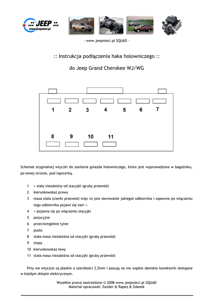 - www.jeepnieci.pl SQUAD - :: Instrukcja podłączenia haka holowniczego :: do Jeep Grand Cherokee WJ/WG Schemat oryginalnej wtyczki do zasilania gniazda holowniczego, która jest wyprowadzona w bagażniku, po lewej stronie, pod tapicerką. 1 + stały niezależny od stacyjki (gruby przewód) 2 kierunkowskaz prawy 3 masa stała (cienki przewód) więc to jest sterowanie jakiegoś odbiornika i zapewne po włączeniu tego odbiornika pojawi się tam +. 4 + pojawia się po włączeniu stacyjki 5 pozycyjne 6 przeciwmgielne tylne 7 pusto 8 stała masa niezależna od stacyjki (gruby przewód) 9 stopy 10 kierunkowskaz lewy 11 stała masa niezależna od stacyjki (gruby przewód) Piny we wtyczce są płaskie o szerokości 2,5mm i pasują na nie wąskie damskie konektorki dostępne w każdym sklepie elektrycznym. Wszelkie prawa zastrzeżone © 2008 www.jeepnieci.pl SQUAD Materiał opracował: Zander & Rapez & Zdanek - www.jeepnieci.pl SQUAD - W wiązce do haka jest 7 przewodów i należy połączyć (zlutować) ze sobą 2 przewody stopów i 2 przewody pozycji, a następnie podłączyć do pinów w oryginalnej wtyczce. Wtyczka jest zamontowana na wsuwce od wewnętrznej strony wzmocnienia lewego błotnika. Odczepia się ją przesuwając wtyczkę w kierunku tyłu auta. Wówczas można dopiero podłączyć piny. Wiązka do haka musi mieć około 2 m ponieważ inaczej nie sięgnie do wtyczki. Nie jest wymagana żadna specjalna wiązka wystarczy wiązka uniwersalna. Do zamontowania haka konieczne jest zdjęcie zderzaka. Do podłączenia wtyczki należy zdjąć tylną listwę plastikową na podsufitówce (4 zatrzaski), dolną listwę w bagażniku (4 wkręty) oraz lewy boczek. Zatrzaski są metalowe szerokości około 20 mm i są dość wytrzymałe. Zatrzaski wchodzą w prostokątne otwory we wzmocnieniach więc dobrze jest przyciskać je płaskim wkrętakiem, wtedy łatwo wyskakują. Aby zdjąć zderzak trzeba wyjąć kilka plastikowych bolców pod zderzakiem i nad zderzakiem (wystarczy je wysunąć) oraz po trzy plastikowe kołki w nadkolach (trzeba je wcisnąć). Dwa dolne można ponownie zamontować natomiast 3 najwyższy nie da rady więc należy albo kupić nowy oryginalny albo inny o podobnej wielkości. Następnie trzeba wyjąć po 2 wsuwki zderzaka montujące go do błotników. Tu jest mały problem. Aby nie połamać zderzaka należy sobie z drutu o grubości 2,5 – 3mm zrobić haczyk o wymiarach 4x15-20cm, wygięty pod kątem około 90-120 stopni. Wówczas wsuwkę się podważa i łatwo wyskakuje. Może to być drut spawalniczy ponieważ musi być dość sztywny i sprężysty. Hak montujemy na oryginale otwory. Wykręcić trzeba oryginalny zaczep do holowania i dwa oryginalne wsporniki. Nie będzie to już potrzebne. Następnie w dolnej części zderzaka trzeba wyciąć fragment o wymiarach 50x150m. Z tym, że szersze cięcie należy zrobić poprzecznie do zderzaka. Od wewnętrznej strony zderzaka są wytłoczone wzorniki gdzie jest jego oś. Również są wzorniki do oryginalnej osłony haka, którą niestety jest niedostępna w serwisie. Może tylko w USA. Instrukcja montażu haka Mopar oraz demontażu zderzaka i tapicerki, instrukcja przebiegu wiązki do haka wraz z pomocnymi schematami jest dostępna na stronach www.wjjeeps.com pod zakładką Trailer Hitach (język angielski). Warto to sobie wydrukować. Jeżeli kupiony będzie hak przeznaczony do Jeepa to zamontowanie zajmuje około 1h. Zdjęcie zderzaka i tapicerki to już zależy od wprawy. Autorowi zajęło to 4h. Autor montował hak ze Słupska, a wiązkę uniwersalną Brinka. Hak jest identyczny jak oryginał Mopara. Numer haka JP04. Hak jest w komplecie ze śrubami i instrukcją montażu, i jest dostępny na www.autohak.com.pl. Cena około 580 zł (rok 2009). Wiązki z hakiem nie ma co zamawiać, ponieważ jest za krótka. Wiązka Brinka kosztuje około 45zł (rok 2009). Materiał opracował: Zander Wszelkie prawa zastrzeżone © 2008 www.jeepnieci.pl SQUAD Materiał opracował: Zander & Rapez & Zdanek - www.jeepnieci.pl SQUAD - [ Uzupełnienie by Rapez ] Po pierwsze do WJ/WG nie trzeba zdejmować zderzaka (oszczędzamy czas i nie musimy kupować dodatkowych spinek), nie zdejmujemy żadnej listwy na podsufitce, odpinamy listwę w bagażniku, zaraz nad zderzakiem, jak podniesiemy klapę i lewy boczek jak chcemy się wpiąć do kostki lub tylko listwę na podłodze, gdy podpinamy się do lampy (najczęściej jest to lewa lampa). Od lewej do prawej puszczona jest wiązka "prądu". Aby zabrać się za montaż zderzaka odpinamy kołki (bolce) pod zderzakiem, łatwo wychodzą i nadają się do ponownego użytku. Reszta opisu jest zgodna, chodzi mi oto że jak odepniemy te bolce od spodu zderzaka, to mamy już dostęp do zaczepu od holowania, zderzak jest na tyle "miękki", elastyczny, że bez problemu damy radę odkręcić stary zaczep i zamontować hak. Zderzak trzeba podciąć, ja ciąłem 7cm szerokości i 15cm długości na środku w dolnej części zderzaka. Haki mogą być lekko wygięte w dół lub w górę, zależy jaki producent, więc Cięcie zderzaka może być inne. Jak skręcisz "łapy boczne" (elementy haka przykręcane do podłużnicy) i metalowy element łączący je ,(drugi element zderzaka), na którym mocujemy "kulkę" (trzeci element zderzaka), to wtedy mierzysz ile zderzaka wyciąć. Trzeci element "kulkę" zanim przykręcisz, przykładasz do zderzaka, więc od razu widzisz gdzie i jaki kawałek wyciąć. Wiązki do kostki w lewym boczku potrzeba 1.5mb, do lewej/prawej lampy 0.90mb. Ja kupiłem haka na allegro za 250zł, zamontowałem sam zgodnie z instrukcją w środku; w około 2h. (hak najtańszy z homologacją) Uzupełnienie opracował: Rapez [ Uzupełnienie by Zdanek ] Podłączałem hak w moim WG według powyższej instrukcji i znalazłem mały „błąd”. Na 3 pinie wtyczki w boczku jeepa nie jest MASA tylko WSTECZNY :) Uzupełnienie opracował: Zdanek Wszelkie prawa zastrzeżone © 2008 www.jeepnieci.pl SQUAD 