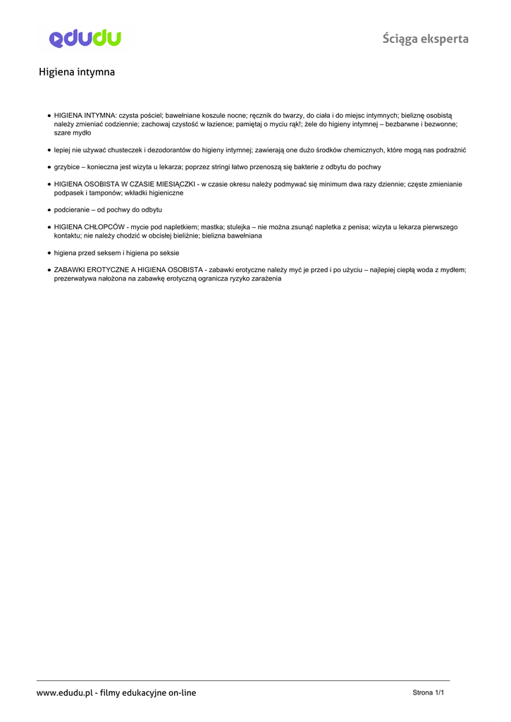 Ściąga eksperta Higiena intymna HIGIENA INTYMNA: czysta pościel; bawełniane koszule nocne; ręcznik do twarzy, do ciała i do miejsc intymnych; bieliznę osobistą należy zmieniać codziennie; zachowaj czystość w łazience; pamiętaj o myciu rąk!; żele do higieny intymnej – bezbarwne i bezwonne; szare mydło lepiej nie używać chusteczek i dezodorantów do higieny intymnej; zawierają one dużo środków chemicznych, które mogą nas podrażnić grzybice – konieczna jest wizyta u lekarza; poprzez stringi łatwo przenoszą się bakterie z odbytu do pochwy HIGIENA OSOBISTA W CZASIE MIESIĄCZKI - w czasie okresu należy podmywać się minimum dwa razy dziennie; częste zmienianie podpasek i tamponów; wkładki higieniczne podcieranie – od pochwy do odbytu HIGIENA CHŁOPCÓW - mycie pod napletkiem; mastka; stulejka – nie można zsunąć napletka z penisa; wizyta u lekarza pierwszego kontaktu; nie należy chodzić w obcisłej bieliźnie; bielizna bawełniana higiena przed seksem i higiena po seksie ZABAWKI EROTYCZNE A HIGIENA OSOBISTA - zabawki erotyczne należy myć je przed i po użyciu – najlepiej ciepłą woda z mydłem; prezerwatywa nałożona na zabawkę erotyczną ogranicza ryzyko zarażenia www.edudu.pl - filmy edukacyjne on-line Powered by TCPDF (www.tcpdf.org) Strona 1/1