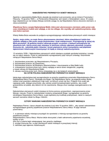 NABOŻEŃSTWO PIERWSZYCH SOBÓT MIESIĄCA Zgodnie z zapowiedzią Matka Boża ukazała się siostrze Łucji ponownie, już po śmierci Franciszka i Hiacynty, 10 grudnia 1925 r., w Pontevedra (Hiszpania), tym razem z Dzieciątkiem Jezus. W czasie tego objawienia po raz kolejny Maryja zwróciła uwagę na Jej Niepokalane Serce otoczone cierniami, a Jezus powiedział: Współczuj Sercu swojej Najświętszej Matki, które jest ukoronowane cierniami, jakie przez cały czas niewdzięczni ludzie weń wbijają, a nie ma nikogo, kto czyniłby akt zadośćuczynienia, żeby owe kolce wyrwać. Wtedy Matka Boża wezwała do podjęcia wynagradzającego nabożeństwa pierwszych sobót miesiąca: Spójrz, moja córko, na moje Serce ukoronowane cierniami, które niewdzięczni ludzie bez ustanku wbijają w Nie przez swoje bluźnierstwa i brak wdzięczności. Przynajmniej ty staraj się Mnie pocieszyć. W godzinę śmierci obiecuję przyjść na pomoc z łaskami potrzebnymi do zbawienia tym, którzy przez pięć miesięcy w pierwsze soboty odprawia spowiedź, przyjmą Komunię św., odmówią jeden różaniec i przez piętnaście minut rozmyślania nad piętnastu tajemnicami różańcowymi towarzyszyć mi będą w intencji zadośćuczynienia. 13 września 1939 r. Nabożeństwo pierwszych sobót miesiąca uzyskało aprobatę kościelną i rozwija się na całym świecie. Przez to nabożeństwo wynagradzamy pięć różnych zniewag i bluźnierstw raniących Niepokalane Serce Maryi: 1. bluźnierstwa przeciwko Jej Niepokalanemu Poczęciu, 2. bluźnierstwa przeciw Jej Dziewictwu, 3. bluźnierstwa przeciw Jej Boskiemu Macierzyństwu i nieuznawanie w Niej Matki ludzi, 4. znieważanie czynione przez tych, którzy wpajają w serca dzieci obojętność, pogardę, a nawet odrazę do Niepokalanej Matki, 5. obrazę czynioną przez tych, którzy znieważają Ją w Jej świętych wizerunkach. NA CZYM POLEGA NABOŻEŃSTWO PIERWSZYCH SOBÓT MIESIĄCA Istotą tego nabożeństwa jest wynagrodzenie za grzechy popełnione przeciwko Niepokalanemu Sercu Najświętszej Maryi Panny. Obrażają one Boga i Jej Niepokalane Serce, są pogardą wobec Bożej miłości oraz powodem piekielnych mąk ludzi, za których umarł Jej Syn. Pragnie Ona ocalić jak najwięcej osób, dlatego przychodzi, aby ostrzec przed konsekwencjami grzechu, aby ocalić grzeszników od piekła, aby skłonić ich do nawrócenia. Maryja chce naszego zaangażowania w tę misję. Nabożeństwo pierwszych sobót miesiąca to forma pomocy grzesznikom, zaproponowana przez Maryję i Jezusa. Przez to nabożeństwo możemy przepraszać Boga i wynagradzać za grzechy obrażające Niepokalane Serce Maryi, a gdy będziemy tę modlitwę praktykować, także w naszych sercach wzrośnie miłość ku Bogu i bliźnim. CZTERY WARUNKI NABOŻEŃSTWA PIERWSZYCH SOBÓT MIESIĄCA Najświętsza Panna i Jezus ukazali się siostrze Łucji dnia 10 grudnia 1925 r., aby opisać nabożeństwo wynagradzające grzechy popełnione przeciw Niepokalanemu Sercu Maryi. W jego ramach powinniśmy: 1. w pierwsze soboty miesiąca przystąpić do spowiedzi z intencją wynagrodzenia za grzechy popełnione przeciw Niepokalanemu Sercu Maryi. Można także skorzystać z łaski sakramentu pojednania wcześniej, byleby w tym dniu być w stanie łaski uświęcającej, bez grzechu ciężkiego; 2. przyjąć Komunię Św. w pięć pierwszych sobót miesiąca w powyższej intencji; 3. odmówić pięć tajemnic różańcowych; 4. przez piętnaście minut rozważać tajemnice różańcowe ofiarując tę medytację w wymienionej intencji. Niezbędnym warunkiem dobrego odprawienia nabożeństwa jest nastawienie, z jakim te praktyki wypełniamy, co Jezus podkreślił w objawieniu 15 lutego 1926 r.: To jest prawda, moja córko, ze wiele dusz zaczyna, lecz mało kto kończy, i ci, którzy kończą, mają za cel otrzymać przyrzeczone łaski; Ja jednak wolę, żeby odprawiali pięć pierwszych sobót miesiąca w celu wynagrodzenia Niepokalanemu Sercu twojej Matki Niebieskiej, niż żeby odprawiać piętnaście bezdusznie i z obojętnością... Jezus wymienia trzy grupy osób odprawiających nabożeństwo pierwszych sobót miesiąca: tych, którzy zaczynają je odprawiać, lecz nie kończą; takich, którzy kończą, ale odprawiają je jedynie ze względu na obiecane łaski; i w końcu trzecia grupa to osoby, które czynią to przede wszystkim w celu wynagrodzenia Niepokalanemu Sercu NMP; one najbardziej podobają się Jezusowi. Jeśli ktoś nie będzie mógł odprawić tego nabożeństwa w sobotę, może, za zgodą kapłana, praktykować je w niedzielę po pierwszej sobocie. W pobożnym wzbudzaniu właściwej intencji potrzebnej do dobrego odprawienia nabożeństwa do Niepokalanego Serca Maryi pomoże nam modlitwa pozostawiona przez Piękną Panią: Jezu, to z miłości do Ciebie, za nawrócenie grzeszników i dla zadośćuczynienia za grzechy popełnione przeciwko Niepokalanemu Sercu Maryi (13 lipca 1917 r.).