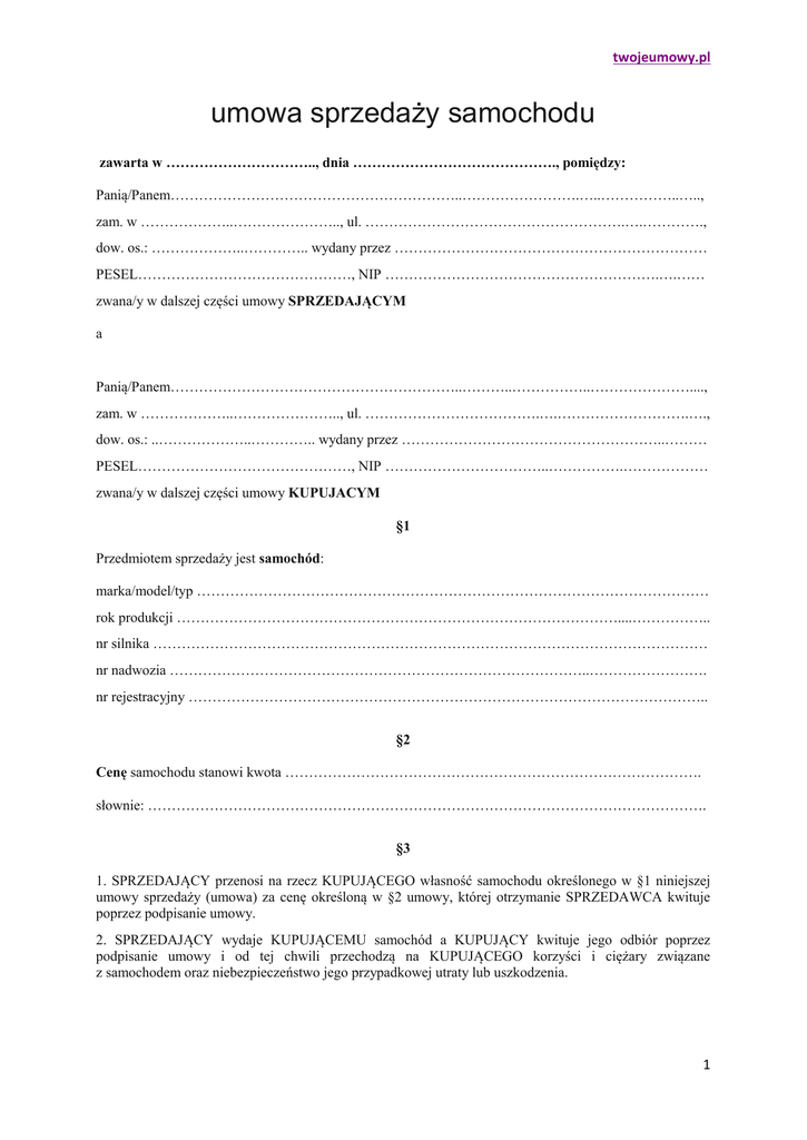 twojeumowy.pl umowa sprzedaży samochodu zawarta w ………………………….., dnia ……………………………………., pomiędzy: Panią/Panem……………………………………………………..…………………….…..……………..….., zam. w ………………..………………….., ul. ……………………………………………….….…………., dow. os.: ………………..………….. wydany przez ………………………………………………………… PESEL………………………………………, NIP ………………………………………………….….…… zwana/y w dalszej części umowy SPRZEDAJĄCYM a Panią/Panem……………………………………………………..………..……………..…………………...., zam. w ………………..………………….., ul. ……………………………….….……………………….…., dow. os.: ..………………..………….. wydany przez ………………………………………………..……… PESEL………………………………………, NIP ……………………………..…………….……………… zwana/y w dalszej części umowy KUPUJACYM §1 Przedmiotem sprzedaży jest samochód: marka/model/typ ……………………………………………………………………………………………… rok produkcji …………………………………………………………………………………....…………….. nr silnika ……………………………………………………………………………………………………… nr nadwozia ……………………………………………………………………………..……………………. nr rejestracyjny ……………………………………………………………………………………………….. §2 Cenę samochodu stanowi kwota ……………………………………………………………………………. słownie: ………………………………………………………………………………………………………. §3 1. SPRZEDAJĄCY przenosi na rzecz KUPUJĄCEGO własność samochodu określonego w §1 niniejszej umowy sprzedaży (umowa) za cenę określoną w §2 umowy, której otrzymanie SPRZEDAWCA kwituje poprzez podpisanie umowy. 2. SPRZEDAJĄCY wydaje KUPUJĄCEMU samochód a KUPUJĄCY kwituje jego odbiór poprzez podpisanie umowy i od tej chwili przechodzą na KUPUJĄCEGO korzyści i ciężary związane z samochodem oraz niebezpieczeństwo jego przypadkowej utraty lub uszkodzenia. 1 twojeumowy.pl §4 1. SPRZEDAJĄCY oświadcza, że samochód (i) stanowi jego wyłączną własność, samochód jest wolny od: (ii) wad prawnych, (iii) praw osób trzecich, oraz (iv) nie toczy się żadne postępowanie, którego przedmiotem jest samochód, nadto że (v) nie stanowi on przedmiotu zabezpieczenia. 2. Jednakże jeżeli z powodu jakiejkolwiek wady prawnej samochodu KUPUJĄCY będzie zmuszony wydać go osobie trzeciej to SPRZEDAWCA będzie zobowiązany do zwrotu otrzymanej ceny. §5 SPRZEDAJĄCY oświadcza, że pojazd nie ma ukrytych wad technicznych, a KUPUJĄCY potwierdza że zapoznał się ze stanem technicznym samochodu. §6 Koszty realizacji niniejszej umowy oraz koszty opłaty skarbowej obciążają KUPUJĄCEGO. §7 W sprawach nie uregulowanych w niniejszej umowie zastosowanie mają obowiązujące w tym zakresie przepisy Kodeksu cywilnego a wszelkie zmiany umowy wymagają formy pisemnej pod rygorem nieważności. §8 Umowę sporządzono w dwóch jednobrzmiących egzemplarzach, po jednym egzemplarzu dla każdej ze stron. podpisy stron: SPRZEDAJĄCY : ………………………………………………………………………………………….. KUPUJĄCY : ………………………………………………………………………………………………. 2