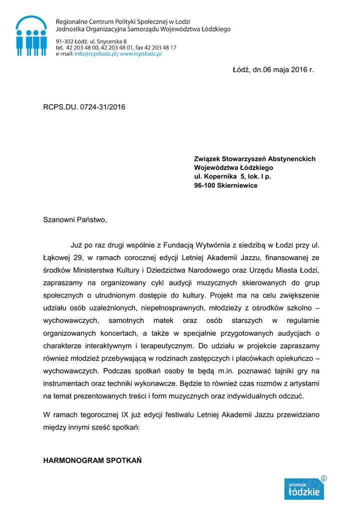 Łódź, dn.06 maja 2016 r. RCPS.DU. 0724-31/2016 Związek Stowarzyszeń Abstynenckich Województwa Łódzkiego ul. Kopernika 5, lok. I p. 96-100 Skierniewice Szanowni Państwo, Już po raz drugi wspólnie z Fundacją Wytwórnia z siedzibą w Łodzi przy ul. Łąkowej 29, w ramach corocznej edycji Letniej Akademii Jazzu, finansowanej ze środków Ministerstwa Kultury i Dziedzictwa Narodowego oraz Urzędu Miasta Łodzi, zapraszamy na organizowany cykl audycji muzycznych skierowanych do grup społecznych o utrudnionym dostępie do kultury. Projekt ma na celu zwiększenie udziału osób uzależnionych, niepełnosprawnych, młodzieży z ośrodków szkolno – wychowawczych, samotnych matek oraz osób starszych w regularnie organizowanych koncertach, a także w specjalnie przygotowanych audycjach o charakterze interaktywnym i terapeutycznym. Do udziału w projekcie zapraszamy również młodzież przebywającą w rodzinach zastępczych i placówkach opiekuńczo – wychowawczych. Podczas spotkań osoby te będą m.in. poznawać tajniki gry na instrumentach oraz techniki wykonawcze. Będzie to również czas rozmów z artystami na temat prezentowanych treści i form muzycznych oraz indywidualnych odczuć. W ramach tegorocznej IX już edycji festiwalu Letniej Akademii Jazzu przewidziano między innymi sześć spotkań: HARMONOGRAM SPOTKAŃ DATA 13.07.2016 (środa) Godz. 16.00 20.07.2016 (środa) Godz. 16.00 27.07.2016 (środa) Godz. 16.00 NAZWA I AUDYCJE MUZYCZNE DŹWIĘK – RUCH – KOLOR / GRAŻYNA GROBELNA 10.08.2016 (środa) Godz. 16.00 17.08.2016 (środa) Godz. 16.00 24.08.2016 (środa) Godz. 16.00 IV AUDYCJE MUZYCZNE AGNIESZKA KIEPUSZEWSKA II AUDYCJE MUZYCZNE RAFAŁ SUPIŃSKI III AUDYCJE MUZYCZNE MARTA SMOŁEK V AUDYCJE MUZYCZNE MARIA GÓRSKA VI AUDYCJE MUZYCZNE AGATA KUBIAK OPIS SPOTKAŃ I PROWADZĄCYCH I AUDYCJE MUZYCZNE DŹWIĘK – RUCH – KOLOR / GRAŻYNA GROBELNA 13 lipca 2016 r. Godz. 16.00 Pierwsze spotkanie pt. „Dźwięk – ruch – kolor” poprowadzi Grażyna Grobelna (Warszawa) - filozof, muzyk, performerka i pisarka. Celem audycji jest uwolnienie ekspresji wokalno-ruchowej i plastycznej uczestników na drodze improwizacji indywidualnej i wspólnej, gdzie improwizację potraktujemy jako bezsłowną wypowiedź. Uczestnicy będą mieli do dyspozycji materiały plastyczne, instrumenty perkusyjne, głos. Bazą do rozpoczęcia aktywności jest oddech (ćwiczenia oddechowe, relaksacyjne) i wynikający z niego ruch i dźwięk. Pobudzając ciało i głos do aktywności będziemy szukać własnej barwy oddechu, dźwięku dla ruchu, barw dźwięku. Pod koniec uczestnicy tworzą wspólny utwór improwizowany ruchem, głosem, wzbogacony o ekspresję plastyczną. II AUDYCJE MUZYCZNE RAFAŁ SUPIŃSKI / MUSICAL i TEATR CIENI 20.07.2016 r. Godz. 16.00 Podczas drugich audycji muzycznych w ramach IX LAJ uczestnicy poznają tajniki musicalu – formy teatralnej łączącej muzykę, piosenki i taniec. Wspólnie nauczą się i wykonają piosenkę musicalową, która będzie łączyła elementy wokalne i taneczne. W drugiej części spotkania prowadzący zaangażuje uczestników w niezwykły pokaz teatru cieni. Wspólnie przygotują szablony, a następnie tchną w nie życie na ekranie. Spotkanie poprowadzi Rafał Supiński – aktor i wokalista musicalowy. Obecnie współpracuje z Operą i Filharmonią Podlaską w Białymstoku. Od lat łączy aktorstwo z muzyką, poszukując naturalnej wrażliwości i talentu w każdym człowieku. Swoje pasje rozwijał studiując w Państwowej Wyższej Szkole Teatralnej im. L. Solskiego w Krakowie. III AUDYCJE MUZYCZNE MARTA SMOŁEK / NA LUDOWO 27.07.2016 r. Godz. 16.00 Kolejne spotkanie muzyczne dla osób zagrożonych wykluczeniem będzie poświęcone muzyce ludowej. Uczestnicy spotkania będą uczyć się ludowych przyśpiewek z akompaniamentem ludowych instrumentów, takich jak suka biłgorajska i fidel płockiej, które będą mieli okazję po raz pierwszy w życiu poznać i usłyszeć. Ponadto, nauczą się kroków oberka i wspólnie zatańczą przy akompaniamencie instrumentów ludowych. Spotkanie poprowadzi Marta Smołek – multiinstrumentalistka, absolwentka Akademii Muzycznej w Krakowie w klasie wiolonczeli oraz w klasie fideli kolanowych. Gra m.in. na wiolonczeli, suce biłgorajskiej, fideli płockiej, sarangi, gadułce, lirze greckiej, basach ludowych. Występowała w największych salach filharmonii w Europie pod batutą Krzysztofa Pendereckiego, Gabriela Chmury i innych. Koncertowała w Rosji, Azerbejdżanie, Chinach, Egipcie, Pakistanie. Wraz z czołowymi pakistańskimi muzykami nagrała płytę „Poland-Pakistan” (2012). IV AUDYCJE MUZYCZNE AGNIESZKA KIEPUSZEWSKA / IDZIEMY DO STUDIA 10.08.2016 r. Godz. 16.00 Kolejne spotkanie skierowane do osób o utrudnionym dostępnie do kultury będzie poświęcone wspólnemu tworzeniu muzyki na żywo. Wraz z prowadzącą spotkanie, uczestnicy jak prawdziwi artyści, wspólnie stworzą piosenkę, przećwiczą ją podczas zajęć, a następnie nagrają z wykorzystaniem loopera i elektroniki. Już zeszłoroczne spotkania pokazały, że osoby uczestniczące w audycjach szczególnie doceniają możliwość wcielenia się w rolę artysty na scenie. Tym razem wcielą się w artystę w studiu nagraniowym. Będzie to dla nich niezwykłe doświadczenie. Ponadto, po spotkaniu zostanie im pamiątka w postaci wspólnego nagrania, do którego będą mogli wracać. To wyjątkowe spotkanie poprowadzi Agnieszka Kiepuszewska – wokalistka jazzowa, która od lat udziela się w projektach skierowanych do osób starszych, czy niepełnosprawnych. Agnieszka Kiepuszewska – urodzona w 1984 roku, w Słupsku. Od dzieciństwa grała na fortepianie i śpiewała. Jej pierwsze inspiracje pochodzące z muzyki klasycznej nie zwiastowały późniejszego zwrotu w stronę jazzu i muzyki elektronicznej, nadały jednak subtelny rys w jej dalszych poszukiwaniach muzycznych. W 2003 rozpoczęła studia w Akademii Muzycznej w Poznaniu. Na ki