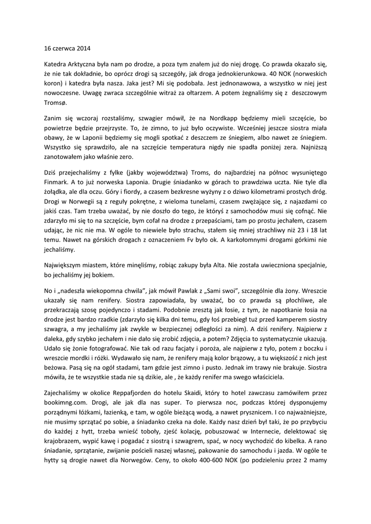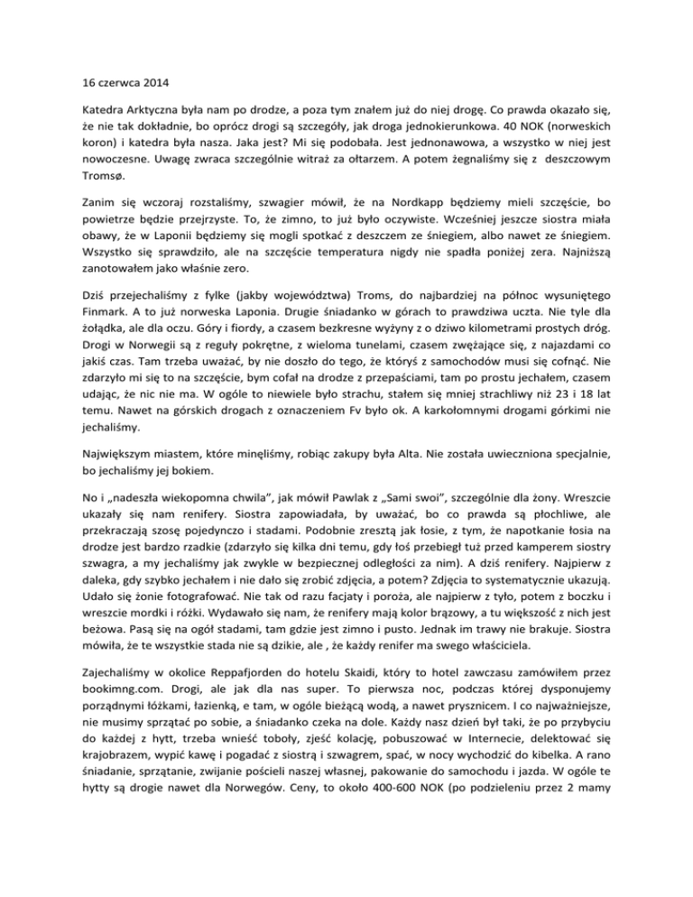 16 czerwca 2014 Katedra Arktyczna była nam po drodze, a poza tym znałem już do niej drogę. Co prawda okazało się, że nie tak dokładnie, bo oprócz drogi są szczegóły, jak droga jednokierunkowa. 40 NOK (norweskich koron) i katedra była nasza. Jaka jest? Mi się podobała. Jest jednonawowa, a wszystko w niej jest nowoczesne. Uwagę zwraca szczególnie witraż za ołtarzem. A potem żegnaliśmy się z deszczowym Tromsø. Zanim się wczoraj rozstaliśmy, szwagier mówił, że na Nordkapp będziemy mieli szczęście, bo powietrze będzie przejrzyste. To, że zimno, to już było oczywiste. Wcześniej jeszcze siostra miała obawy, że w Laponii będziemy się mogli spotkać z deszczem ze śniegiem, albo nawet ze śniegiem. Wszystko się sprawdziło, ale na szczęście temperatura nigdy nie spadła poniżej zera. Najniższą zanotowałem jako właśnie zero. Dziś przejechaliśmy z fylke (jakby województwa) Troms, do najbardziej na północ wysuniętego Finmark. A to już norweska Laponia. Drugie śniadanko w górach to prawdziwa uczta. Nie tyle dla żołądka, ale dla oczu. Góry i fiordy, a czasem bezkresne wyżyny z o dziwo kilometrami prostych dróg. Drogi w Norwegii są z reguły pokrętne, z wieloma tunelami, czasem zwężające się, z najazdami co jakiś czas. Tam trzeba uważać, by nie doszło do tego, że któryś z samochodów musi się cofnąć. Nie zdarzyło mi się to na szczęście, bym cofał na drodze z przepaściami, tam po prostu jechałem, czasem udając, że nic nie ma. W ogóle to niewiele było strachu, stałem się mniej strachliwy niż 23 i 18 lat temu. Nawet na górskich drogach z oznaczeniem Fv było ok. A karkołomnymi drogami górkimi nie jechaliśmy. Największym miastem, które minęliśmy, robiąc zakupy była Alta. Nie została uwieczniona specjalnie, bo jechaliśmy jej bokiem. No i „nadeszła wiekopomna chwila”, jak mówił Pawlak z „Sami swoi”, szczególnie dla żony. Wreszcie ukazały się nam renifery. Siostra zapowiadała, by uważać, bo co prawda są płochliwe, ale przekraczają szosę pojedynczo i stadami. Podobnie zresztą jak łosie, z tym, że napotkanie łosia na drodze jest bardzo rzadkie (zdarzyło się kilka dni temu, gdy łoś przebiegł tuż przed kamperem siostry szwagra, a my jechaliśmy jak zwykle w bezpiecznej odległości za nim). A dziś renifery. Najpierw z daleka, gdy szybko jechałem i nie dało się zrobić zdjęcia, a potem? Zdjęcia to systematycznie ukazują. Udało się żonie fotografować. Nie tak od razu facjaty i poroża, ale najpierw z tyło, potem z boczku i wreszcie mordki i różki. Wydawało się nam, że renifery mają kolor brązowy, a tu większość z nich jest beżowa. Pasą się na ogół stadami, tam gdzie jest zimno i pusto. Jednak im trawy nie brakuje. Siostra mówiła, że te wszystkie stada nie są dzikie, ale , że każdy renifer ma swego właściciela. Zajechaliśmy w okolice Reppafjorden do hotelu Skaidi, który to hotel zawczasu zamówiłem przez bookimng.com. Drogi, ale jak dla nas super. To pierwsza noc, podczas której dysponujemy porządnymi łóżkami, łazienką, e tam, w ogóle bieżącą wodą, a nawet prysznicem. I co najważniejsze, nie musimy sprzątać po sobie, a śniadanko czeka na dole. Każdy nasz dzień był taki, że po przybyciu do każdej z hytt, trzeba wnieść toboły, zjeść kolację, pobuszować w Internecie, delektować się krajobrazem, wypić kawę i pogadać z siostrą i szwagrem, spać, w nocy wychodzić do kibelka. A rano śniadanie, sprzątanie, zwijanie pościeli naszej własnej, pakowanie do samochodu i jazda. W ogóle te hytty są drogie nawet dla Norwegów. Ceny, to około 400-600 NOK (po podzieleniu przez 2 mamy cenę w polskich złotych). Dzisiejszy hotel to prawdziwe cacko. Na dworze padał śnieg, tak, że nawet spodziewałem się, że będę go odśnieżał. Na szczęście topił się w oczach. Rano nie było po nim śladu.