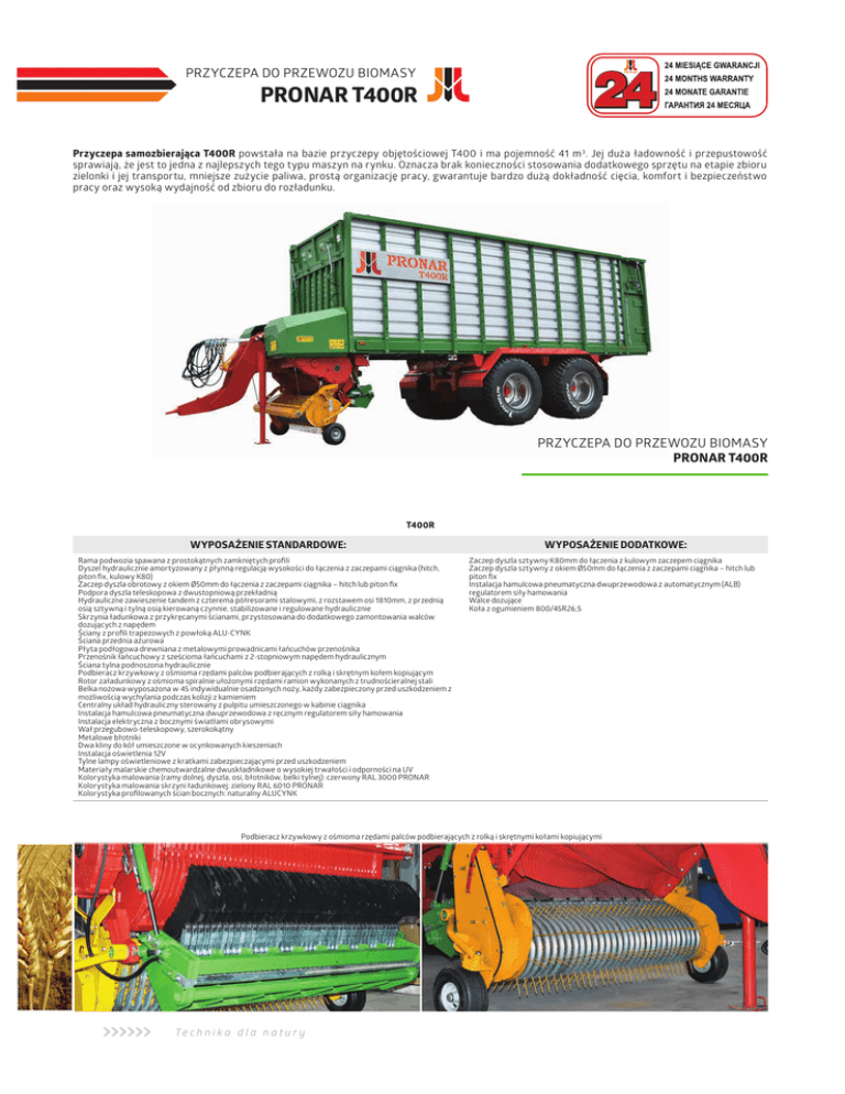 PRZYCZEPA DO PRZEWOZU BIOMASY PRONAR T400R Przyczepa samozbierająca T400R powstała na bazie przyczepy objętościowej T400 i ma pojemność 41 m 3. Jej duża ładowność i przepustowość sprawiają, że jest to jedna z najlepszych tego typu maszyn na rynku. Oznacza brak konieczności stosowania dodatkowego sprzętu na etapie zbioru zielonki i jej transportu, mniejsze zużycie paliwa, prostą organizację pracy, gwarantuje bardzo dużą dokładność cięcia, komfort i bezpieczeństwo pracy oraz wysoką wydajność od zbioru do rozładunku. PRZYCZEPA DO PRZEWOZU BIOMASY PRONAR T400R T400R WYPOSAŻENIE STANDARDOWE: Rama podwozia spawana z prostokątnych zamkniętych profili Dyszel hydraulicznie amortyzowany z płynną regulacją wysokości do łączenia z zaczepami ciągnika (hitch, piton fix, kulowy K80) Zaczep dyszla obrotowy z okiem Ø50mm do łączenia z zaczepami ciągnika – hitch lub piton fix Podpora dyszla teleskopowa z dwustopniową przekładnią Hydrauliczne zawieszenie tandem z czterema półresorami stalowymi, z rozstawem osi 1810mm, z przednią osią sztywną i tylną osią kierowaną czynnie, stabilizowane i regulowane hydraulicznie Skrzynia ładunkowa z przykręcanymi ścianami, przystosowana do dodatkowego zamontowania walców dozujących z napędem Ściany z profili trapezowych z powłoką ALU-CYNK Ściana przednia ażurowa Płyta podłogowa drewniana z metalowymi prowadnicami łańcuchów przenośnika Przenośnik łańcuchowy z sześcioma łańcuchami z 2-stopniowym napędem hydraulicznym Ściana tylna podnoszona hydraulicznie Podbieracz krzywkowy z ośmioma rzędami palców podbierających z rolką i skrętnym kołem kopiującym Rotor załadunkowy z ośmioma spiralnie ułożonymi rzędami ramion wykonanych z trudnościeralnej stali Belka nożowa wyposażona w 45 indywidualnie osadzonych noży, każdy zabezpieczony przed uszkodzeniem z możliwością wychylania podczas kolizji z kamieniem Centralny układ hydrauliczny sterowany z pulpitu umieszczonego w kabinie ciągnika Instalacja hamulcowa pneumatyczna dwuprzewodowa z ręcznym regulatorem siły hamowania Instalacja elektryczna z bocznymi światłami obrysowymi Wał przegubowo-teleskopowy, szerokokątny Metalowe błotniki Dwa kliny do kół umieszczone w ocynkowanych kieszeniach Instalacja oświetlenia 12V Tylne lampy oświetleniowe z kratkami zabezpieczającymi przed uszkodzeniem Materiały malarskie chemoutwardzalne dwuskładnikowe o wysokiej trwałości i odporności na UV Kolorystyka malowania (ramy dolnej, dyszla, osi, błotników, belki tylnej): czerwony RAL 3000 PRONAR Kolorystyka malowania skrzyni ładunkowej: zielony RAL 6010 PRONAR Kolorystyka profilowanych ścian bocznych: naturalny ALUCYNK WYPOSAŻENIE DODATKOWE: Zaczep dyszla sztywny K80mm do łączenia z kulowym zaczepem ciągnika Zaczep dyszla sztywny z okiem Ø50mm do łączenia z zaczepami ciągnika – hitch lub piton fix Instalacja hamulcowa pneumatyczna dwuprzewodowa z automatycznym (ALB) regulatorem siły hamowania Walce dozujące Koła z ogumieniem 800/45R26,5 Podbieracz krzywkowy z ośmioma rzędami palców podbierających z rolką i skrętnymi kołami kopiującymi Te ch n i k a d l a n a tu ry Napęd rotora Centralny układ hydrauliczny sterowany z pulpitu Zawieszenie hydrauliczne tandem TECHNICAL DATA T400R Technicznie (konstrukcyjnie) dopuszczalna masa całkowita [kg] 28000 Dopuszczalna masa całkowita [kg] 24000 Ładowność [kg] 13200 Masa własna [kg] 13200 Pojemność ładunkowa [m 3] 41 Pojemność ładunkowa przy średnim sprasowaniu [m 3] 72 Długość skrzyni ładunkowej wewnątrz [mm] 7840 Szerokość skrzyni ładunkowej wewnątrz [mm] 2300 Wysokość ścian skrzyni [mm] 2300 Wymiary gabarytowe (dł./szer./wys.) [mm] 10600 / 2900 / 3980 Grubość blachy ścian bocznych [mm] 0,75 Wysokość platformy od podłoża [mm] 1700 Szerokość podbieracza [mm] 2000 Całkowita liczba palców podbieracza [szt.] 240 (120 podwójnych) Średnica rotora [mm] 800 Liczba noży mechanizmu tnącego ( rotora ) [szt.] 45 Teoretyczna długość cięcia [mm] 34 Rozstaw kół [mm] 2200 Rozstaw osi [mm] 1810 Zawieszenie hydrauliczne, tandem Obciążenie oka dyszla [kg] 4000 Rozmiar ogumienia 700/50-26,5 Prędkość konstrukcyjna 40 Minimalne zapotrzebowanie mocy ciągnika 182/133,8 Obroty WOM ciągnika 1000 Wymagania dotyczące parametrów układu hydrauliki zewnętrznej ciągnika: - max. ciśnienie [bar] - max. wydatek [ltr./min.] 200 130 Ściana tylna podnoszona hydraulicznie, skrzynia przystosowana do montażu walców dozujących z napędem PRZYCZEPY PRO NAR Przenośnik z 6-cioma łańcuchami Rotor załadunkowy z trudnościeralnej blachy w w w. p ro n a r. p l