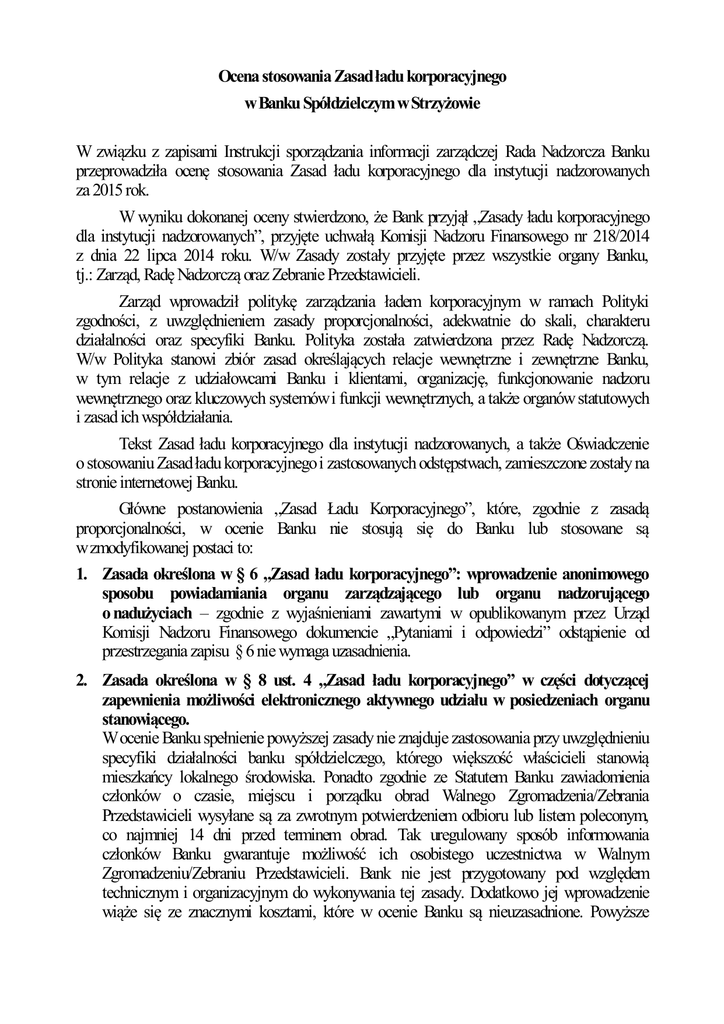 Ocena stosowania Zasad ładu korporacyjnego w Banku Spółdzielczym w Strzyżowie W związku z zapisami Instrukcji sporządzania informacji zarządczej Rada Nadzorcza Banku przeprowadziła ocenę stosowania Zasad ładu korporacyjnego dla instytucji nadzorowanych za 2015 rok. W wyniku dokonanej oceny stwierdzono, że Bank przyjął „Zasady ładu korporacyjnego dla instytucji nadzorowanych”, przyjęte uchwałą Komisji Nadzoru Finansowego nr 218/2014 z dnia 22 lipca 2014 roku. W/w Zasady zostały przyjęte przez wszystkie organy Banku, tj.: Zarząd, Radę Nadzorczą oraz Zebranie Przedstawicieli. Zarząd wprowadził politykę zarządzania ładem korporacyjnym w ramach Polityki zgodności, z uwzględnieniem zasady proporcjonalności, adekwatnie do skali, charakteru działalności oraz specyfiki Banku. Polityka została zatwierdzona przez Radę Nadzorczą. W/w Polityka stanowi zbiór zasad określających relacje wewnętrzne i zewnętrzne Banku, w tym relacje z udziałowcami Banku i klientami, organizację, funkcjonowanie nadzoru wewnętrznego oraz kluczowych systemów i funkcji wewnętrznych, a także organów statutowych i zasad ich współdziałania. Tekst Zasad ładu korporacyjnego dla instytucji nadzorowanych, a także Oświadczenie o stosowaniu Zasad ładu korporacyjnego i zastosowanych odstępstwach, zamieszczone zostały na stronie internetowej Banku. Główne postanowienia „Zasad Ładu Korporacyjnego”, które, zgodnie z zasadą proporcjonalności, w ocenie Banku nie stosują się do Banku lub stosowane są w zmodyfikowanej postaci to: 1. Zasada określona w § 6 „Zasad ładu korporacyjnego”: wprowadzenie anonimowego sposobu powiadamiania organu zarządzającego lub organu nadzorującego o nadużyciach – zgodnie z wyjaśnieniami zawartymi w opublikowanym przez Urząd Komisji Nadzoru Finansowego dokumencie „Pytaniami i odpowiedzi” odstąpienie od przestrzegania zapisu § 6 nie wymaga uzasadnienia. 2. Zasada określona w § 8 ust. 4 „Zasad ładu korporacyjnego” w części dotyczącej zapewnienia możliwości elektronicznego aktywnego udziału w posiedzeniach organu stanowiącego. W ocenie Banku spełnienie powyższej zasady nie znajduje zastosowania przy uwzględnieniu specyfiki działalności banku spółdzielczego, którego większość właścicieli stanowią mieszkańcy lokalnego środowiska. Ponadto zgodnie ze Statutem Banku zawiadomienia członków o czasie, miejscu i porządku obrad Walnego Zgromadzenia/Zebrania Przedstawicieli wysyłane są za zwrotnym potwierdzeniem odbioru lub listem poleconym, co najmniej 14 dni przed terminem obrad. Tak uregulowany sposób informowania członków Banku gwarantuje możliwość ich osobistego uczestnictwa w Walnym Zgromadzeniu/Zebraniu Przedstawicieli. Bank nie jest przygotowany pod względem technicznym i organizacyjnym do wykonywania tej zasady. Dodatkowo jej wprowadzenie wiąże się ze znacznymi kosztami, które w ocenie Banku są nieuzasadnione. Powyższe uzasadnia rezygnację z organizacji posiedzeń organu stanowiącego poprzez zdalny, elektroniczny udział członków. 3. Zasady określone w § 12 ust. 1 i 2 „Zasad ładu korporacyjnego” – dokapitalizowanie i dofinansowanie Banku przez udziałowców. W ocenie Banku zasady te nie dotyczą Banku, m.in. ze względu na fakt, iż aktualnie obowiązujące przepisy prawa nie dopuszczają możliwości zaliczenia funduszu udziałowego do funduszy własnych Banku tzw. CET I, co oznacza, iż nie ma możliwości skutecznego dokapitalizowania Banku. Ponadto obowiązek dostarczenia wsparcia finansowego wydaje się być racjonalny dla banków komercyjnych, gdzie występują udziałowcy większościowi. W przypadku Banku, który posiada dużą liczbę udziałowców będących osobami fizycznymi, nałożenie na nich dodatkowego obowiązku udzielenia wsparcia finansowego jest niewykonalne i nieracjonalne. W związku z powyższym Bank postanowił nie stosować zasad określonych w tych przepisach. 4. Zasady określone w § 22 ust. 1 i 2 „Zasad ładu korporacyjnego” – niezależność członków organów Banku. Zgodnie z Ustawą z dnia 16 września 1982 r. Prawo spółdzielcze, do organów spółdzielni mają prawo być wybierani jej członkowie. W związku z powyższym, Bank uznaje, iż zasady określone w przytoczonych przepisach, dot. niezależności członków organu nadzorującego, nie znajdują zastosowania do banku funkcjonującego w formie spółdzielni, jakim jest Bank. Jednocześnie Rada Nadzorcza stwierdza, że badanie bilansu w Banku przeprowadza biegły rewident, który nie pełni funkcji członka Rady Nadzorczej Banku. 5. Zasady określone w „Zasadach ładu korporacyjnego” dot. komitetu audytu oraz komórki audytu. Zgodnie z art. 86 ust. 2 pkt 4) Ustawy z dnia 7 maja 2009 r. o biegłych rewidentach i ich samorządzie, podmiotach uprawnionych do badania sprawozdań finansowych oraz o nadzorze publicznym, banki spółdzielcze nie mają obowiązku powoływania komitetu audytu, w związku z czym postanowienia Zasad w tym zakresie nie stosuje się do Banku. 6. Zasady określone w rozdziale 9 "Zasad ładu korporacyjnego" - „Wykonywanie uprawnień z aktywów nabytych na ryzyko klienta” W związku z niewykonywaniem przez Bank działalności w zakresie określonym w Rozdziale 9, Bank nie wprowadził postanowień tego Rozdziału do swojej Polityki. W 2015 roku Bank przestrzegał wszystkich zasad zawartych w Polityce przestrzegania Zasad ładu korporacyjnego, z uwzględnieniem wyżej wymienionych wyłączeń. Bank dąży do zapewnienia jak największej transparentności swoich działań, należytej jakości komunikacji z klientami oraz ochrony praw udziałowców, także w materiałach nie regulowanych przepisami prawa. Rada Nadzorcza ocenia pozytywnie przestrzeganie przez Bank Zasad ładu korporacyjnego, opracowanych przez Komisję Nadzoru Finansowego. Rada Nadzorcza