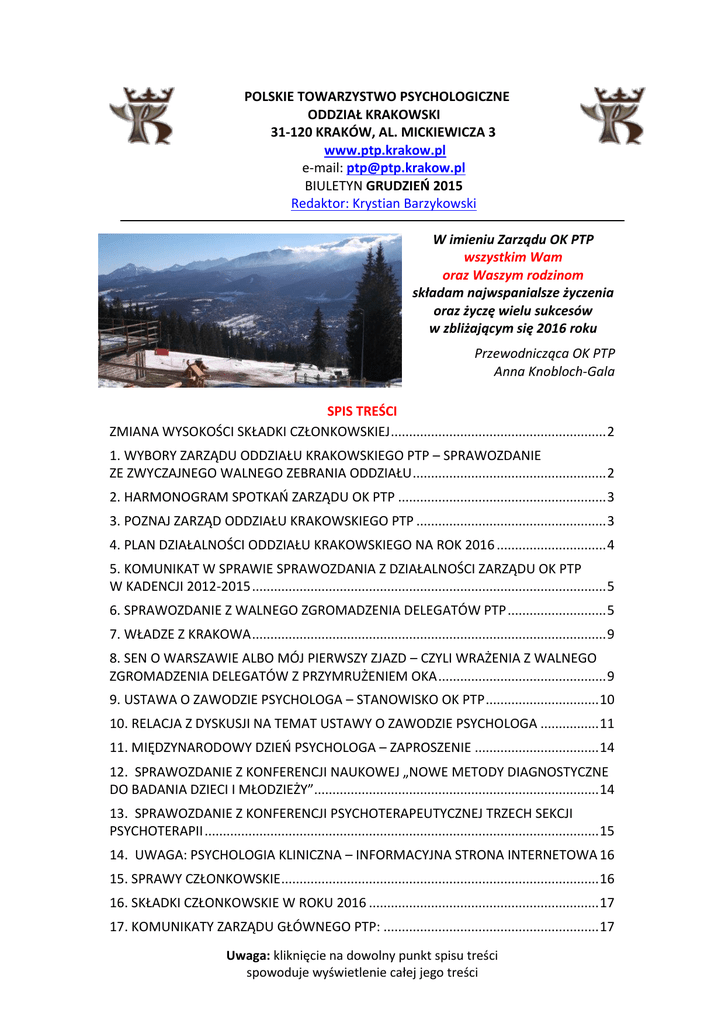 POLSKIE TOWARZYSTWO PSYCHOLOGICZNE ODDZIAŁ KRAKOWSKI 31-120 KRAKÓW, AL. MICKIEWICZA 3 www.ptp.krakow.pl e-mail: [email protected] BIULETYN GRUDZIEŃ 2015 Redaktor: Krystian Barzykowski W imieniu Zarządu OK PTP wszystkim Wam oraz Waszym rodzinom składam najwspanialsze życzenia oraz życzę wielu sukcesów w zbliżającym się 2016 roku Przewodnicząca OK PTP Anna Knobloch-Gala SPIS TREŚCI ZMIANA WYSOKOŚCI SKŁADKI CZŁONKOWSKIEJ ........................................................... 2 1. WYBORY ZARZĄDU ODDZIAŁU KRAKOWSKIEGO PTP – SPRAWOZDANIE ZE ZWYCZAJNEGO WALNEGO ZEBRANIA ODDZIAŁU ..................................................... 2 2. HARMONOGRAM SPOTKAŃ ZARZĄDU OK PTP ......................................................... 3 3. POZNAJ ZARZĄD ODDZIAŁU KRAKOWSKIEGO PTP .................................................... 3 4. PLAN DZIAŁALNOŚCI ODDZIAŁU KRAKOWSKIEGO NA ROK 2016 .............................. 4 5. KOMUNIKAT W SPRAWIE SPRAWOZDANIA Z DZIAŁALNOŚCI ZARZĄDU OK PTP W KADENCJI 2012-2015 ................................................................................................. 5 6. SPRAWOZDANIE Z WALNEGO ZGROMADZENIA DELEGATÓW PTP ........................... 5 7. WŁADZE Z KRAKOWA ................................................................................................. 9 8. SEN O WARSZAWIE ALBO MÓJ PIERWSZY ZJAZD – CZYLI WRAŻENIA Z WALNEGO ZGROMADZENIA DELEGATÓW Z PRZYMRUŻENIEM OKA .............................................. 9 9. USTAWA O ZAWODZIE PSYCHOLOGA – STANOWISKO OK PTP ............................... 10 10. RELACJA Z DYSKUSJI NA TEMAT USTAWY O ZAWODZIE PSYCHOLOGA ................ 11 11. MIĘDZYNARODOWY DZIEŃ PSYCHOLOGA – ZAPROSZENIE .................................. 14 12. SPRAWOZDANIE Z KONFERENCJI NAUKOWEJ „NOWE METODY DIAGNOSTYCZNE DO BADANIA DZIECI I MŁODZIEŻY”.............................................................................. 14 13. SPRAWOZDANIE Z KONFERENCJI PSYCHOTERAPEUTYCZNEJ TRZECH SEKCJI PSYCHOTERAPII ............................................................................................................ 15 14. UWAGA: PSYCHOLOGIA KLINICZNA – INFORMACYJNA STRONA INTERNETOWA 16 15. SPRAWY CZŁONKOWSKIE ....................................................................................... 16 16. SKŁADKI CZŁONKOWSKIE W ROKU 2016 ............................................................... 17 17. KOMUNIKATY ZARZĄDU GŁÓWNEGO PTP: ........................................................... 17 Uwaga: kliknięcie na dowolny punkt spisu treści spowoduje wyświetlenie całej jego treści ZMIANA WYSOKOŚCI SKŁADKI CZŁONKOWSKIEJ Szanowne Koleżanki i Koledzy, Niniejszym informujemy, że podczas Walnego Zgromadzenia PTP podjęta została decyzja o zmianie wysokości opłaty członkowskiej. Od roku 2016 wynosić ona będzie 100 zł. Zmiana ta podyktowana jest między innymi koniecznością realizacji prac nad ustawą, która wymaga dodatkowych nakładów finansowych (np. profesjonalnej obsługi prawnej). Skarbniczka OK PTP Marta Belka-Szmit ZAKŁADKA NAJCZĘSTSZE PYTANIA I ODPOWIEDZI Szanowne Koleżanki i Szanowni Koledzy! Na stronie Oddziału Krakowskiego PTP pojawiła się nowa zakładka "Najczęstsze pytania i odpowiedzi". Serdecznie zapraszamy do zapoznania się z jej zawartością. Zamieściliśmy tam bowiem najczęściej poruszane problemy, które zawarte są w mailach kierowanych do Zarządu Oddziału. Jednocześnie zapewniamy, że w miarę potrzeb będziemy zamieszczać kolejne pytania z odpowiedziami. Magdalena Nitecka Członkini Zarządu OK PTP 1. WYBORY ZARZĄDU ODDZIAŁU KRAKOWSKIEGO PTP – SPRAWOZDANIE ZE ZWYCZAJNEGO WALNEGO ZEBRANIA ODDZIAŁU Tegoroczne Walne Zebranie Oddziału Krakowskiego PTP odbyło się w siedzibie Starostwa Powiatowego przy Al. Słowackiego w dniu 5 października 2015 r. Po zebraniu niezbędnego kworum, przedstawiono sprawozdanie z działalności Oddziału Krakowskiego z kadencji 2012-2015, w tym z działalności Koła Młodych Psychologów oraz Koła Psychologów Seniorów, sprawozdanie finansowe oraz sprawozdanie Komisji Rewizyjnej. Po wysłuchaniu sprawozdań oraz dyskusji nad nimi, Walne Zgromadzenie udzieliło absolutorium ustępującemu Zarządowi. Następnie, przeprowadzono wybory władz OK PTP na kadencję 2015-2018. Przewodniczącą OK PTP została wybrana Pani Anna Knobloch-Gala, natomiast w skład Zarządu weszły następujące osoby (w kolejności: osoby funkcyjne a następnie w kolejności alfabetycznej): Malwina Dankiewicz (zastępczyni przewodniczącej), Marta Belka-Szmit (skarbniczka), Tomasz Orzechowski (sekretarz ds. członkowskich), Beata Trojan (protokolantka), Krystian Barzykowski (administrator strony internetowej oraz redaktor Biuletynu), Agnieszka HennelBrzozowska, Jerzy Korzewski, Magdalena Nitecka, Marcin Szafrański oraz Anna Walczak. W skład Komisji Rewizyjnej weszły: Barbara Chuchacz, Bogusława LiszkaKisielewska, Iwona Łukasik, Maria Turcza oraz Alicja Zaremba. Jako ostatnie odbyło się głosowanie nad wyborem delegatów na Walne Zgromadzenie PTP. Wybrano w sumie 18 delegatek i delegatów: Anna Knobloch- Gala, Beata Trojan, Iwona Łukasik, Anna Bogatyńska-Kucharska, Krystian Barzykowski, Marta Belka-Szmit, Anna Walczak, Marcin Szafrański, Alicja Zaremba, Magdalena Nitecka, Teresa Jaśkiewicz-Obydzińska, Maria Matyszkiewicz, Barbara Chuchacz, Helena Wrona-Polańska, Tomasz Orzechowski, Katarzyna Sikora, Jerzy Korzewski, Katarzyna Marchewka. Osoby te będą reprezentować Oddział Krakowski podczas Walnego Zgromadzenia PTP w Warszawie w dniach 27-29 listopada. Zebranie zakończyło się wolnymi wnioskami, uwagami i pomysłami dla nowo wybranego Zarządu, które dotyczyły usprawnienia funkcjonowania Oddziału Krakowskiego PTP. Zebranie zakończono złożeniem gratulacji dla nowo wybranego Zarządu. Zarząd Oddziału Krakowskiego PTP 2. HARMONOGRAM SPOTKAŃ ZARZĄDU OK PTP Spotkania Zarządu Oddziału Krakows