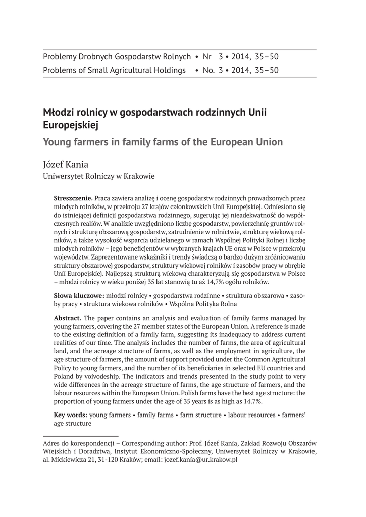 Problemy Drobnych Gospodarstw Rolnych • Nr 3 • 2014, 35–50 Problems of Small Agricultural Holdings • No. 3 • 2014, 35–50 Młodzi rolnicy w gospodarstwach rodzinnych Unii Europejskiej Young farmers in family farms of the European Union Józef Kania Uniwersytet Rolniczy w Krakowie Streszczenie. Praca zawiera analizę i ocenę gospodarstw rodzinnych prowadzonych przez młodych rolników, w przekroju 27 krajów członkowskich Unii Europejskiej. Odniesiono się do istniejącej definicji gospodarstwa rodzinnego, sugerując jej nieadekwatność do współczesnych realiów. W analizie uwzględniono liczbę gospodarstw, powierzchnię gruntów rolnych i strukturę obszarową gospodarstw, zatrudnienie w rolnictwie, strukturę wiekową rolników, a także wysokość wsparcia udzielanego w ramach Wspólnej Polityki Rolnej i liczbę młodych rolników – jego beneficjentów w wybranych krajach UE oraz w Polsce w przekroju województw. Zaprezentowane wskaźniki i trendy świadczą o bardzo dużym zróżnicowaniu struktury obszarowej gospodarstw, struktury wiekowej rolników i zasobów pracy w obrębie Unii Europejskiej. Najlepszą strukturą wiekową charakteryzują się gospodarstwa w Polsce – młodzi rolnicy w wieku poniżej 35 lat stanowią tu aż 14,7% ogółu rolników. Słowa kluczowe: młodzi rolnicy • gospodarstwa rodzinne • struktura obszarowa • zasoby pracy • struktura wiekowa rolników • Wspólna Polityka Rolna Abstract. The paper contains an analysis and evaluation of family farms managed by young farmers, covering the 27 member states of the European Union. A reference is made to the existing definition of a family farm, suggesting its inadequacy to address current realities of our time. The analysis includes the number of farms, the area of agricultural land, and the acreage structure of farms, as well as the employment in agriculture, the age structure of farmers, the amount of support provided under the Common Agricultural Policy to young farmers, and the number of its beneficiaries in selected EU countries and Poland by voivodeship. The indicators and trends presented in the study point to very wide differences in the acreage structure of farms, the age structure of farmers, and the labour resources within the European Union. Polish farms have the best age structure: the proportion of young farmers under the age of 35 years is as high as 14.7%. Key words: young farmers • family farms • farm structure • labour resources • farmers’ age structure Adres do korespondencji – Corresponding author: Prof. Józef Kania, Zakład Rozwoju Obszarów Wiejskich i Doradztwa, Instytut Ekonomiczno-Społeczny, Uniwersytet Rolniczy w Krakowie, al. Mickiewicza 21, 31-120 Kraków; email: [email protected] 36 Józef Kania Wstęp Analizując działania objęte Programem Rozwoju Obszarów Wiejskich (PROW) na lata 2007–2013, a także propozycje działań zawarte w PROW na lata 2014–2020, można śmiało stwierdzić, że Wspólna Polityka Rolna Unii Europejskiej stawia na przedsiębiorczość i innowacyjność w rolnictwie oraz aktywnie wspiera młodych rolników, zarówno tych, którzy rozpoczynają działalność rolniczą lub pozarolniczą, jak i tych, którzy modernizują i rozwijają swoje gospodarstwa (MRiRW 2007, 2013, 2014). Gospodarstwa rodzinne prowadzone przez młodych rolników (w wieku poniżej 35 lat) reprezentują ok. 9% powierzchni gruntów rolnych i ok. 9% wartości produkcji standardowej (ang. standard output; SO) w Unii Europejskiej, a odsetek ten ma tendencję rosnącą (EC 2012). Materiał i metody W pracy dokonano analizy i oceny gospodarstw rodzinnych prowadzonych przez młodych rolników, w przekroju krajów członkowskich Unii Europejskiej. Podstawowym materiałem badawczym były dane statystyczne Eurostatu uzupełnione własnymi obliczeniami oraz wynikami badań innych autorów. W analizie danych wykorzystano metodę porównawczą i opisową, a rezultaty przedstawiono w tabelach i na wykresach. Wyniki i dyskusja Gospodarstwo rodzinne Gospodarstwa rodzinne są przedmiotem specjalnej uwagi Organizacji Narodów Zjednoczonych, o czym świadczy m.in. ogłoszenie przez nią roku 2014 Międzyna rodowym Rokiem Gospodarstwa Rodzinnego. Ta forma gospodarowania dominuje w rolnictwie Unii Europejskiej. Praca właścicieli gospodarstw i członków ich rodzin stanowi 77,5% ogólnych nakładów pracy w rolnictwie UE (Eurostat 2008). Gospodarstwo rodzinne zostało zdefiniowane jako organizacja aktywności rodzinnej, w której pojedynczy rolnik jest właścicielem gospodarstwa i kontroluje wszystkie jego aktywa, w tym zwłaszcza zasoby pracy (Allen i Lueck 1998). Definicja ta wydaje się jednak zbyt restrykcyjna we współczesnych realiach, w których gospodarstwa rodzinne muszą się dostosowywać do zmiennych warunków ekonomicznych, podejmując różne rodzaje działalności pozarolniczej, zatrudniając dodatkową siłę roboczą i dodzierżawiając ziemię. Koncepcja gospodarstwa rodzinnego obejmuje podmioty różniące się typem gospodarowania, powierzchnią, wielkością produkcji, z pełnym i niepełnym zatrudnieniem ich właścicieli, z dodatkową działalnością pozarolniczą i bez takiej działalności. Niektóre z nich to wyspecjalizowane gospodarstwa towarowe, podczas gdy inne to gospodarstwa niskotowarowe prowadzące produkcję głównie na własne potrzeby. Jeszcze inne to gospodarstwa hobbistyczne, należące do rodzin, których główne dochody pochodzą spoza gospodarstwa (Davidova 2014). PDGR – PSAH Młodzi rolnicy w gospodarstwach rodzinnych Unii Europejskiej 37 Liczba, powierzchnia i struktura obszarowa gospodarstw Z danych statystycznych Eurostatu wynika, że w Unii Europejskiej (UE-27) mamy 12 014 780 gospodarstw użytkujących 172 800 tys. hektarów gruntów rolnych, które stanowią 40,3% ogólnej powierzchni gruntów w UE (Eurostat 2012). Średnia powierzchnia gospodarstwa w 2010 r. wynosiła 14,4 ha gruntów rolnych wobec 12,0 ha w 20
