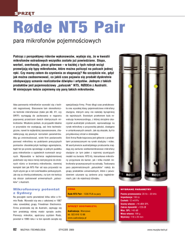 SPRzĘT Røde NT5 Pair para mikrofonów pojemnościowych Patrząc z perspektywy riderów wykonawców, wydaje się, że w kwestii mikrofonów estradowych wszystko zostało już powiedziane. Stopa, werbel, overheady, piece gitarowe – w każdej z tych rubryk wciąż przewijają się typy mikrofonów, które można policzyć na palcach jednej ręki. Czy mamy zatem do czynienia ze stagnacją? Na szczęście nie, gdyż jak można zaobserwować, co jakiś czas pojawia się produkt dyskretnie zdobywający uznanie realizatorów dźwięku i artystów. Jednym z takich produktów jest pojemnościowy „paluszek” NT5, RØDEm z Australii. W niniejszym teście zajmiemy się parą takich mikrofonów. Idea parowania mikrofonów wywodzi się z tech- specjalizacja firmy. Przez długi czas produkowa- niki nagraniowej. Stosowane tam stereofonicz- ła ona wysokiej klasy pojemnościowe mikrofony ne techniki mikrofonowe (takie jak AB, XY, czy studyjne, których ceny nie należały bynajmniej ORTF) wymagają do zachowania w nagraniu do najniższych. Swoistym przełomem była re- poprawnej przestrzeni dwóch identycznych mi- wolucja homerecordingu, z której skrzętnie sko- krofonów. Wiadomo jednak, że przypadki idealne rzystał australijski producent, wprowadzając na w przyrodzie nie występują, zaś linie technolo- rynek mikrofony o przyzwoitej jakości, dostępne giczne, nawet te najbardziej zaawansowane, cha- w umiarkowanych cenach. Jak się okazało, był to rakteryzują się pewnym rozrzutem parametrów. przysłowiowy strzał w dziesiątke. Aby go zminimalizować, wiele firm postanowiło Dziś firma Rode kojarzona jest głównie z produk- parować mikrofony na podstawie precyzyjnych tami przeznaczonymi na rynek studyjny i video. pomiarów charakterystyk każdego egzemplarza, W asortymencie australijskiego producenta znaj- bądź też po prostu sprzedając w jednym pudełku dują się zarówno wielkomembranowe mikrofony parę mikrofonów o sąsiednich numerach seryj- studyjne (w tym jeden z najmniej szumiących nych. Wprawdzie w technice nagłośnieniowej modeli na świecie: NT2-A), kierunkowe mikrofo- podchodzi się nieco mniej restrykcyjnie do drob- ny przypinane do kamer, jak i kilka modeli mi- nych różnic w brzmieniu mikrofonów, niemniej krofonów przeznaczonych na estradę. Testowana komplet taki jak NT5 Pair od razu przywodzi na para pojemnościowych „paluszków” należy do myśl użycie go w roli overheadów perkusyjnych. grupy produktów uniwersalnych, które z powo- Jak się za chwilę przekonamy, na tym nie kończy dzeniem używane są zarówno przy nagłośnie- się obszar zastosowań uniwersalnych „palusz- niach, jak i do rejestracji dźwięku. ków” z Australii. Mikrofonowy potentat z Sydney CENA wybrane parametry Røde NT5 Pair - 1330 PLN za parę Pasmo przenoszenia: 20 Hz – 20 kHz Impedancja: 100 Ω Czułość: 12 mV/Pa Szumy własne: <16 dBA SPL Zakres dynamiki: >128 dB Max. SPL: 143 dB Masa własna: 100 g Wymiary: 118 x 20 mm Na początek warto powiedzieć kilka słów o firmie Rode. Wywodzi się ona z założonej w 1967 roku szwedzkiej grupy Frieedman Electronics. Firma przeniosła się do Australii, zajmując się sprzęt dostarczył tam produkcją różnej maści sprzętu audio. Audiostacja, Warszawa Pierwszy mikrofon, opatrzony szyldem Rode, tel. 022 616 13 86 powstał w 1990 roku i w ten sposób zaczęła się 82 muzyka i technologia www.audiostacja.pl styczeń 2009 www.muzyka-tech.pl mikrofony pojemnościowe Opis mikrofonu Do testów dostarczony został zestaw składający się z dwóch mikrofonów NT5, które sparowano pod względem zgodności parametrów i umieszczono, wraz z akcesoriami, we wspólnej walizce. NT5 to pojemnościowy „paluszek” o kardioidalnej charakterystyce kierunkowej, zamknięty w bardzo kompaktowej obudowie, mierzącej niespełna 12 cm długości. Jej wykończenie stanowi nikiel o kolorze satyny, a dodatkowego smaczku nadają wygrawerowane logo producenta oraz nazwa mikrofonu, pomiędzy którymi umieszczono charakterystyczne kółeczko koloru złotego. Dołączone do kompletu uchwyty są dość ciasne i nie zapewniają zadowalającej izolacji mechanicznej mikrofonów od statywu i podłoża, zatem warto W komplecie z mikrofonami Rode NT5 użytkownik otrzymuje uchwyty z reduktorami gwintu oraz osłony przeciwwietrzne. zaopatrzyć się w opcjonalne elastyczne uchwyty (takie jak SM3 lub SM4). Skoro już przy akcesoriach jesteśmy, to wypada jeszcze wspomnieć o dostarczanych z mikrofonami osłonach prze- załączanego filtru ani tłumika. Fakt, są to pewne in Australia”, wygrawerowano numer seryjny ciwwietrznych – jak znalazł przy imprezach ple- oszczędności, ale chwała producentowi za to, że mikrofonu. W testowanej parze mikrofony mia- nerowych. pozostawił użytkownikowi możliwość wyboru ły nieodległe numery: 090627 i 090654, zatem Czas wgłębić się w bardziej techniczne szczegó- opcji nieprzepłacania za coś, czego i tak nie uży- można przypuszczać, że parowanie dokonywane ły. Zastosowana w NT5 pozłacana kapsuła ma je. Droższy NT-55 pozwala dodatkowo wymienić było na podstawie porównywania egzemplarzy średnicę ½’’ i wymaga do spolaryzowania dostar- kapsułę na dookólną, ale taka opcja raczej nie bę- z danej partii. czonego z zewnątrz napięcia. Mamy tu zatem do dzie przydatna w realiach estradowych. Wróćmy czynienia z „pojemnością” sensu stricte, w od- jednak do NT-5. Wewnętrzne układy konwertera różnieniu od mikrofonów elektretowych, które impedancji zbudowano w oparciu o tranzystory Podłączamy i słuchamy są polaryzowane mechanicznie. Kapsułę w razie J-FET, zaś w stopniu wyjściowym, odpowiedzial- Testy potrzeby można łatwo zdemontować poprzez nym za symetryzację sygnału, pracują tranzysto- w warunkach „bojowych”, w kilku sytuacjach odkręcenie. Ułatwia to m.in. jej przedmuchanie ry bipolarne. Gniazdo przyłączeniowe posiada angażujących pełne nagłośnienie (z 