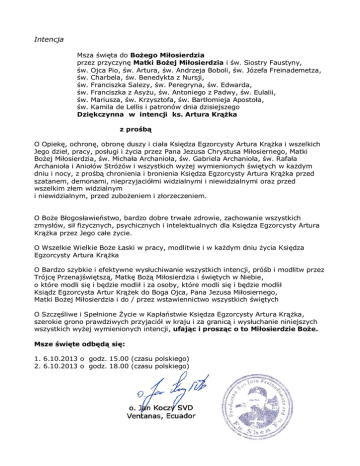 Intencja Msza święta do Bożego Miłosierdzia przez przyczynę Matki Bożej Miłosierdzia i św. Siostry Faustyny, św. Ojca Pio, św. Artura, św. Andrzeja Boboli, św. Józefa Freinademetza, św. Charbela, św. Benedykta z Nursji, św. Franciszka Salezy, św. Peregryna, św. Edwarda, św. Franciszka z Asyżu, św. Antoniego z Padwy, św. Eulalii, św. Mariusza, św. Krzysztofa, św. Bartłomieja Apostoła, św. Kamila de Lellis i patronów dnia dzisiejszego Dziękczynna w intencji ks. Artura Krążka z prośbą O Opiekę, ochronę, obronę duszy i ciała Księdza Egzorcysty Artura Krążka i wszelkich Jego dzieł, pracy, posługi i życia przez Pana Jezusa Chrystusa Miłosiernego, Matki Bożej Miłosierdzia, św. Michała Archanioła, św. Gabriela Archanioła, św. Rafała Archanioła i Aniołów Stróżów i wszystkich wyżej wymienionych świętych w każdym dniu i nocy, z prośbą chronienia i bronienia Księdza Egzorcysty Artura Krążka przed szatanem, demonami, nieprzyjaciółmi widzialnymi i niewidzialnymi oraz przed wszelkim złem widzialnym i niewidzialnym, przed zubożeniem i złorzeczeniem. O Boże Błogosławieństwo, bardzo dobre trwałe zdrowie, zachowanie wszystkich zmysłów, sił fizycznych, psychicznych i intelektualnych dla Księdza Egzorcysty Artura Krążka przez Jego całe życie. O Wszelkie Wielkie Boże Łaski w pracy, modlitwie i w każdym dniu życia Księdza Egzorcysty Artura Krążka O Bardzo szybkie i efektywne wysłuchiwanie wszystkich intencji, próśb i modlitw przez Trójcę Przenajświętszą, Matkę Bożą Miłosierdzia i świętych w Niebie, o które modli się i będzie modlił i za osoby, które modli się i będzie modlił Ksiądz Egzorcysta Artur Krążek do Boga Ojca, Pana Jezusa Miłosiernego, Matki Bożej Miłosierdzia i do / przez wstawiennictwo wszystkich świętych O Szczęśliwe i Spełnione Życie w Kapłaństwie Księdza Egzorcysty Artura Krążka, szerokie grono prawdziwych przyjaciół w kraju i za granicą i wysłuchanie niniejszych wszystkich wyżej wymienionych intencji, ufając i prosząc o to Miłosierdzie Boże. Msze święte odbędą się: 1. 6.10.2013 o godz. 15.00 (czasu polskiego) 2. 6.10.2013 o godz. 18.00 (czasu polskiego)