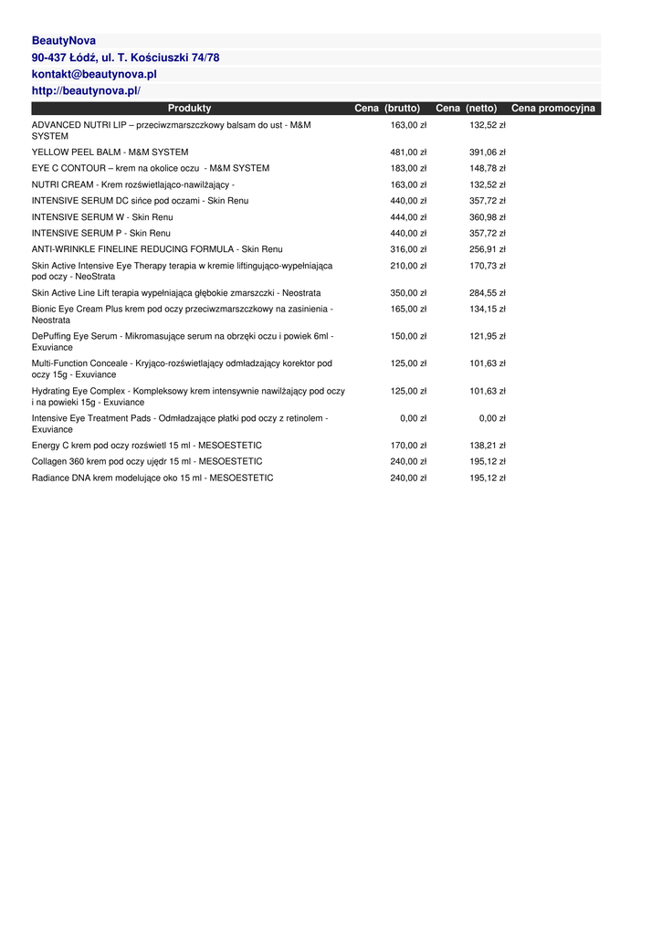 BeautyNova 90-437 Łódź, ul. T. Kościuszki 74/78 [email protected] http://beautynova.pl/ Produkty Cena (brutto) Cena (netto) ADVANCED NUTRI LIP – przeciwzmarszczkowy balsam do ust - M&M SYSTEM 163,00 zł 132,52 zł YELLOW PEEL BALM - M&M SYSTEM 481,00 zł 391,06 zł EYE C CONTOUR – krem na okolice oczu - M&M SYSTEM 183,00 zł 148,78 zł NUTRI CREAM - Krem rozświetlająco-nawilżający - 163,00 zł 132,52 zł INTENSIVE SERUM DC sińce pod oczami - Skin Renu 440,00 zł 357,72 zł INTENSIVE SERUM W - Skin Renu 444,00 zł 360,98 zł INTENSIVE SERUM P - Skin Renu 440,00 zł 357,72 zł ANTI-WRINKLE FINELINE REDUCING FORMULA - Skin Renu 316,00 zł 256,91 zł Skin Active Intensive Eye Therapy terapia w kremie liftingująco-wypełniająca pod oczy - NeoStrata 210,00 zł 170,73 zł Skin Active Line Lift terapia wypełniająca głębokie zmarszczki - Neostrata 350,00 zł 284,55 zł Bionic Eye Cream Plus krem pod oczy przeciwzmarszczkowy na zasinienia Neostrata 165,00 zł 134,15 zł DePuffing Eye Serum - Mikromasujące serum na obrzęki oczu i powiek 6ml Exuviance 150,00 zł 121,95 zł Multi-Function Conceale - Kryjąco-rozświetlający odmładzający korektor pod oczy 15g - Exuviance 125,00 zł 101,63 zł Hydrating Eye Complex - Kompleksowy krem intensywnie nawilżający pod oczy i na powieki 15g - Exuviance 125,00 zł 101,63 zł 0,00 zł 0,00 zł Energy C krem pod oczy rozświetl 15 ml - MESOESTETIC 170,00 zł 138,21 zł Collagen 360 krem pod oczy ujędr 15 ml - MESOESTETIC 240,00 zł 195,12 zł Radiance DNA krem modelujące oko 15 ml - MESOESTETIC 240,00 zł 195,12 zł Intensive Eye Treatment Pads - Odmładzające płatki pod oczy z retinolem Exuviance Cena promocyjna
