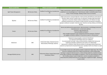 Nazwa przedmiotu Firma prowadząca Miejsce prowadzenia zajęć Opis Agile Project Management ING Services Polska Siedziba firmy (Katowice, Konduktorska 35) Dzięki uczestnictwie w zajęciach zapoznasz się ze zwinnym podejściem do zarządzania projektami oraz metodologią Scrum. Hasła kluczowe: Agile vs waterfall project; Scrum master, Product Manager, Backlog; Kanban and scrum boards; ING Services Polska Dzięki zastosowaniu rozwiązań Big Data możemy łatwiej identyfikować potencjalnych klientów, lepiej rozumieć reakcję rynku czy wykrywać istniejące bądź potencjalne Siedziba firmy (Katowice, Konduktorska zagrożenia w przyszłości (dzięki analityce predyktywnej). Jeśli dołożymy do tego 35) możliwość przetwarzania tych danych w trybie niemalże rzeczywistym uzyskujemy potężne analityczne narzędzie. Hasła kluczowe: Machine Learning, Hadoop, architektura Big Data Big Data Docker Mainframe Managed Mobility Services ING Services Polska IBM IBM Siedziba firmy (Katowice, Konduktorska 35) Docker jest platformą dla programistów i administratorów, umożliwiającą tworzenie, dystrybuowanie i uruchamianie aplikacji. Uczestnicy zajęć dowiedzą się: - Czym jest platforma Docker? - Jakie narzędzia stosowane są do zarządzaniem klastrami opartymi o Dockera? Jak wygląda architektura aplikacji i infrastruktury oparta o mikroserwisy? Politechnika Śląska, Wydział Inżynierii Materiałowej i Metalurgii, Katowice Rozpocznij swoją przygodę z systemami Mainframe! Czy najnowsza technologia zawsze jest najlepsza? Czy zastanawiałeś się kiedyś robiąc przelew bankowy, kupując bilet lotniczy lub wyplacając pieniądze z bankomatu jaki system za to odpowiada? Zapraszamy na szkolenie, dzieki któremu dowiesz się dlaczego systemy Mainframe używane są nieprzerwanie od ponad 50 lat przez największe banki oraz fabryki na calym Świecie. Czy chciałbyś nauczyć się w jaki sposób zarządzać urządzeniami Apple (typu: Mac, iPad, iPhone) w srodowisku dużej firmy? Dołącz do przedmiotu w pełni praktycznego opartego na zajęciach laboratoryjnych, w trakcie którego będziemy wspólnie kreować Politechnika Śląska, Wydział Matematyki od początku środowisko wspomagające zarządzanie i uczyć się w jaki sposób go używać. Stosowanej, Gliwice Jeśli chciałbyś połączyć swoje umiejętności z zakresu zarządzania projektami z infrastrukturalną wiedzą techniczną oraz zarządzaniem urządzeniami Apple - pokażemy ci jak to zrobić! Middleware (IBM WebSphere/Oracle Weblogic/Redhat Jboss) Programowanie Project Management Service Management IBM Politechnika Śląska, Wydział Automatyki Elektorniki i Informatyki, Gliwice Middleware to software, który pozwala na polączenie odseparowanych, skomplikowanych i uprzednio istniejących programów oraz systemów. Niektóre z komponentów oprogramowania, które są również łączone za pomocą middleware'u to aplikacje klasy Enterprise lub WebServices. Najważniejsze tematy poruszane w ramach przedmiotu: # Co oznacza, ze coś jest Middleware'em? # Definicje i wyróżniki Middelware; # W jaki sposób Middleware jest uzywany w codziennej pracy? # Integracja Middleware z aplikacjami prostymi jak i skomplikowanymi; # Zalety zastosowań Middleware. ING Services Polska Siedziba firmy (Katowice, Konduktorska 35) Zajęcia skierowanie do przyszłych programistów lub inżynierów testów automatycznych. Dzięki uczestnictwie w zajęciach dowiesz się w jaki sposób pracuje się w zespole typu SofwareHouse. Hasła kluczowe: DevOps, .Net, C#, ASP, Frontend development, CQS i CQRS – wprowadzenie, Continuous Delivery/Contiuous Integration Uniwersytet Ekonomiczny, Katowice Kurs będzie obejmował najważniejsze zagadnienia metodyk Zarządzania Projektami oraz podejścia PM najcześciej stosowane projektach IT. Materiał będzie przedstawiany zarównio z punktu widzenia (w zgodzie z) PMI (PMBoK), jak również zostaną uwzględnione specyficzne dla IBM dobre praktyki z zakresu PM, które zostały wypracowane wewnętrznie w IBM i są z powodzeniem stosowane w projektach wspierających klientów IBM. Kluczowe aspekty : - Innowacyjność; - Wyzwania spotykane w nowych projektach; - Współpraca z najlepszymi specjalistami IT na całym Świecie. Uniwersytet Śląski w Katowicach Przedmiot zawiera zagadnienia dotyczące procesów ITIL oraz podstwowych pojęć związanych z dostarczaniem usług. W jego zakres wchodzą również: zrozumienie procesów biznesowych, ich towrzenia oraz implementacji. Elementy teorii CMMI oraz Lean six sigma będą również zawarte w kursie, tak aby studenci znali metody dostarczania usług oraz posiadali wiedzę, w jaki spsoób dostarczana jest usługa nie tylko z perspektywy IT ale z różnych punktów widzenia odnoszących się do innych rodzajów działalności. IBM IBM Serwery Aplikacyjne Sieci komputerowe Storage (Storage Area Network (SAN)/ Network Attached Storage (NAS)) Testowanie zabezpieczeń IT ING Services Polska ING Services Polska IBM ING Services Polska Siedziba firmy (Katowice, Konduktorska 35) Wprowadzenie do zarządzania serwerami aplikacyjnymi. Uczęszczając na zajęcia z zakresu Serwerów Aplikacyjnych dowiesz się jaka jest zasada działania współczesnych aplikacji. Siedziba firmy (Katowice, Konduktorska 35) Budowa sieci wysokodostępnych w oparciu o najnowsze technologie sieciowe. Celem wykładów będzie zapoznanie przyszłych inżynierów sieciowych z budową sieci komputerowych w Data Centre. Hasła kluczowe: budowa połączeń pomiędzy różnymi urządzeniami sieciowymi; rodzaje technologii sieciowych i urządzeń; problem dostępności w sieciach komputerowych Kurs zawiera opis Storage jako usługi, różnic pomiędzy Storage Area Network i Network Attached System oraz opis wyzwań stojących przed zastowawaniami Storage w najbliższych latach. Zagadnienia zawarte w ramach kursu: Politechnika Śląska, Wydział Automatyki # Co to jest "Storage"? Elektorniki i Informatyki, Gliwic