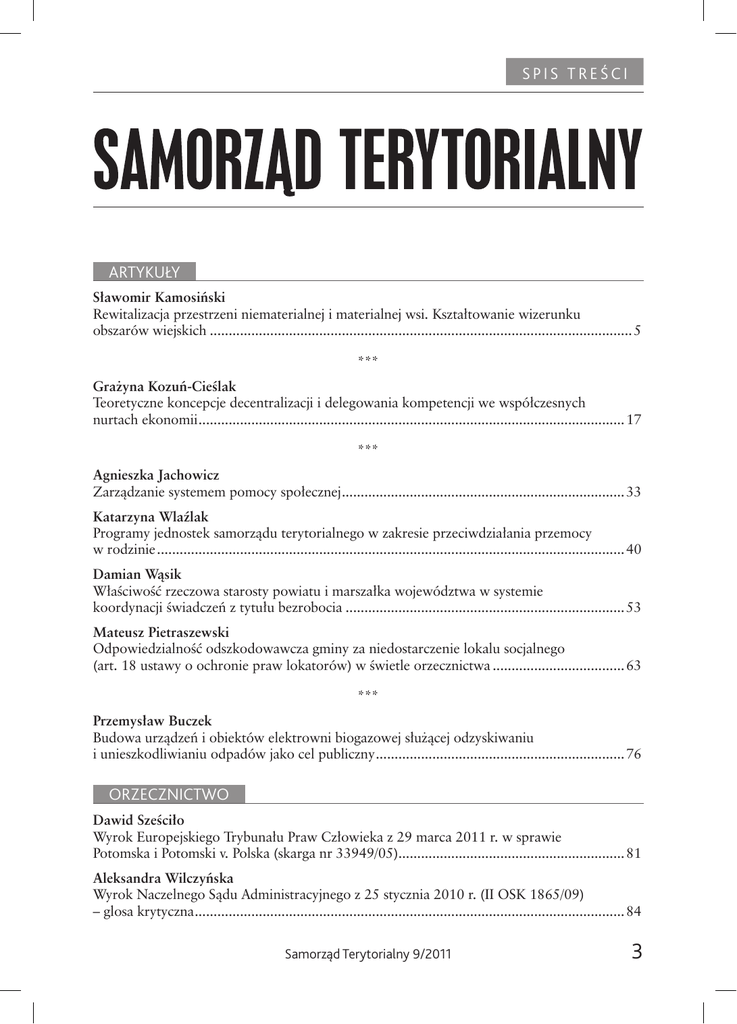 SPIS TREŚCI ARTYKUŁY Sławomir Kamosiński Rewitalizacja przestrzeni niematerialnej i materialnej wsi. Kształtowanie wizerunku obszarów wiejskich ................................................................................................................ 5 *** Grażyna Kozuń-Cieślak Teoretyczne koncepcje decentralizacji i delegowania kompetencji we współczesnych nurtach ekonomii ................................................................................................................. 17 *** Agnieszka Jachowicz Zarządzanie systemem pomocy społecznej ........................................................................... 33 Katarzyna Wlaźlak Programy jednostek samorządu terytorialnego w zakresie przeciwdziałania przemocy w rodzinie ............................................................................................................................ 40 Damian Wąsik Właściwość rzeczowa starosty powiatu i marszałka województwa w systemie koordynacji świadczeń z tytułu bezrobocia .......................................................................... 53 Mateusz Pietraszewski Odpowiedzialność odszkodowawcza gminy za niedostarczenie lokalu socjalnego (art. 18 ustawy o ochronie praw lokatorów) w świetle orzecznictwa ................................... 63 *** Przemysław Buczek Budowa urządzeń i obiektów elektrowni biogazowej służącej odzyskiwaniu i unieszkodliwianiu odpadów jako cel publiczny .................................................................. 76 ORZECZNICTWO Dawid Sześciło Wyrok Europejskiego Trybunału Praw Człowieka z 29 marca 2011 r. w sprawie Potomska i Potomski v. Polska (skarga nr 33949/05)............................................................ 81 Aleksandra Wilczyńska Wyrok Naczelnego Sądu Administracyjnego z 25 stycznia 2010 r. (II OSK 1865/09) – glosa krytyczna .................................................................................................................. 84 Samorząd Terytorialny 9/2011 3 SPIS TREŚCI PRZEGLĄD PIŚMIENNICTWA Opracowała Justyna Przedańska .......................................................................................... 90 *** Table of Contents & Abstracts ............................................................................................ 93 WARUNKI PRZYJMOWANIA TEKSTÓW DO DRUKU Redakcja przyjmuje teksty oryginalne o objętości 30–50 tys. znaków, z wyraźnie zaznaczonym tytułem, podziałem na podrozdziały, podsumowaniem, przypisami, krótką notką o autorze oraz adresem e-mailowym. Materiały większe lub mniejsze albo już publikowane wymagają osobnej zgody Redaktora Naczelnego. Wymagania co do wielkości tekstu nie dotyczą polemik, glos, sprawozdań, recenzji itp. Tekst należy również zaopatrzyć w abstrakt w języku polskim, o objętości nie większej niż 500 znaków. Autor może zaproponować tłumaczenie na język angielski tytułu tekstu oraz abstraktu, a także podać adres e-mailowy w celu publikacji. Przypisy powinny być opracowane w tradycyjny sposób – na dole strony. Dopuszczalny jest również wykaz wykorzystanej w tekście literatury. Materiały wraz z danymi autora (stanowisko, adres, numer telefonu) i ewentualnym listem polecającym prosimy przysyłać pocztą elektroniczną lub zwykłą, z załączoną płytą CD. Przekazując tekst do redakcji, autor przenosi na Wydawcę wyłączne prawo do jego publikacji. Nie drukujemy artykułów o charakterze opisowym, pozbawionych aspektu badawczego lub nowych treści interesujących poznawczo. Autor ponosi odpowiedzialność za aktualny stan prawny, orzecznictwa i doktryny. Redakcja zastrzega sobie prawo skracania tekstów, zmiany tytułów, śródtytułów oraz poprawek merytorycznych i stylistycznych, również w wersji angielskiej. Materiałów niezamówionych nie zwracamy. Warunkiem publikacji tekstu jest odesłanie uprzednio podpisanej umowy z Wydawnictwem. Redakcja 4 Samorząd Terytorialny 9/2011 TA B L E O F C O N T E N T S & A B S T R A C T S Territorial Self-Government Scientific and Professional Monthly ARTICLES Sławomir Kamosiński Revitalization of intangible and tangible rural space. Shaping the image of rural areas ....................... 5 The article raises the issue of rural area revitalization which is of importance from the point of view of territorial marketing of rural areas. The concept of revitalization of intangible rural space is linked back to individual cultural features of the village, its customs and local history. In addition to rural renewal programmes, revitalization of tangible rural space is related to the restoration and presentation of traditional rural buildings. The author also refers the term to the implementation of the fashion for organic farms, which discount the benefits of rural backwardness, and to presenting rural areas to potential customers through websites and coats of arms embedded in their traditions. *** Grażyna Kozuń-Cieślak Theoretical concepts of decentralization and delegation of competencies in modern trends in economics ........................................................................................................................................................17 The article describes the concepts related to the role and competencies of the state and territorial self-government, which - for reasons of efficiency, responsibility, management capacity and autonomy of decision making – provide arguments in support of the decentralization of public tasks. The authoress suggests two approaches: new institutional economics, referring to the inefficiency of the state and concentration on institutional solutions, as well as fiscal federalism and new public management, which are centred around the issue of the fallibility of markets, as well as the efficient and equitable supply of public goods. *** Agnieszka Jachowicz Modernisation of social welfare systems ......................................................